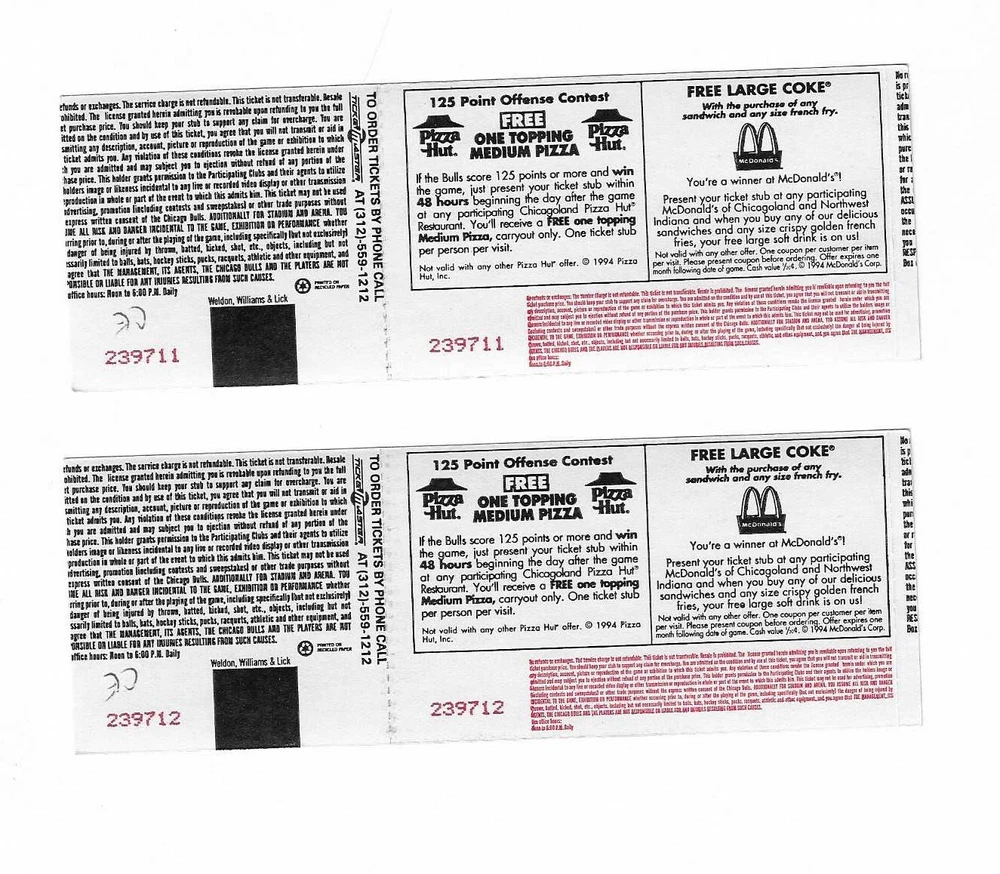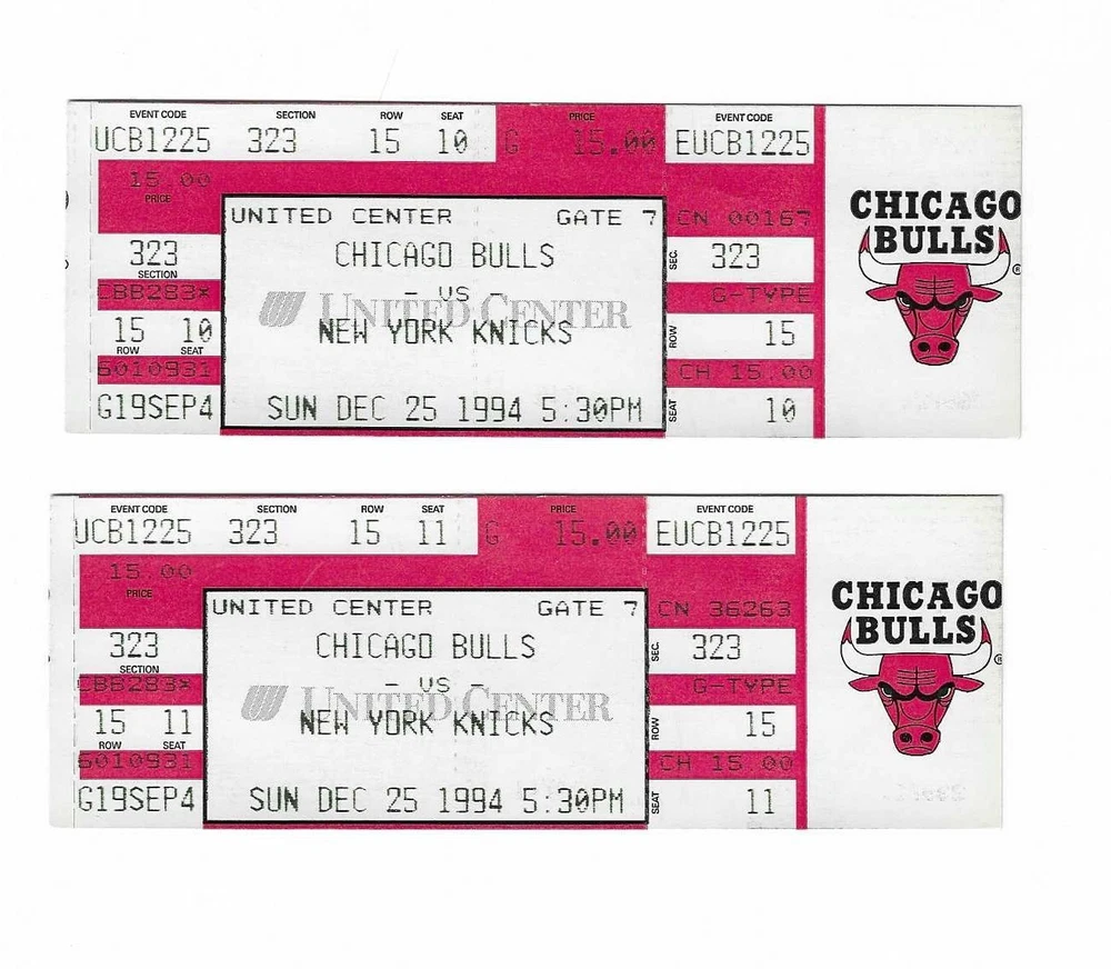 Chicago Bulls vs New York Knicks Unused Basketball Tickets From December 25, 1994 Here are 2 unused Chicago Bulls vs New York Knicks Basketball Tickets from December 25, 1994. The game took place at The United Center in Chicago, Illinois. The tickets are in good condition and would make an excellent addition to your collection. Payment Payment is due within 24 hours of sale. Shipping Your item will be shipped within 24 hours of receipt of payment via US Mail.