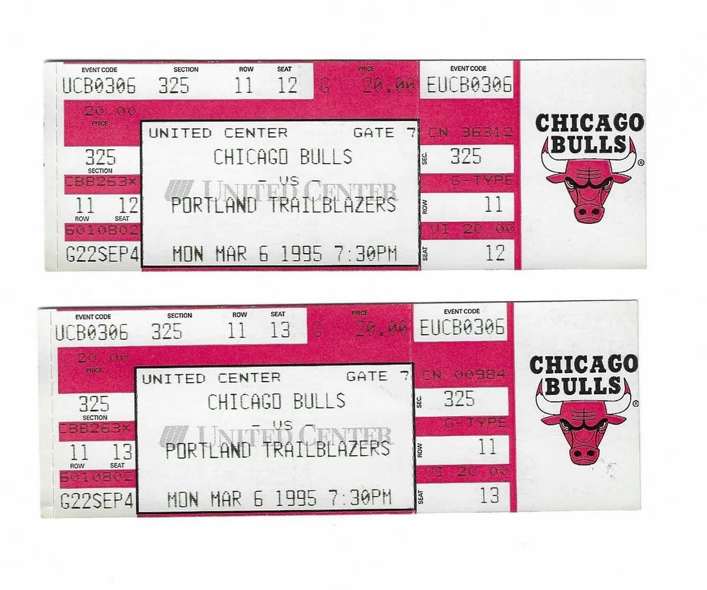 Chicago Bulls vs Portland Trailblazers Unused Basketball Tickets From March 6, 1995 Here are 2 unused Chicago Bulls vs Portland Trailblazers Basketball Tickets from March 6, 1995. The game took place at The United Center in Chicago, Illinois. The tickets are in good condition and would make an excellent addition to your collection. Payment Payment is due within 24 hours of sale. Shipping Your item will be shipped within 24 hours of receipt of payment via US Mail. Terms and Conditions All Sales are final. No Refunds