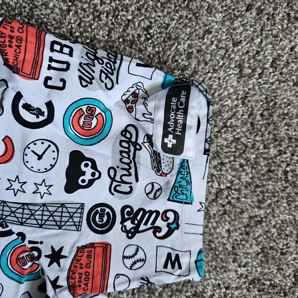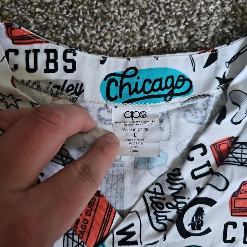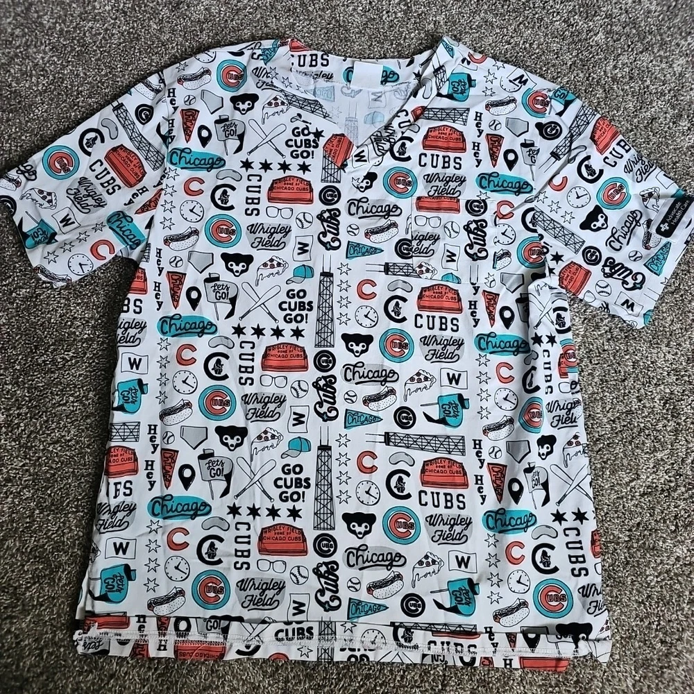 Very good condition like new with no holes and no stains. Show off your love for the Chicago Cubs with this stylish and comfortable white medical scrub top. Featuring a patterned design and made from high-quality cotton material, this top is perfect for any medical professional who wants to add a touch of fun to their work wardrobe. The short sleeves provide ample coverage, and the unisex design makes it suitable for anyone to wear. Whether you're working at Wrigley Field or just want to show your support for the team, this top is a must-have. With its classic design and durable construction, this APC brand scrub top is perfect for any medical professional who wants to make a statement. The top is available in size L and is suitable for both men and women. So why wait? Add this fun and stylish top to your work wardrobe today and show off your love for the Chicago Cubs! PTP - 21" STH - 26.5"