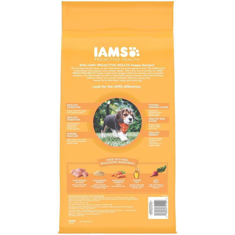 Make mealtime nutritious and delicious for your puppy with Iams Proactive Health Smart Puppy Dry Dog Food with Real Chicken. Packed with flavor and rich with 22 key nutrients like those found in mother’s milk, this recipe is made with real chicken and contains high quality protein to support muscle growth. Iams Proactive Health puppy food also contains Omega-3 DHA for smarter, more trainable puppies. Help keep your puppy healthy, happy, and playful for life with tailored nutrition from Iams puppy food. Complete and Balanced: 100% complete & balanced puppy food with 0% fillers Brain Cognition: Contains omega-3 DHA for smarter, more trainable puppies Supports Growth: With high-quality protein, this product supports growing muscles Supports Immune System: Enriched with antioxidants to support immune system development Key Nutrients: Iams Proactive Health Smart Puppy contains 22 key nutrients like those found in mother’s milk 7 lb. Bag: Contains one (1) 7 lb. bag of Iams Proactive Health Smart Puppy Dry Dog Food with Real Chicken