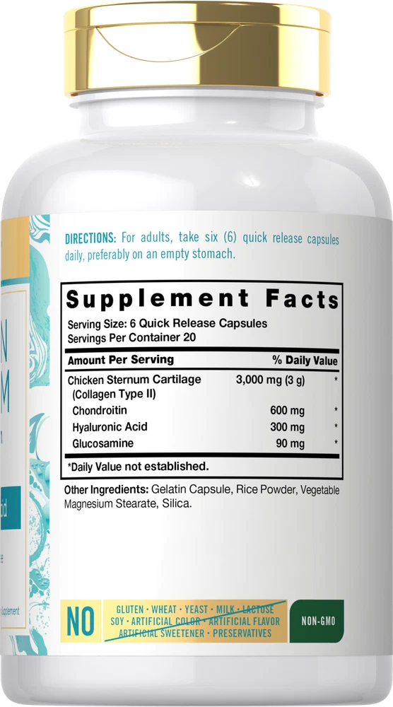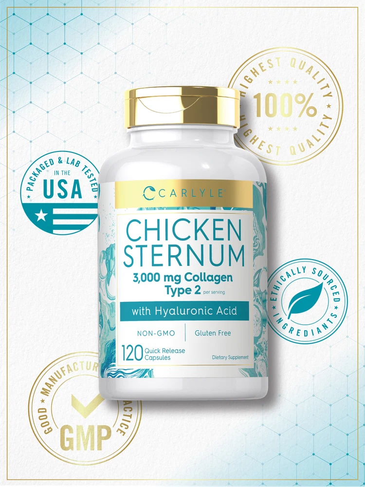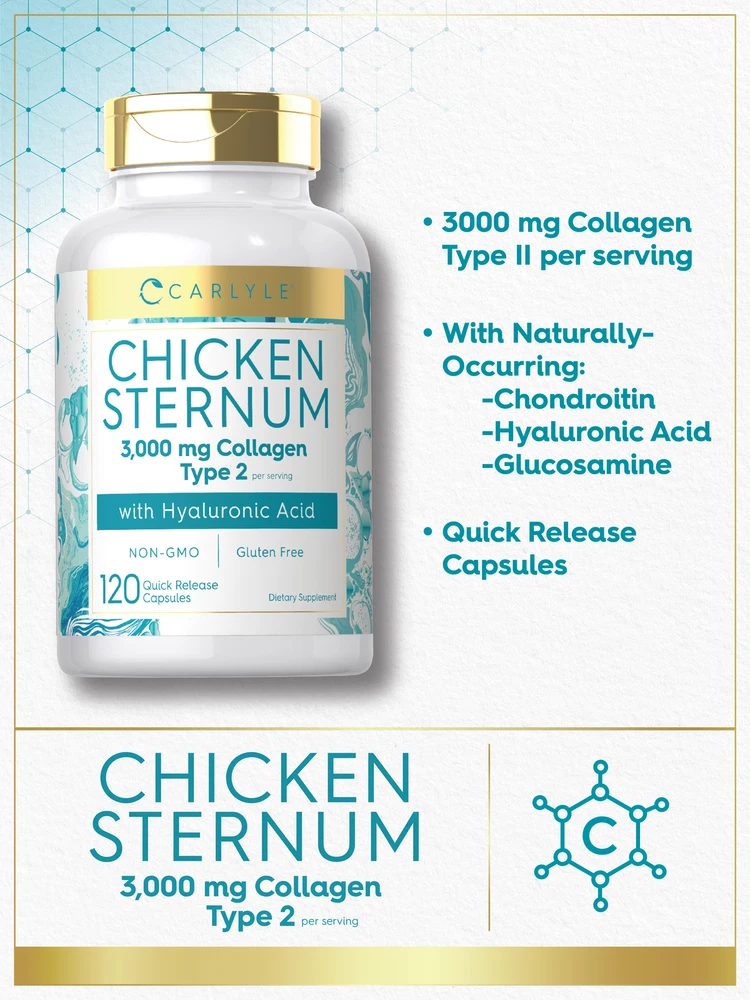 Supplementing with Collagen: Collagen continues to be the number one trend in nutrition and is the most abundant protein. With a strong presence throughout the body, it has quickly become a favorite ingredient for men and women. Traditionally found in topical products, Collagen can also be enjoyed in supplements like powder, liquid, and now convenient capsules! Carlyle Chicken Sternum Collagen: Adding Collagen to your daily nutrition plan is easy with Carlyle Chicken Sternum Collagen. This innovative source of Collagen provides 3,000 mg of Type 2 Collagen per serving with Hyaluronic Acid, Glucosamine, and Chondroitin, all in quick-release capsules. Upgrade your wellness routine with this trusted source of Collagen today! Rooted in Wellness: Our expertise in sourcing the purest ingredients combined with advanced technologies makes us proud to deliver premium, honest supplements at the best value. Carlyle Chicken Sternum Collagen is a testament to our commitment to excellence, made with powerful ingredients rooted in wellness. Thanks for choosing us in your pursuit of living healthy