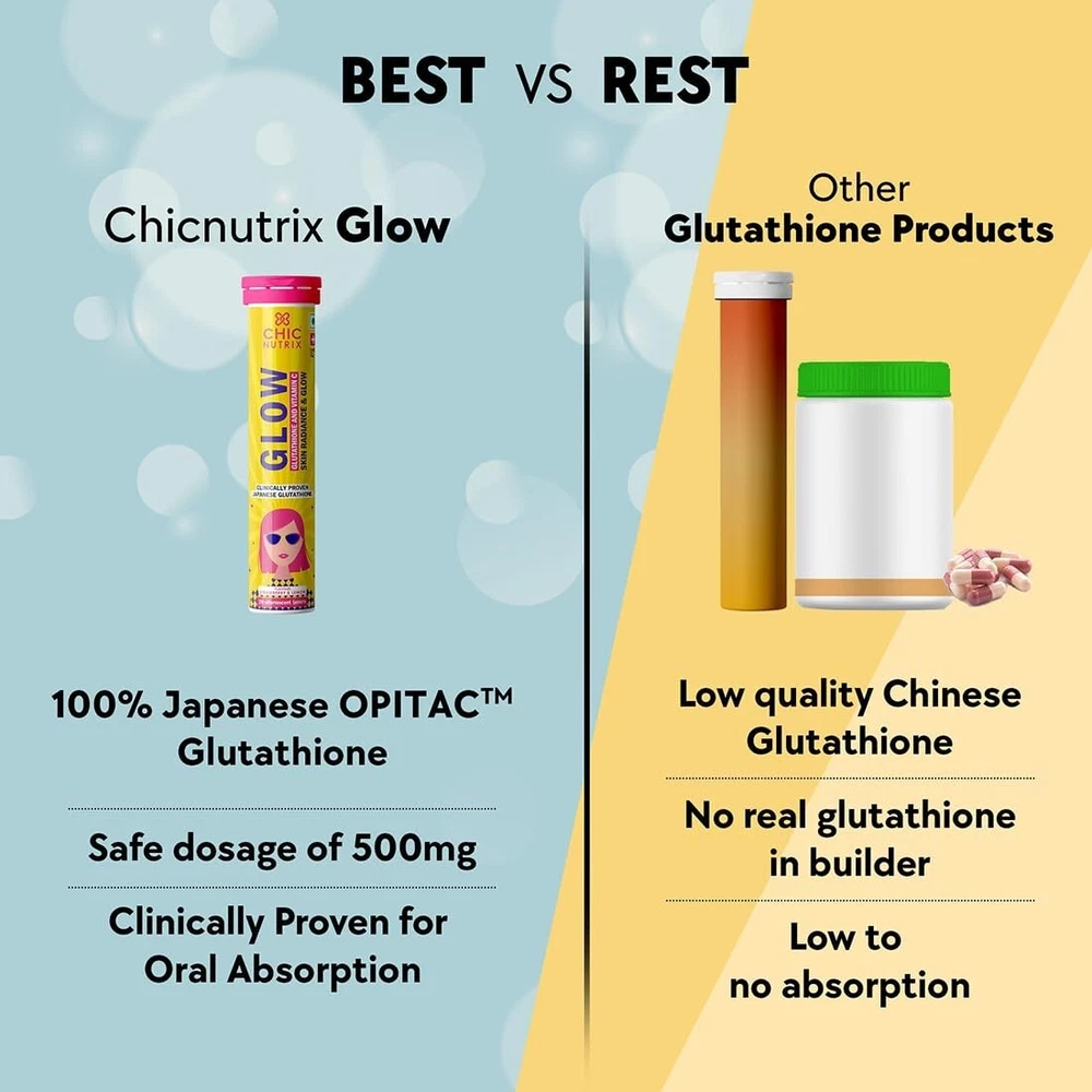 About this item Chicnutrix Glow is a supplement that prevents skin dullness and boosts skin glow and radiance. It is made with Swiss Effervescent technology and is dermatologist approved. It contains Japanese Opitac Glutathione with vitamin c which helps achieve healthy, glowing and radiant skin. Glutathione is a powerful antioxidant which combats free radicals and prevents oxidative stress. Glutathione inhibits tyrosine activity which reduces the production of eumelanin and promotes the pheomelanin production. Thereby, promoting even-toned skin, glow and radiance. Vitamin C is a water-soluble vitamin and a strong antioxidant. It helps the body in absorption of Glutathione. It works in synergy with Glutathione and provides a strong antioxidant support to neutralize the free radicals. Oral absorption of L Glutathione tablets has been an issue with most supplements, however, Japanese Opitac Glutathione in Chicnutrix Glow is clinically proven to be absorbed by the body even when consumed orally. Product Description Click to play video Previous page Next page Previous page Next page Previous page Next page