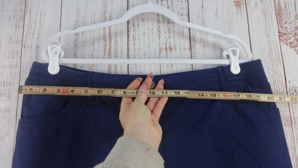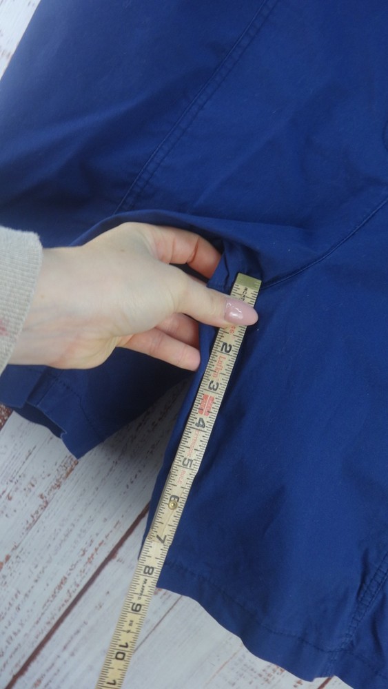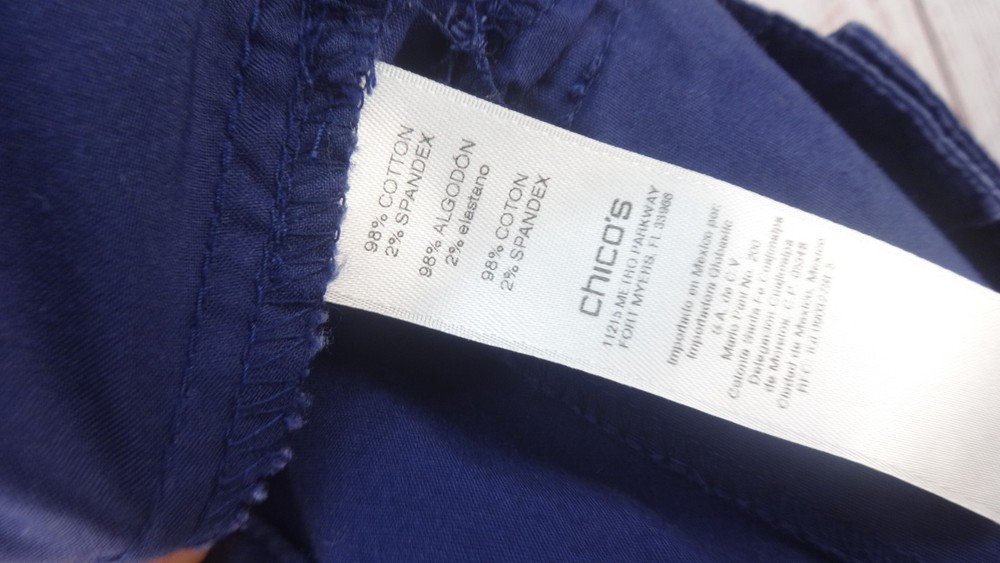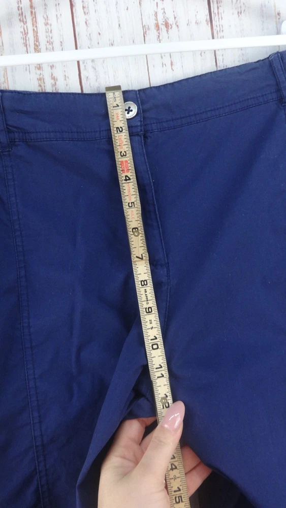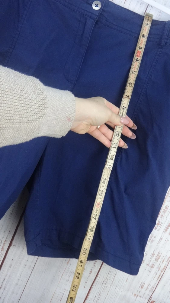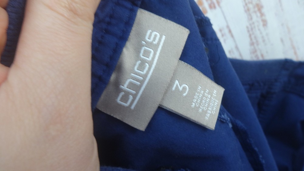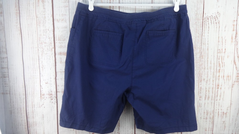 These Bermuda shorts from Chico's are a stylish and comfortable choice for women size 3 (34) in a casual blue color. Made from a cotton blend fabric with a comfortable mid rise, these shorts feature a button closure and a flat front design. The 11-inch inseam and slash pockets make them practical for everyday wear, while the classic pattern and light fabric wash add a timeless touch to the wardrobe staple. Perfect for summer, fall, and spring seasons, these Bermuda shorts offer both style and comfort for casual outings or walking activities.