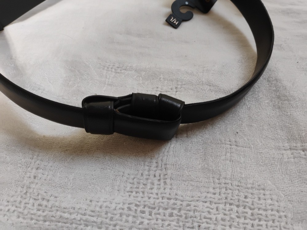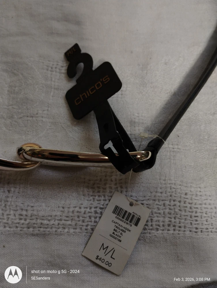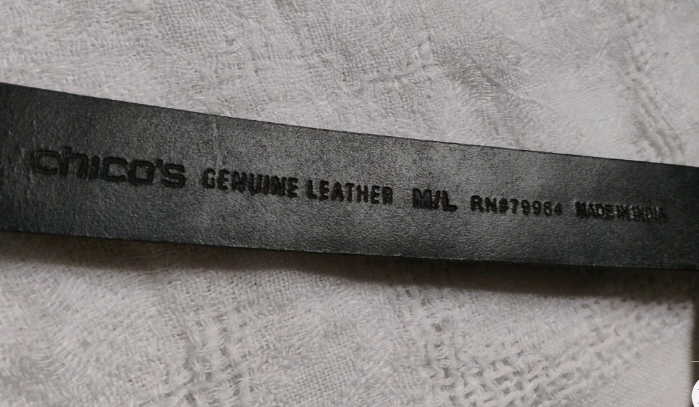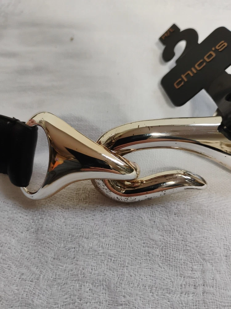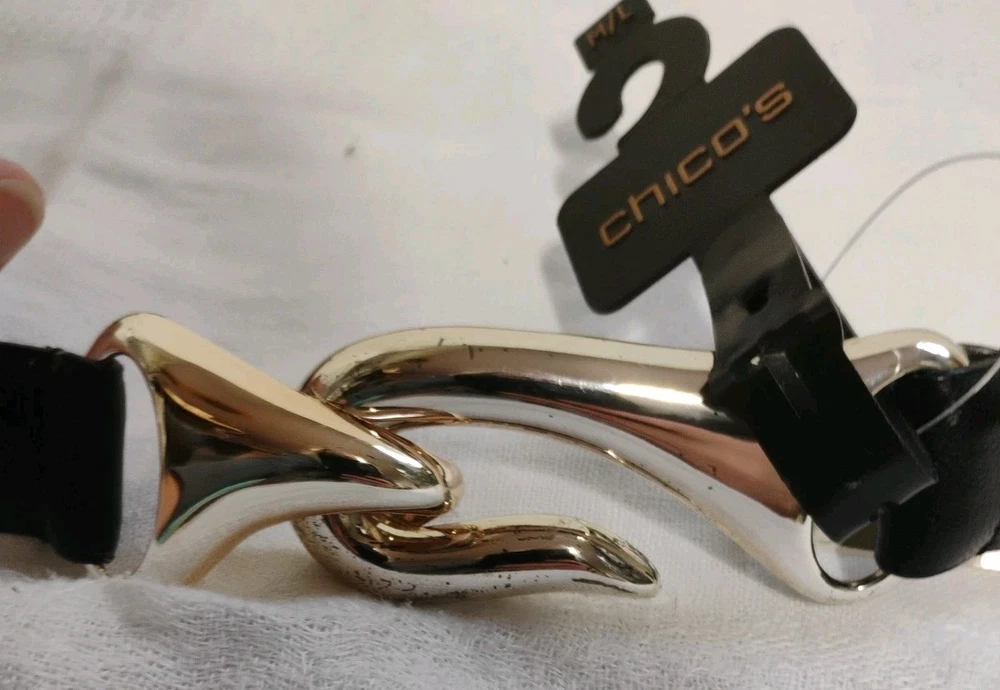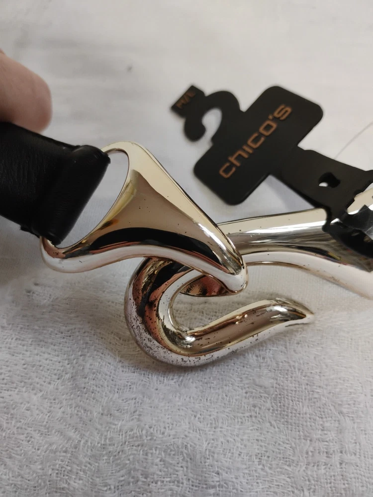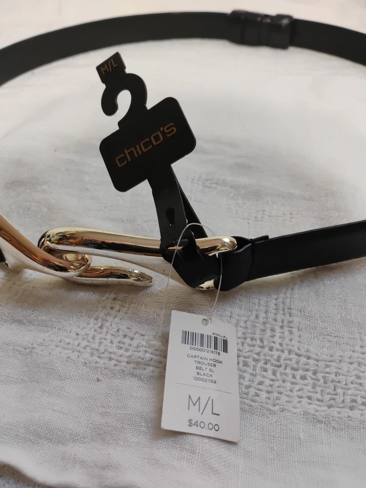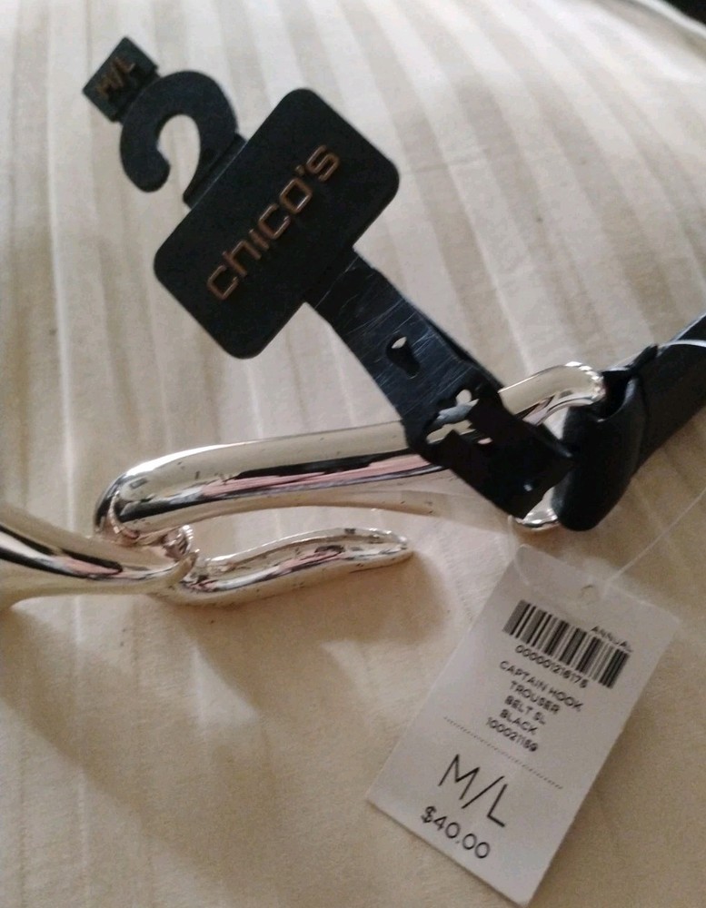 New with Tags Chicos Captain Hook Black Leather Trouser Belt Size M/L Adjustable NEW WITH TAGS 43" fully extended ** NOTE some marks/tarnishing on bottom of buckle. See photos for detail. Questions? Please ask! Shipping can be combined on multiple items. Recycled shipping materials are used whenever possible. All items ship from a pet-friendly environment. Thank you for looking!