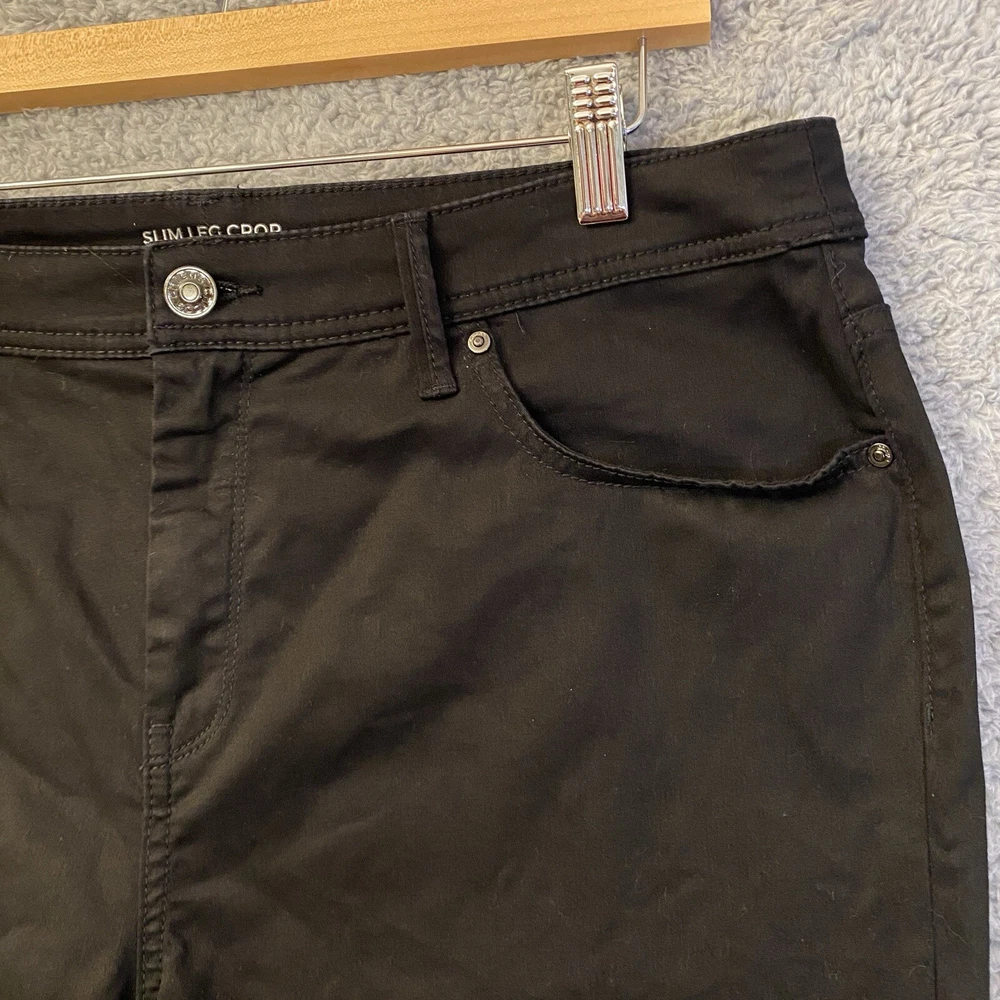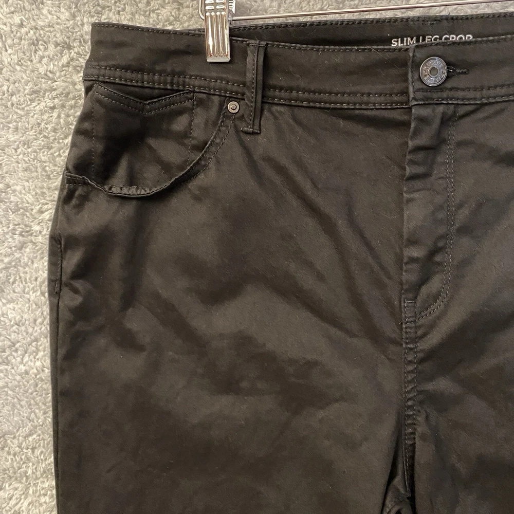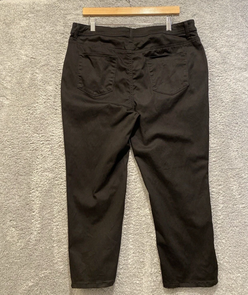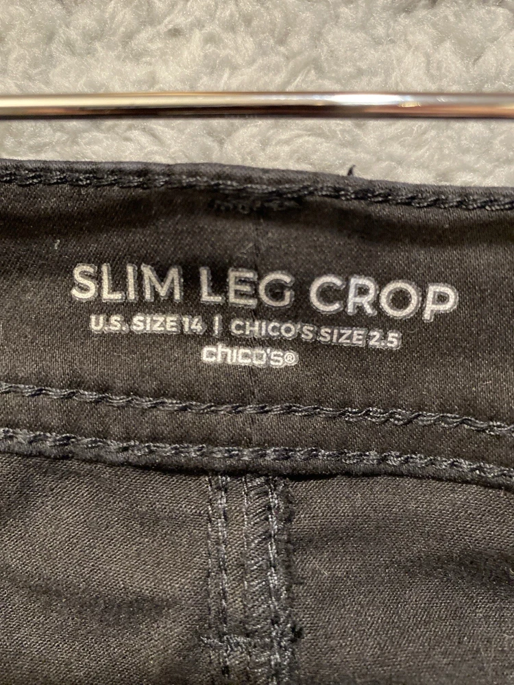 Chicos Crop Pants Capri Size 14 Black High Rise Straight Leg Stretch 34x23 Very good condition. No rips or stains. Color is not faded - fully black, hard to capture color in pictures. Waist: 34" Hip seam to seam: 20.5" Rise: 12" Length: 23" Ankle Width: 7" Ships by USPS Ground Advantage.