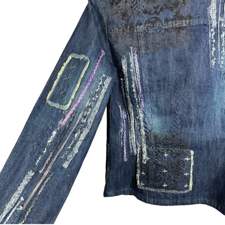 FOX 8 News Anchor Stefani Schaefer is modeling the jacket in the cover shot & gives us a sneak peek of this year’s Designer Dress Days READ Pre Owned Gently Worn ONLY ONCE Excellent Condition Gorgeous Appliqués Patches with Different Shades of Denim Fringed, Frayed, & Purple Accents Measurements Are Approximate to 1/2” Chest 33.5”-34.5” Waist 28”-29” Length 24” Sleeve Length 24” Fabric Content Cotton 100% Note: the top button is missing I didn’t notice when I purchased the piece at Chico’s and it was Clearance & couldn’t be returned. It’s unnoticeable Price reduction by 25% for the minor flaw Clean Home Non Smoking No Indoor Pets Loft240124