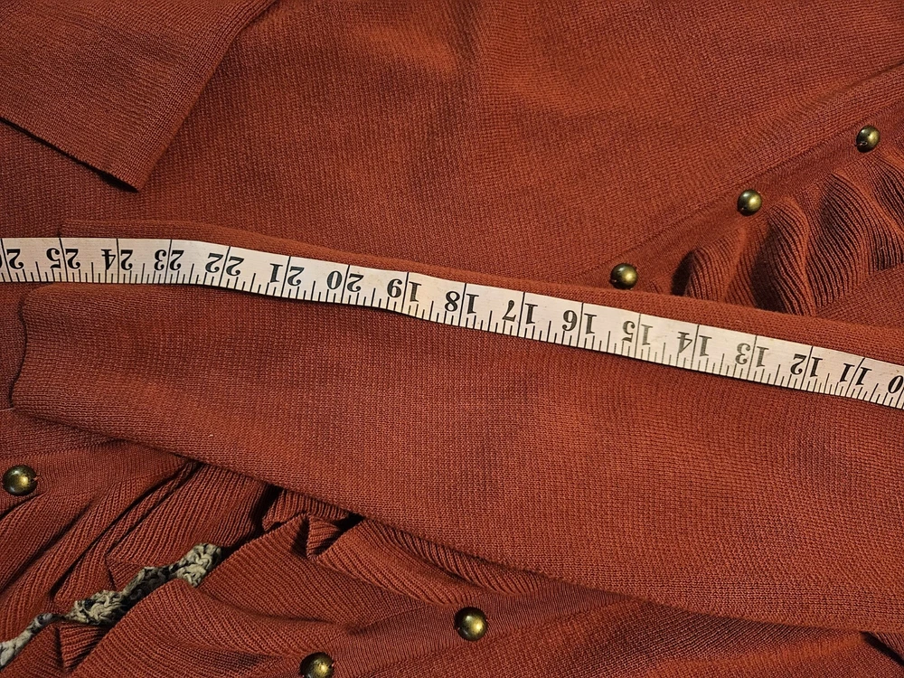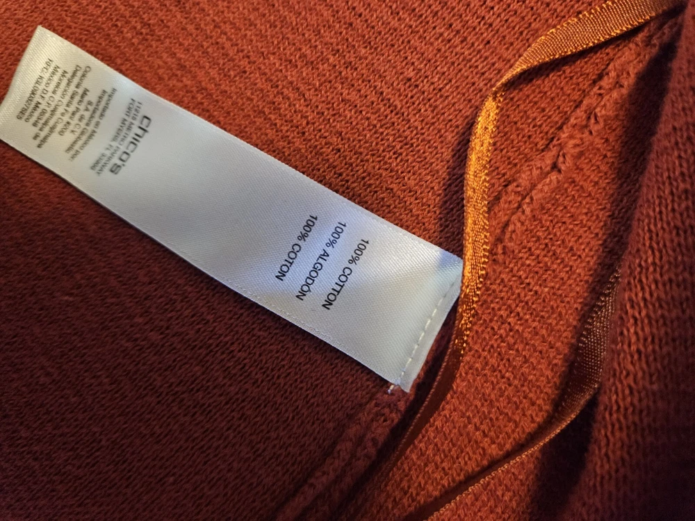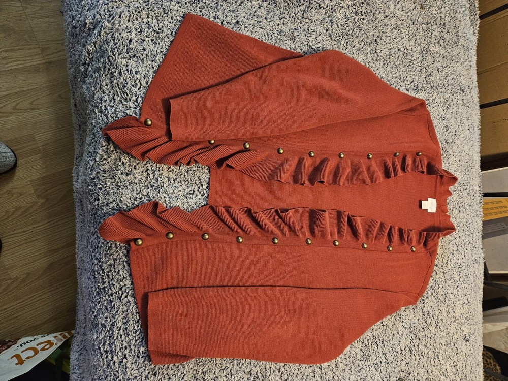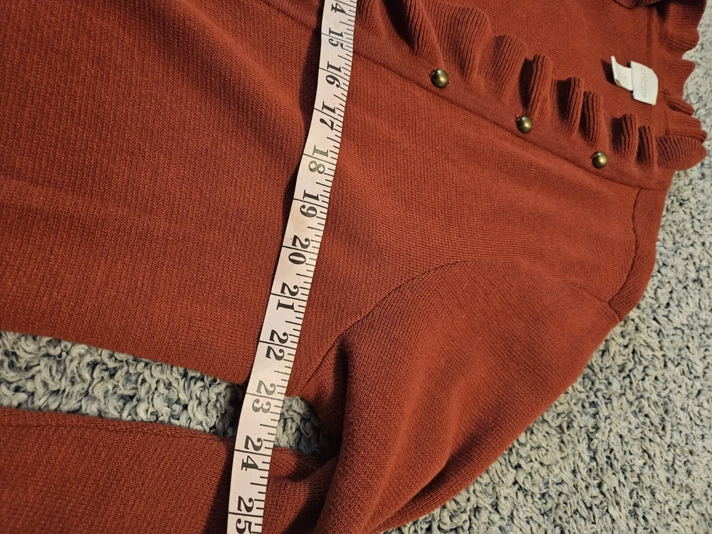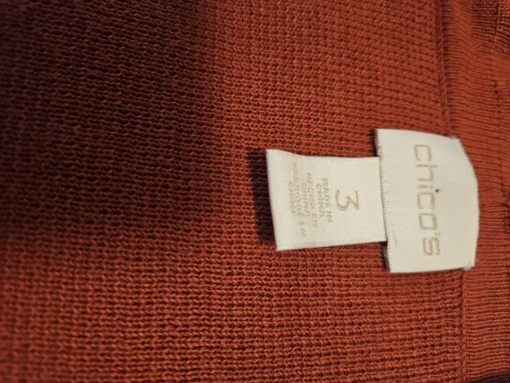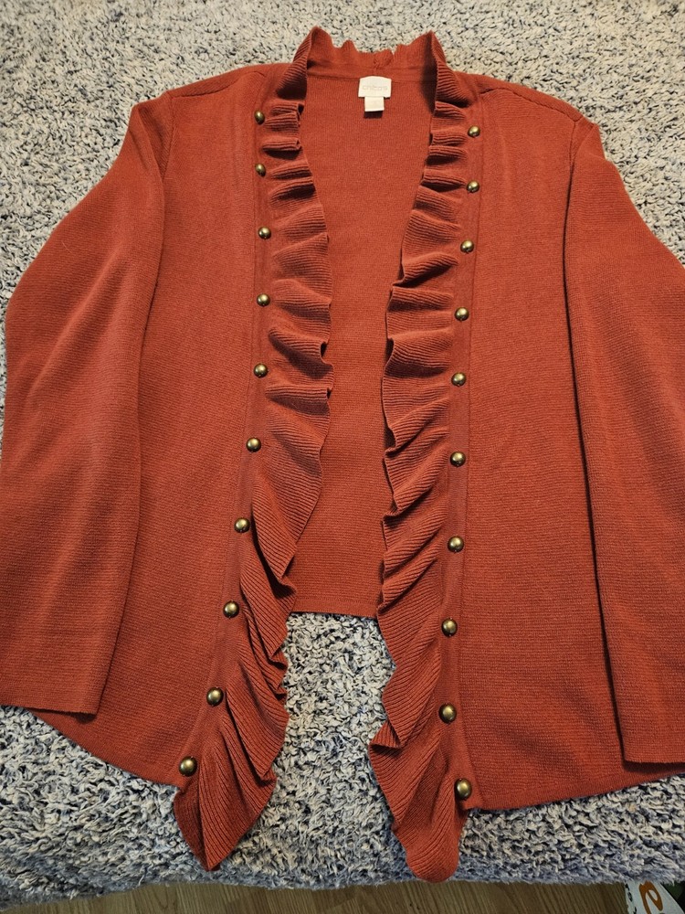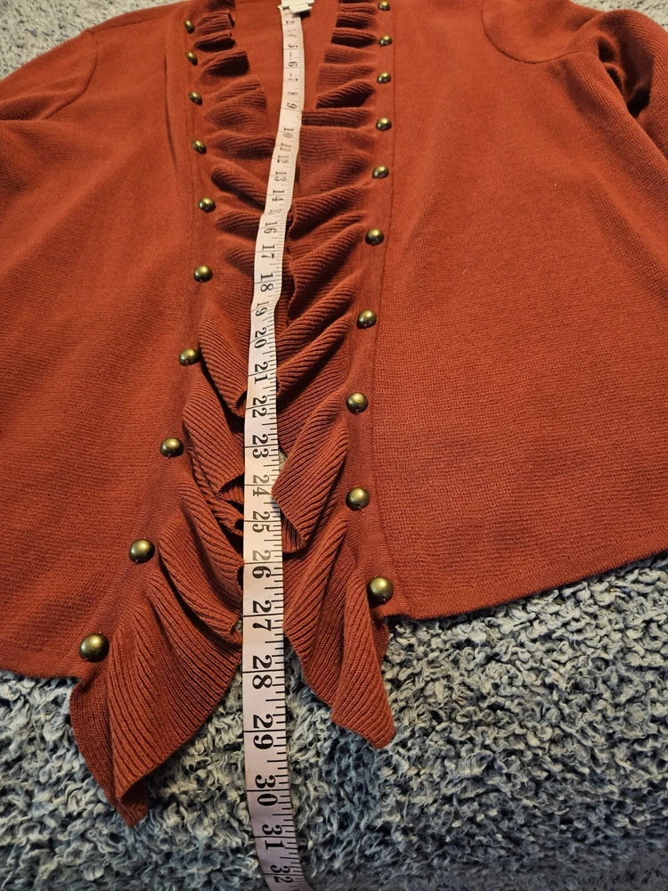 Add a touch of elegance to your wardrobe with this beautiful Chico's sweater. The red metal 'studs' line the length of the cardigan, replacing traditional buttons. The plus size 3X sweater is perfect for any woman looking for a comfortable yet stylish addition to their collection. The sweater is made with high-quality materials and features a lined interior for added comfort. Its stylish design and unique accents make it perfect for any occasion. Don't miss out on the chance to add this stunning Chico's sweater to your wardrobe today.