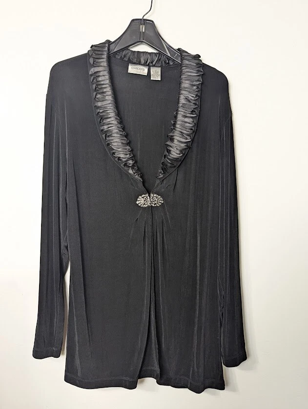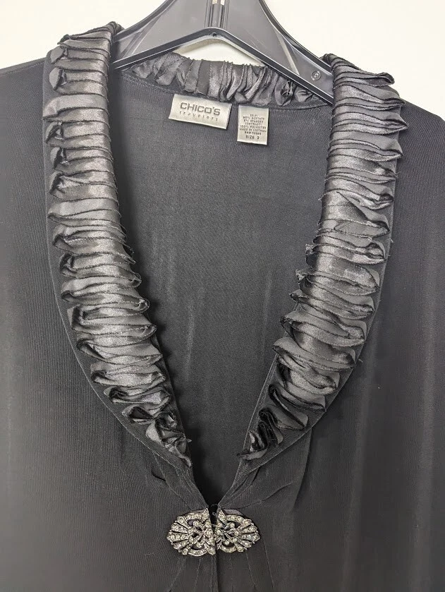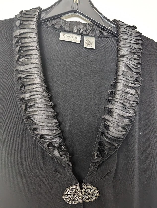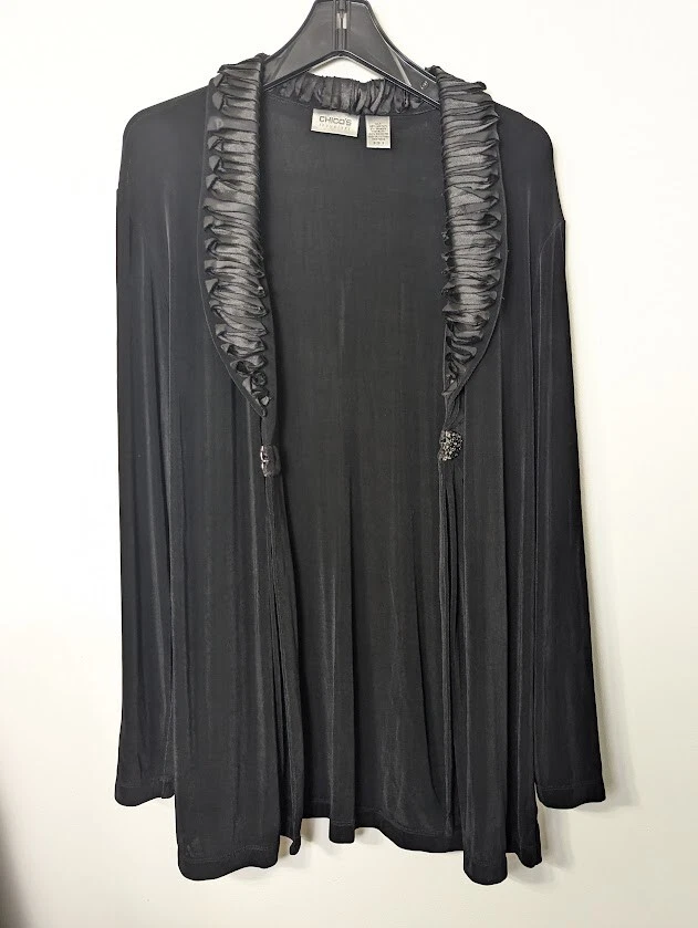 Chicos Traveler Cardigan Womens Black Slinky Knit Long Sleeve Sparkly Clasp sz 3 (Large) Holiday - Wedding - New Year's Measures approximately 24.5" armpit to armpit (see photo for all measurements) 95% Acetate 5% Spandex Good Condition
