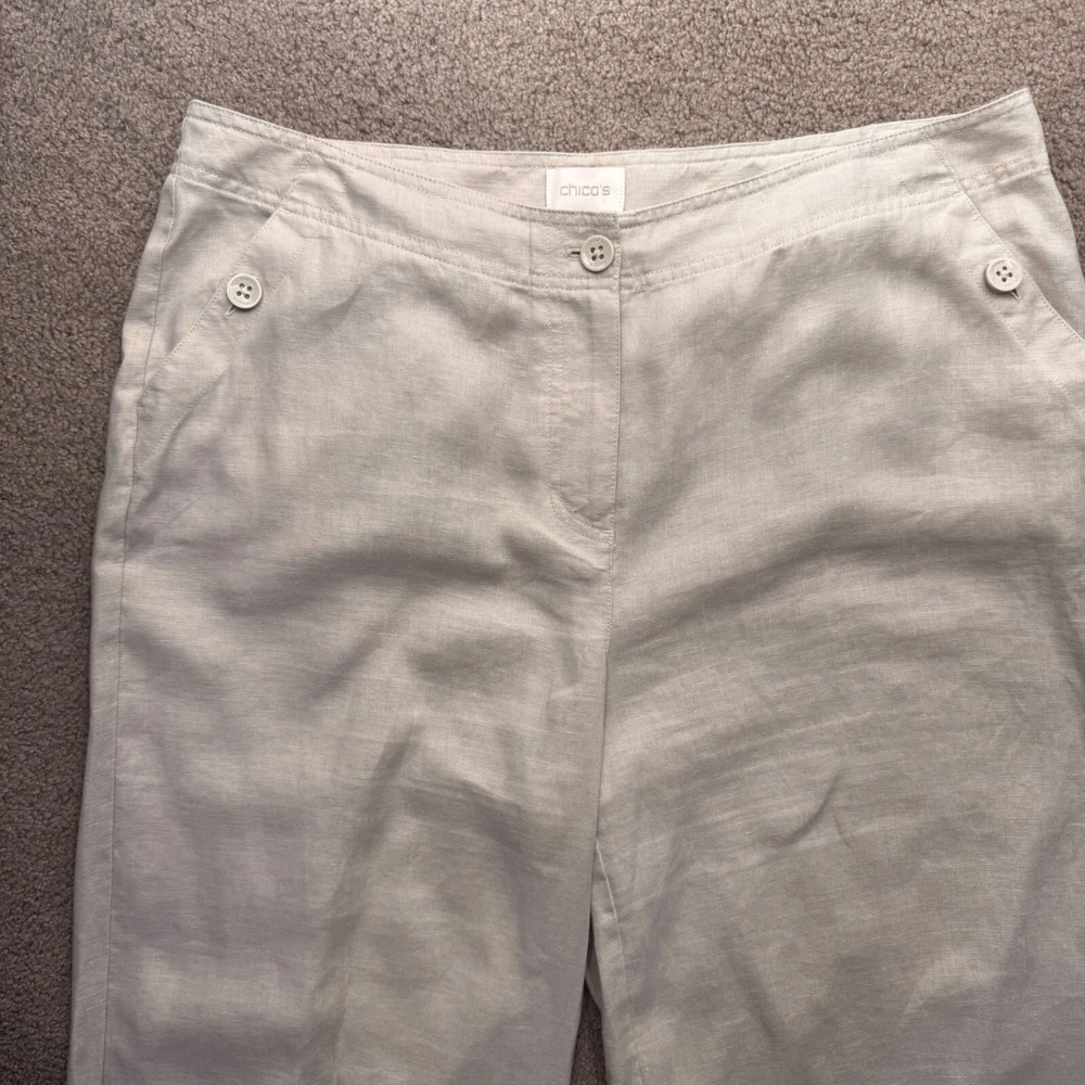 In the quiet corners of a summer garden, these linen pants find their essence. Crafted by Chico's, they whisper tales of comfort and style. With a gentle beige hue, they promise airy elegance, keeping you cool under the sun's embrace. Their wide-leg design invites freedom, perfect for leisurely strolls. • Wide leg design • Button detail on waistband • Two side pockets • Breathable linen material • Made in China Top to bottom = 35.75 inches Waist = 16.5 inches