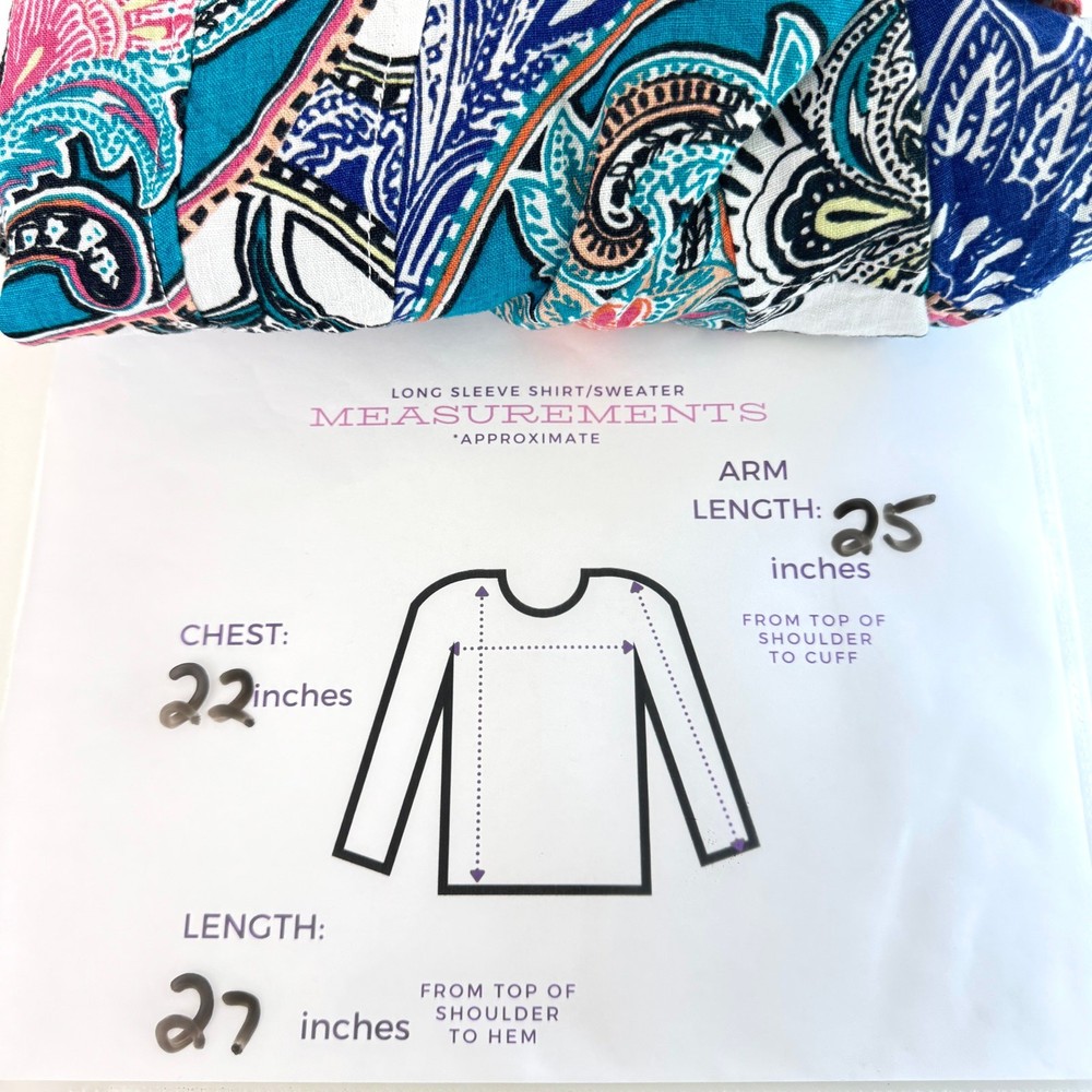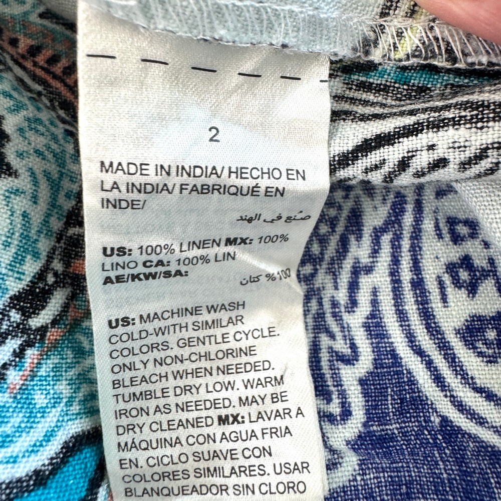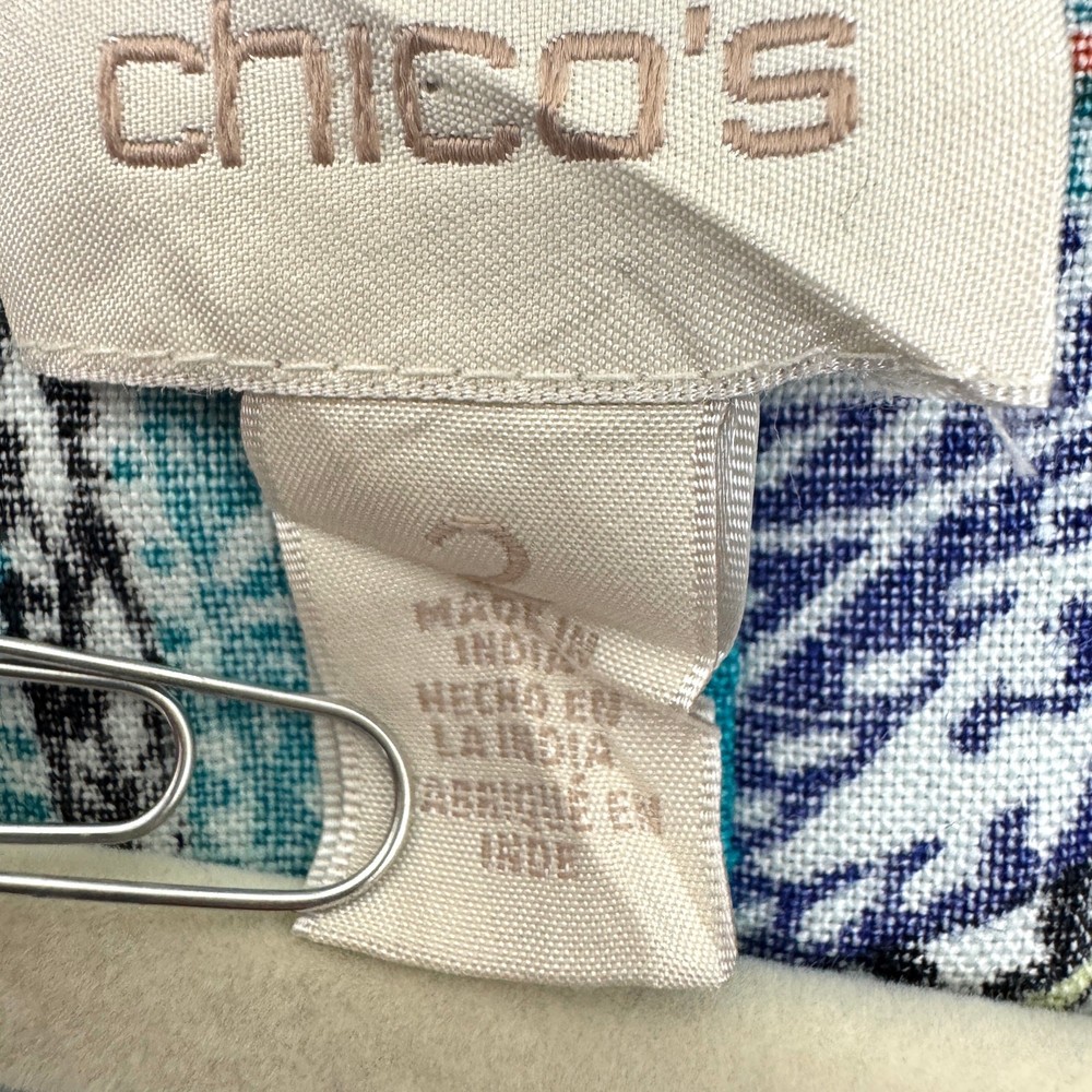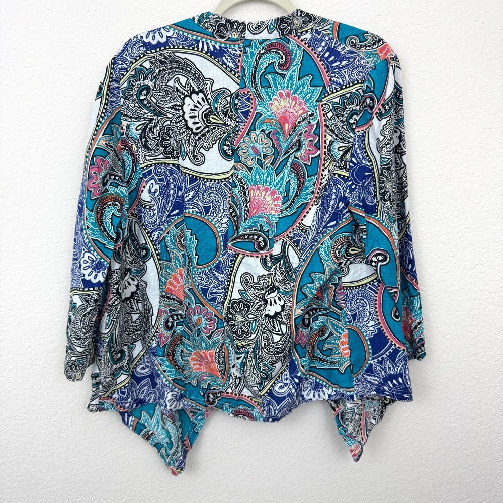 Brand: Chico's Size: Brand size 2 equal US L/12 Measurements: Please see last photo for approximate measurements. Condition: In very good pre-loved condition. No stains, holes, or tears. Any zips, buttons, or pockets, if present, work as expected. Color: Blue, white, orange, black Material: 100% linen Features: Open front no closure 3/4 length sleeves Lightweight breathable fabric Style: spring, summer, travel, resort wear, cabana, beach, pool, resort, cruise, warm weather, casual, vacation, summervibes, linen, paisley, lightweight, resortwear