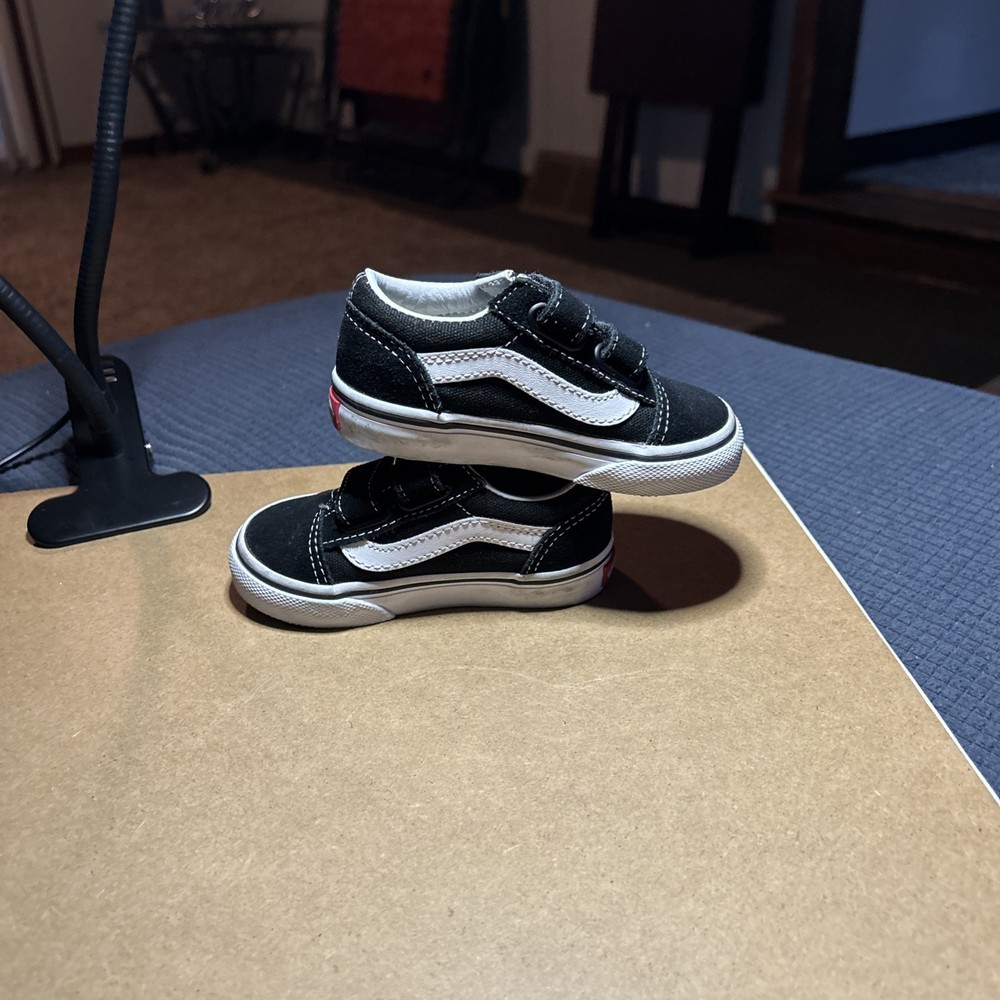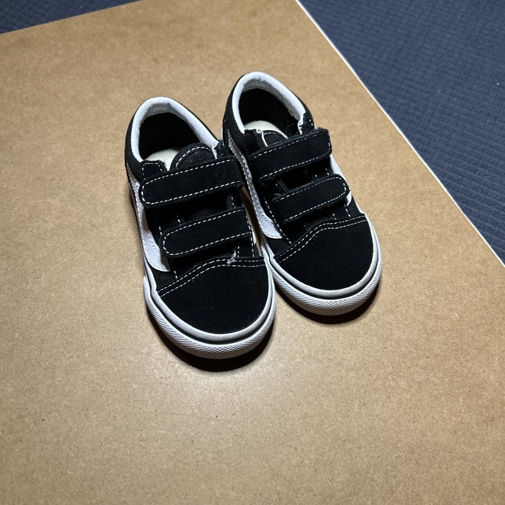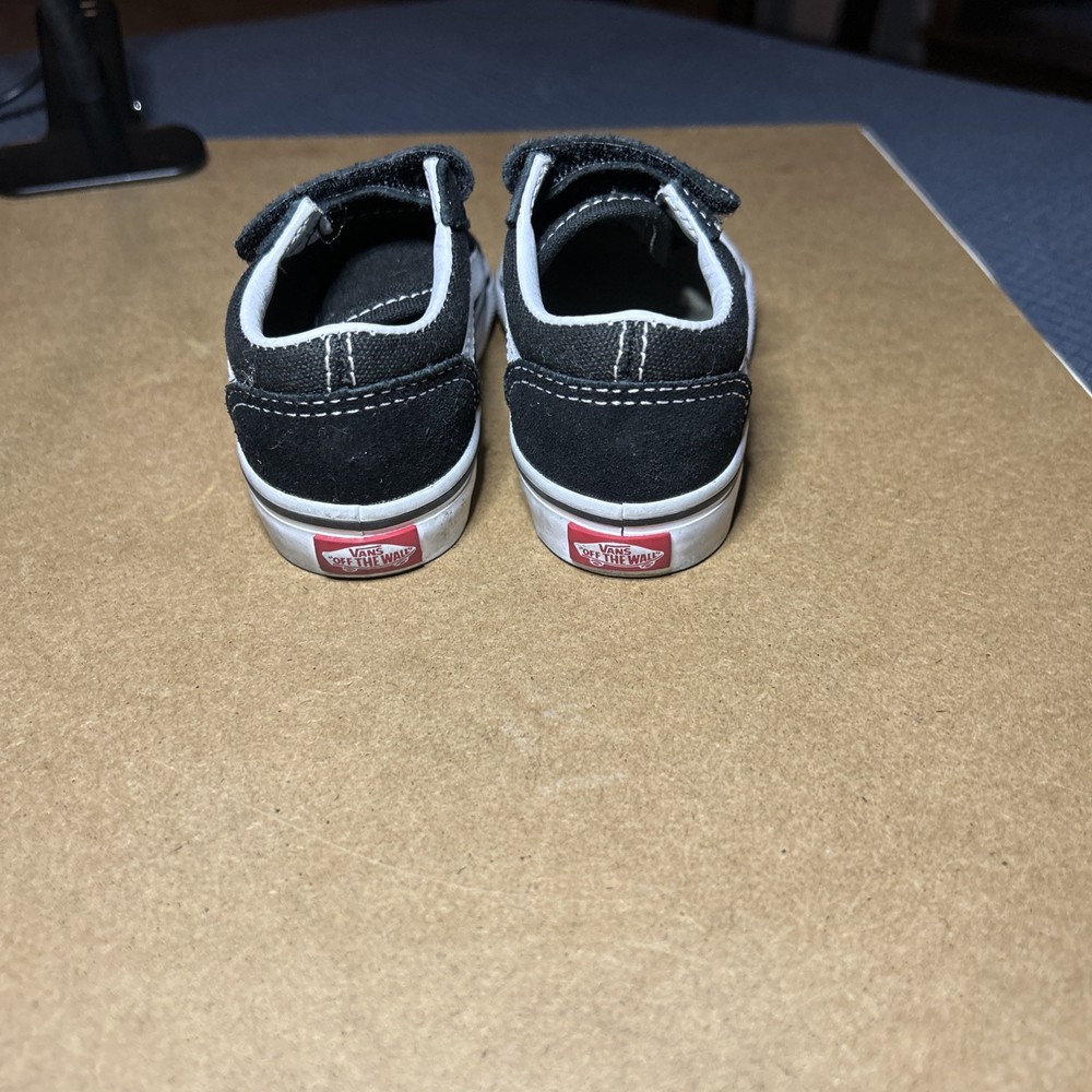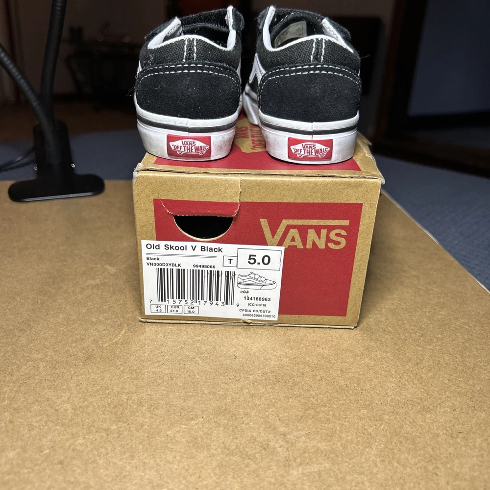 The product is a pair of Vans Kids Old Skool V Core athletic shoes, designed for toddlers in size 5. These black sneakers feature a unisex style, making them suitable for both boys and girls. The classic Vans Old School model offers a comfortable and trendy option for young children looking to add a touch of streetwear to their wardrobe. Made with durable materials, these shoes combine style and functionality for active kids on the go. Very little signs of wear. Some scuffing on white soles.