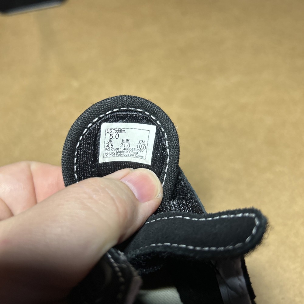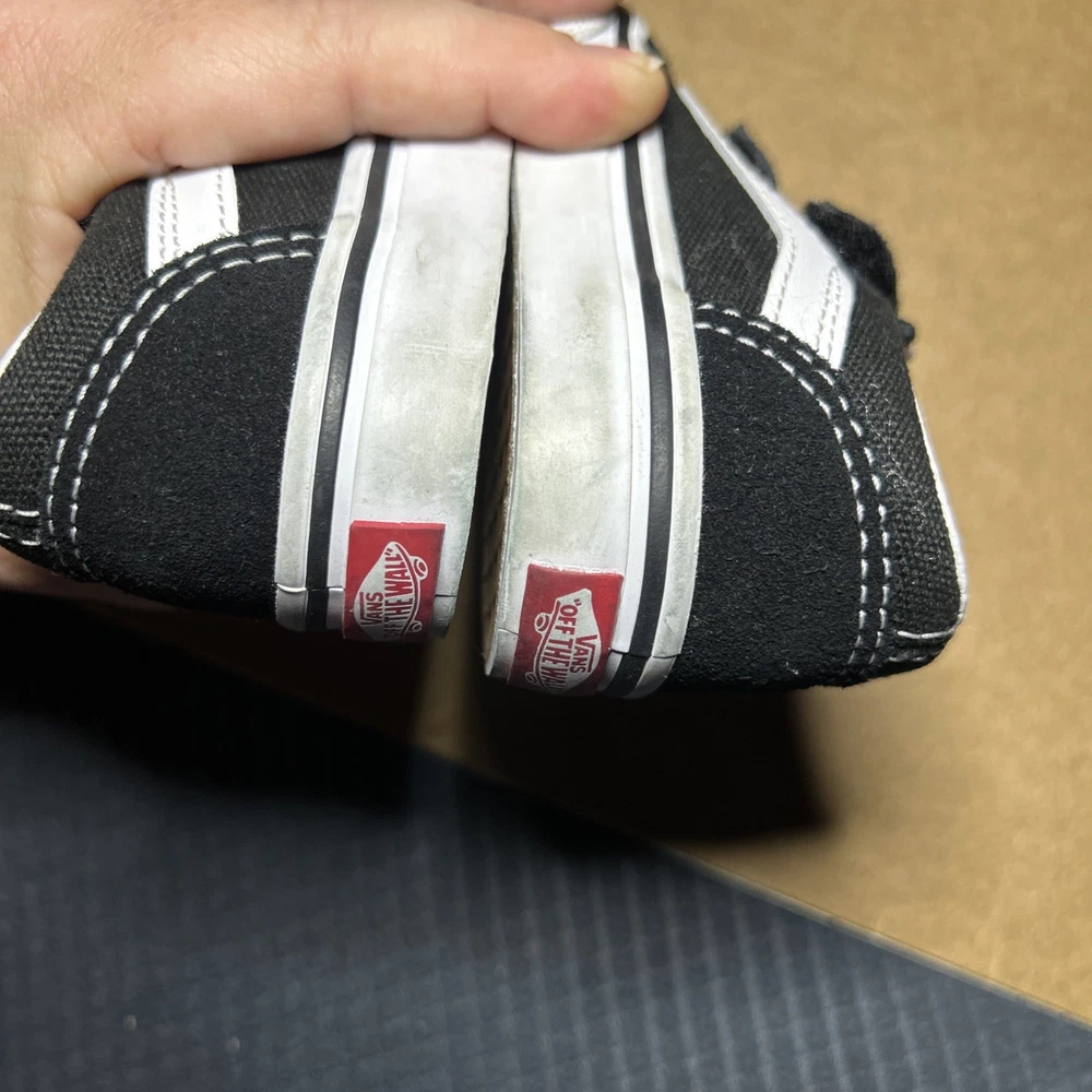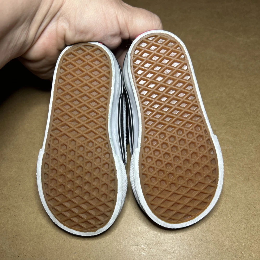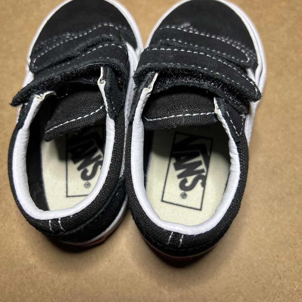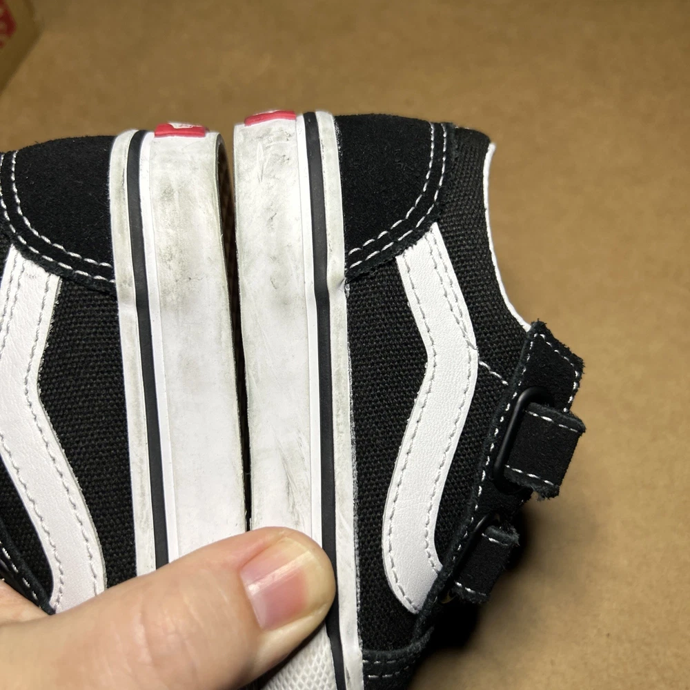The product is a pair of Vans Kids Old Skool V Core athletic shoes, designed for toddlers in size 5. These black sneakers feature a unisex style, making them suitable for both boys and girls. The classic Vans Old School model offers a comfortable and trendy option for young children looking to add a touch of streetwear to their wardrobe. Made with durable materials, these shoes combine style and functionality for active kids on the go. Very little signs of wear. Some scuffing on white soles.