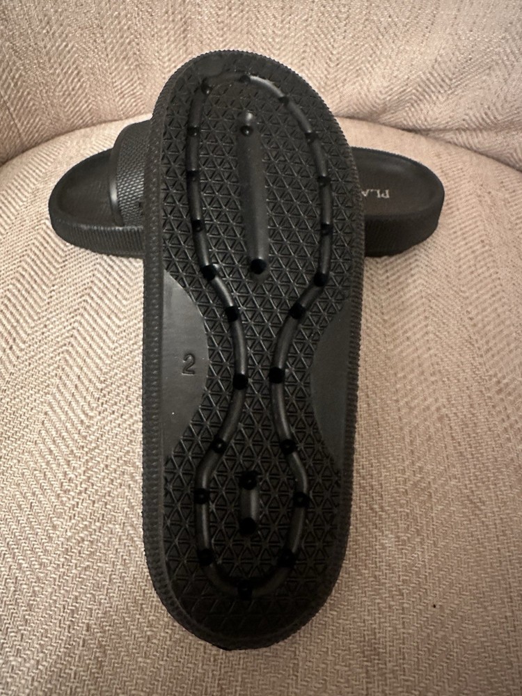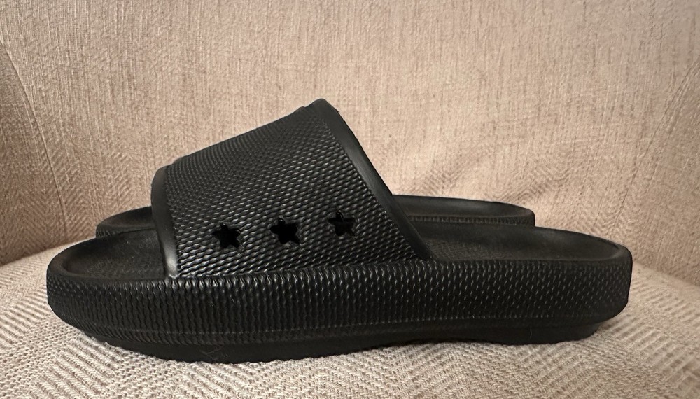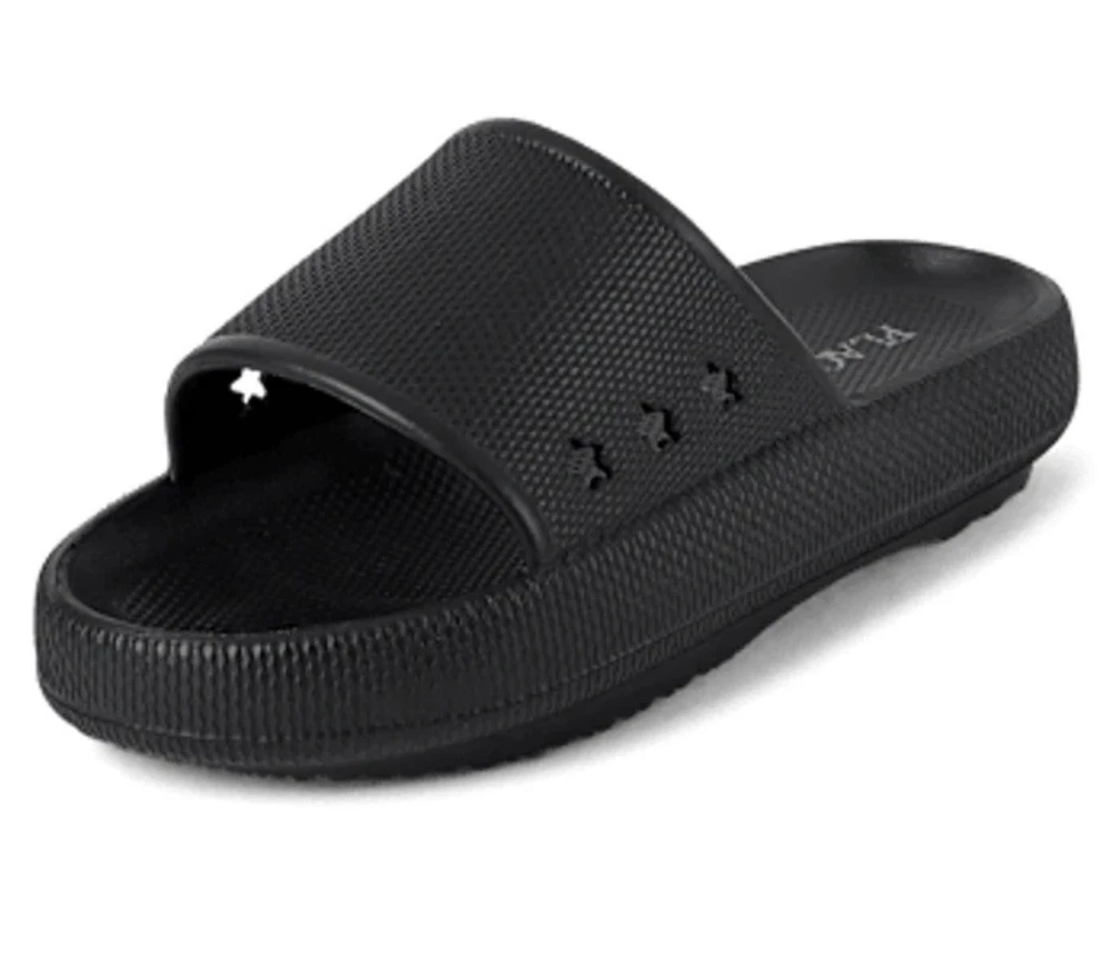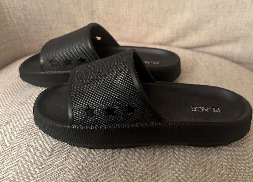 The Children's Place Black Slide Sandals with Star Cutouts in size 2 are a stylish option for young girls. These sandals feature a comfortable slide design with a unique star cutout detail, adding a fun and fashionable touch to any outfit. Made by the trusted brand Children's Place, these sandals are durable and reliable for everyday wear. Perfect for summer days or casual occasions, these sandals are a great addition to any little girl's shoe collection.