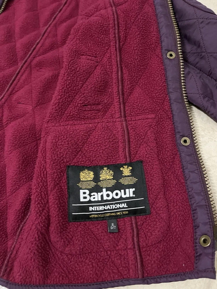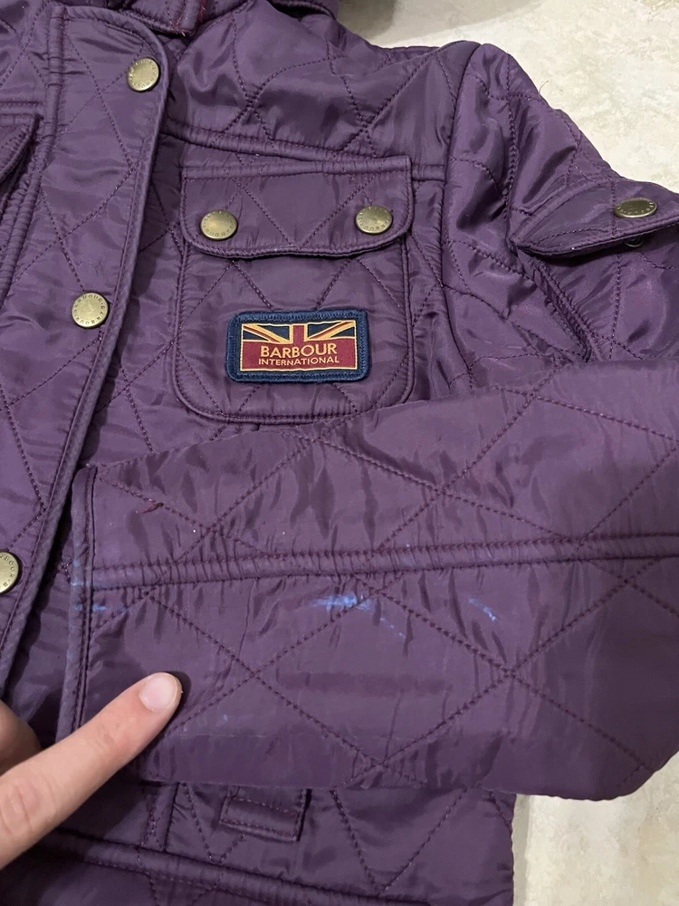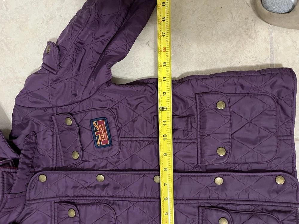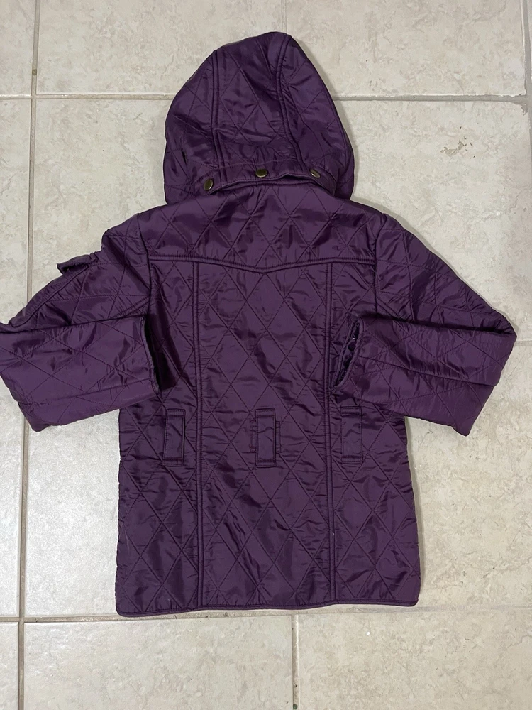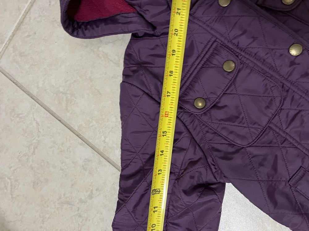 Wrap your little one up in style with this gorgeous Barbour quilted coat, perfect for fall and winter. The coat features a full zip closure and an adjustable strap for a comfortable fit. The purple and burgundy colors are perfect for a pop of color in a sea of grey. Crafted from 100% polyester, this coat is durable and will keep your child warm all season long. The coat is perfect for outdoor activities, whether it's a day at the park or a hike in the woods. The coat is available in size small, perfect for girls size 6/7.