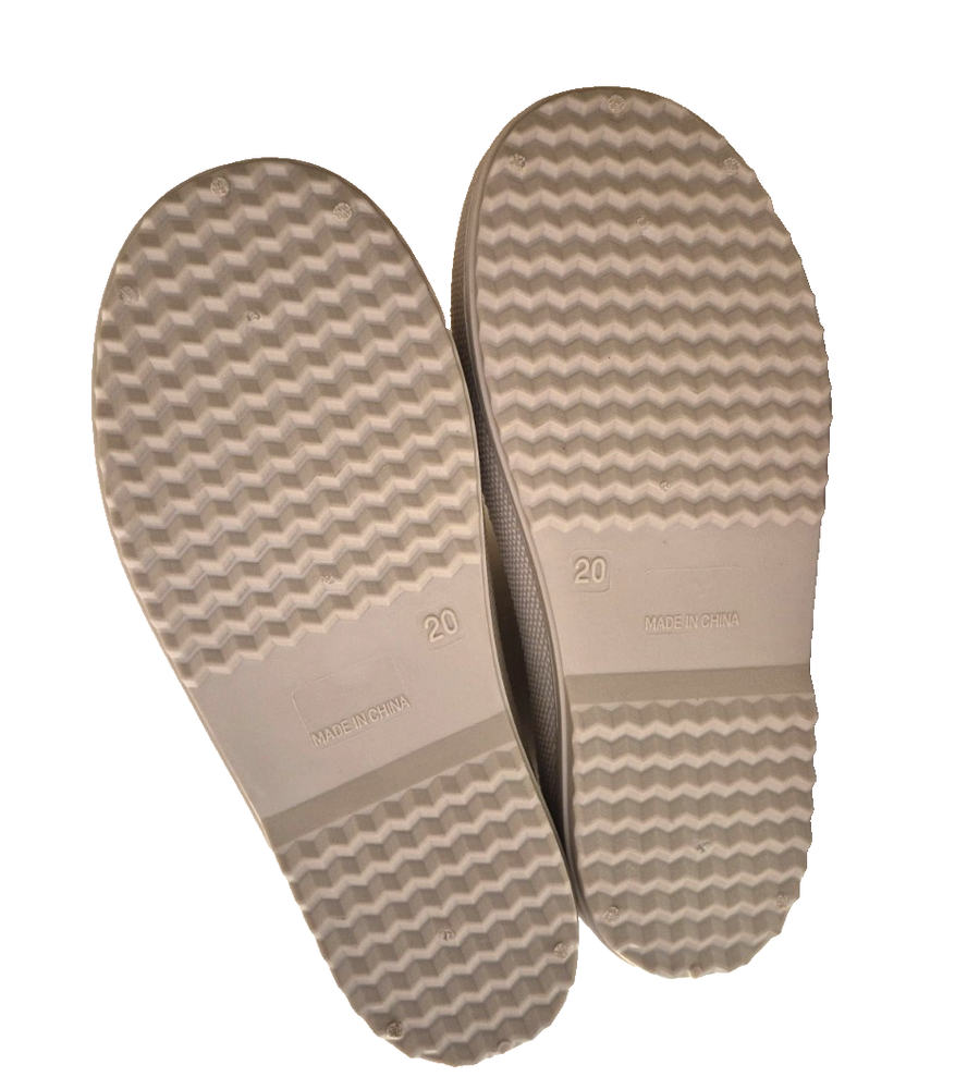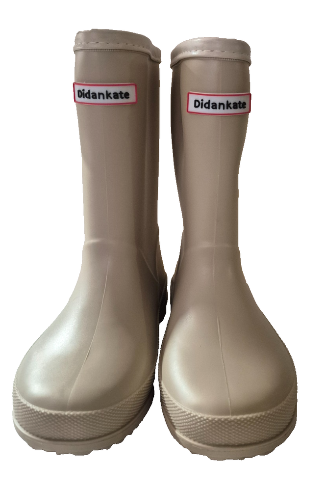 These Children's Rubber Rain Boots by Didankate in size 20 (USA 5) are perfect for those rainy and snowy days. These pull on, mid-calf boots have a round toe and a rubber outsole for traction. They are waterproof and have a reinforced rear pull tab for easy wear. The light tan color and solid pattern make them practical yet stylish for girls and boys. Made of rubber with a fabric-lined insole, these boots are durable and comfortable for all seasons and a reliable choice for keeping those little feet dry.