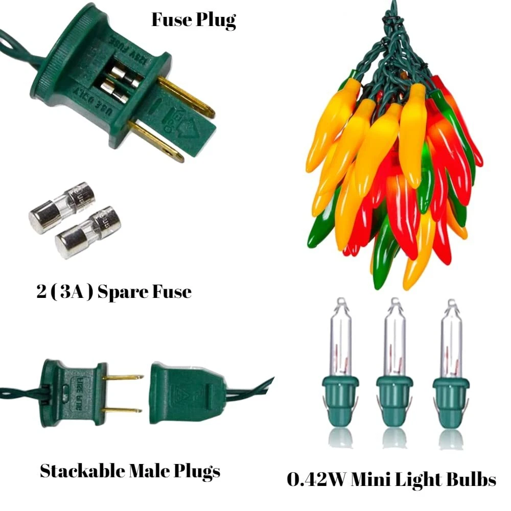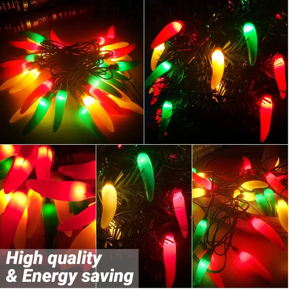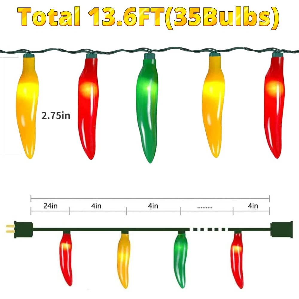 ☀️High quality & Energy saving: 13.6FT outdoor chili pepper string lights with 35 red chili lights( mini incandescent bulb), red chili is made of high quality plastic, each bulb 0.42W, 14.4W per kitchen string lights. 🥦Three Color: The length of the chili is 3 inches, multicolor chili pepper are composed of red peppers, yellow peppers and green peppers, green wire,2 spare bulbs & 2 spare fuse. If light bulb that goes out does not affect other lighting bulbs. 🌈End-to-end connectable: Chili pepper lights string plug in design, total length 13.6 FT, 4 inch spacing between chili pepper, plug leading length 24 inch, femal connector leading length 4 inch. Max 216W, connected up to 15 strand same hot pepper string lights. 🍄Weatherproof: chili pepper string lights UL Listed for Indoor & Outdoor Use. you can hang chili pepper lights outdoor such as restaurant, windows, porches, patios, pergolas, parties and backyard BBQs. 🌶️Chili Pepper Special Present for U: Traditional Chili pepper christmas lights could suitable for any ordinary household power socket, no battery required. Multicolor Chili pepper decorations kitchen perfect as a high-quality lights outdoor decorative gifts for your family and friends. Please the seller directly if you have any quality problems.