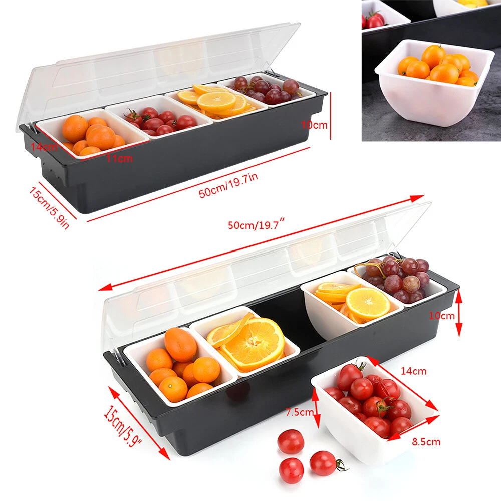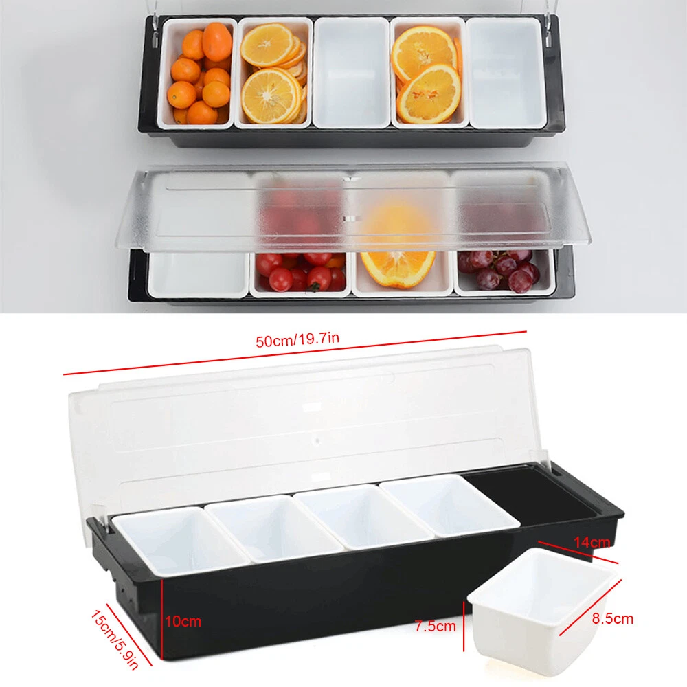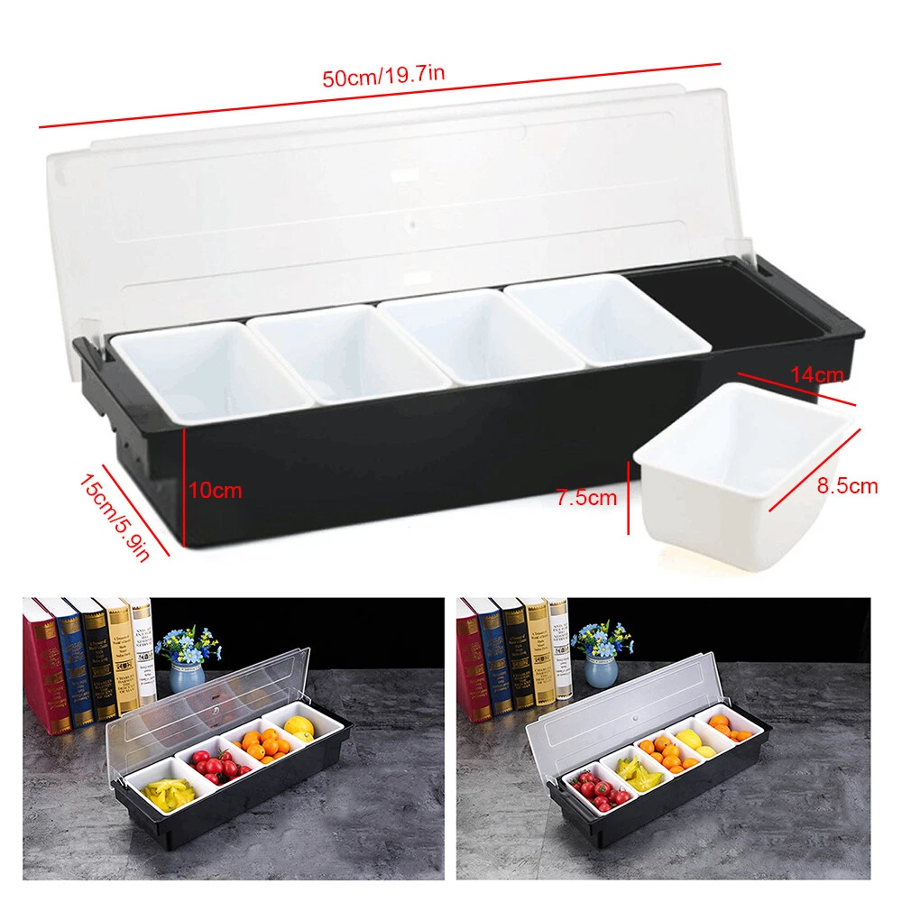5 Tray Condiment Dispenser Compartment Server bar Fruit Caddy Food Box Description: Multifunctional Fruit Box with Cover,Keep Fruit Fresh for a Long Time. with Cover Design, Dust-proof and Sanitary. It Is Made of Food Grade ABS Material. There Are Multiple Inner Boxes for Sorting and Storage. Specifications: Material: Food Grade ABS Color: Black +White Item Size: 19.7* 5.9*3.9 Inch / (50*15*10 Cm) 5box Inner Box Size:5.5”X3.3”X2.95”(14x8.5x7.5cm) Product Weight: 983.4g Application: Kitchen, Dining Room, Living Room, Coffee Shop, Milk Tea Shop, bar, Restaurant, Party,Etc Features: Keep Food Fresh: Put the Whole Bracket Directly on the Ice! the Design of the Tray Makes the Frozen Air Stay Under the Condiment, Which Can Keep Fresh and Refrigerated for a Long Time. It Is Especially S Condiment Dispenser Chilled Server Caddy Food Tray Salad Bar 5 Compartments 5 Tray Condiment Dispenser Compartment Server bar Fruit Caddy Food Box Description: Multifunctional Fruit Box with Cover,Keep Fruit Fresh for a Long Time. with Cover Design, Dust-proof and Sanitary. It Is Made of Food Grade ABS Material. There Are Multiple Inner Boxes for Sorting and Storage. Specifications: Material: Food Grade ABS Color: Black +White Item Size: 19.7* 5.9*3.9 Inch / (50*15*10 Cm) 5box Inner Box Size:5.5”X3.3”X2.95”(14x8.5x7.5cm) Product Weight: 983.4g Application: Kitchen, Dining Room, Living Room, Coffee Shop, Milk Tea Shop, bar, Restaurant, Party,Etc Features: Keep Food Fresh: Put the Whole Bracket Directly on the Ice! the Design of the Tray Makes the Frozen Air Stay Under the Condiment, Which Can Keep Fresh and Refrigerated for a Long Time. It Is Especially Suitable for Long-distance Bus or Picnics Away from Home! at the Same Time, You Can Store the Seasoning Container in the Refrigerator for Daily Use. Easy to Clean: the 5 Compartments of the Seasoning Distributor Tray Can Be Removed Separately, Which Is Convenient for Cleaning and More Hygienic. The Enclosure Is Transparent and Sealed: When in Use, There Is No Need to Worry About Insects or Items Flying in, and the Items Stored in the Condiment Box Can Be Clearly Seen. Gift Giving: This Condiment Dispenser Tray Is Perfect for Birthday Gifts and Friends Parties. It Will Be the First Choice for Summer Carnival. Packing List: 1 X 5 Boxes of Fruit Payment Delivery details Terms of sales About us Contact us Payment We accept ebay payment 。 Fees such as import duties, taxes are not included in the item price or shipping costs. These charges are the buyer's responsibility. Delivery details Shipping: 2-9 working days to: USA Terms of sales We maintain high standards of excellence and strive for hundred percent customer satisfaction. Feedback is very important to us. We hope that you contact us immediately before you give neutral or negative feedback, so that we can address your concerns. It is impossible to address issues if we do not know about them! About us Your satis faction is our ultimate goal. We work hard to earn your trust and future business. Our certified technicians have tested each item before shipping. The unit comes with 1 year limited warranty on all manufacturing defects. a) If you receive a defective item, you may return it or ask for a discount. Please contact us within 14 days after you receive the package. b) What you returned must be intact and in its original packaging as re? u. Customer is responsible for shipping costs of the returned item. c) We will cover the cost of shipping back t with the shipping rate indicated in the registration page. We will send you a new unit or refund the full payment you paid. Thank you. Contact us Business Hour Business Hour: Monday To Friday: 8:30 AM to 5:00 PM (Beijing China time) Due to time zones, our reply to your questions may not be immediately. But within above working time, we will reply your email within 24 hours. If it's non-workdays, please kindly be patient and wait till Monday. Please contact us with ebay message. Please feel free to contact us if you have any questions. Monday To Friday: 8:30 AM to 5:00 PM (Beijing China time) Due to time zones, our reply to your questions may not be immediately. But within above working time, we will reply your email within 24 hours. If it's non-workdays, please kindly be patient and wait till Monday. Please contact us with ebay message. Please feel free to contact us if you have any questions.
