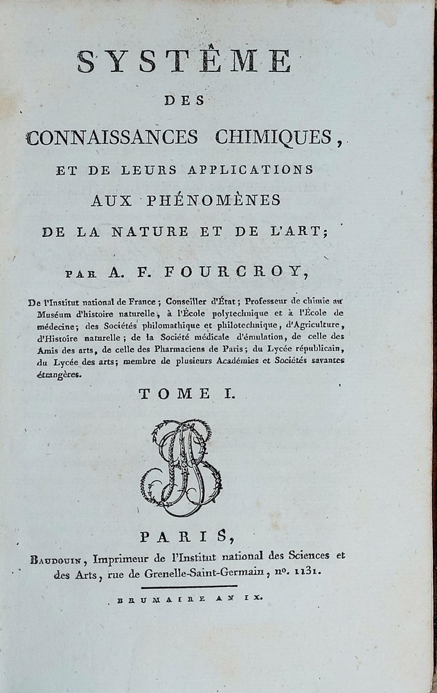 SYSTÈME DES CONNAISSANCES CHIMIQUES, ET DE LEURS APPLICATIONS AUX PHÉNOMÈNES DE LA NATURE ET DE L'ART ______________________ Paris, Baudouin, An IX-X (1800-1802) Onze tomes reliés en dix volumes in 8°, reliure d'époque pleine basane mouchetée, dos très orné, tranches rouges. Édition originale, bien complète du volume de tables qui a été relié à la suite du tome 10 et qui manque souvent. Monumental traité de chimie entrepris par Fourcroy (1755-1809) dès 1793, alors qu'il était persuadé que le temps était venu de séparer la chimie des sciences naturelles. L'auteur y détermine 8 classes de substances chimiques, selon leur composition, des plus simples - les éléments - aux plus complexes - les minéraux et composés organiques d'origine naturelle. L'ouvrage contient plus d'informations que tout autre traité jamais publié sur le sujet et s'adresse non pas au grand public, mais à des scientifiques désireux d'approfondir leurs connaissances en chimie. Quelques défauts sur certains plats (lambeaux, voir la photo), néanmoins agréable exemplaire grand de marges. Ex libris armorié dans les contreplats de chaque volume. St.Bib3 Listing and template services provided by inkFrog
