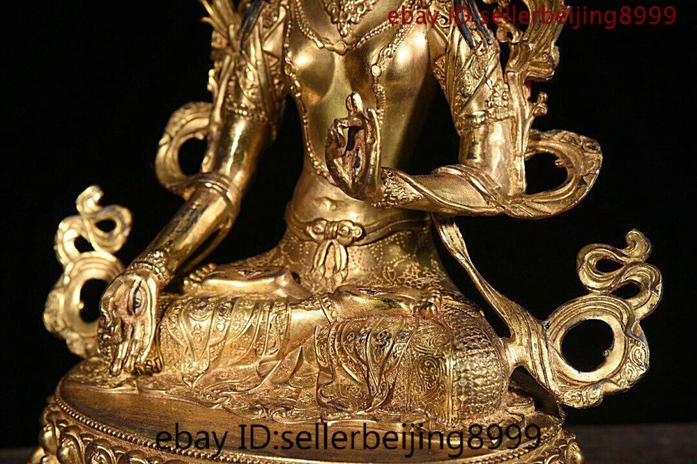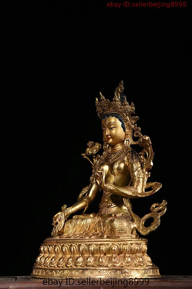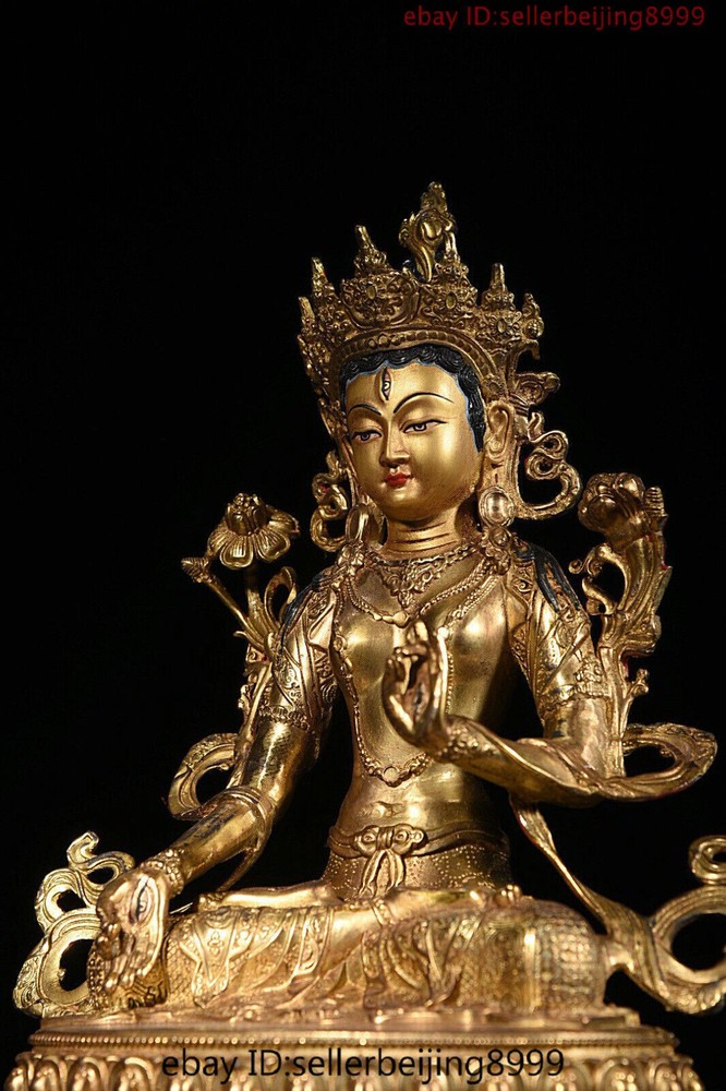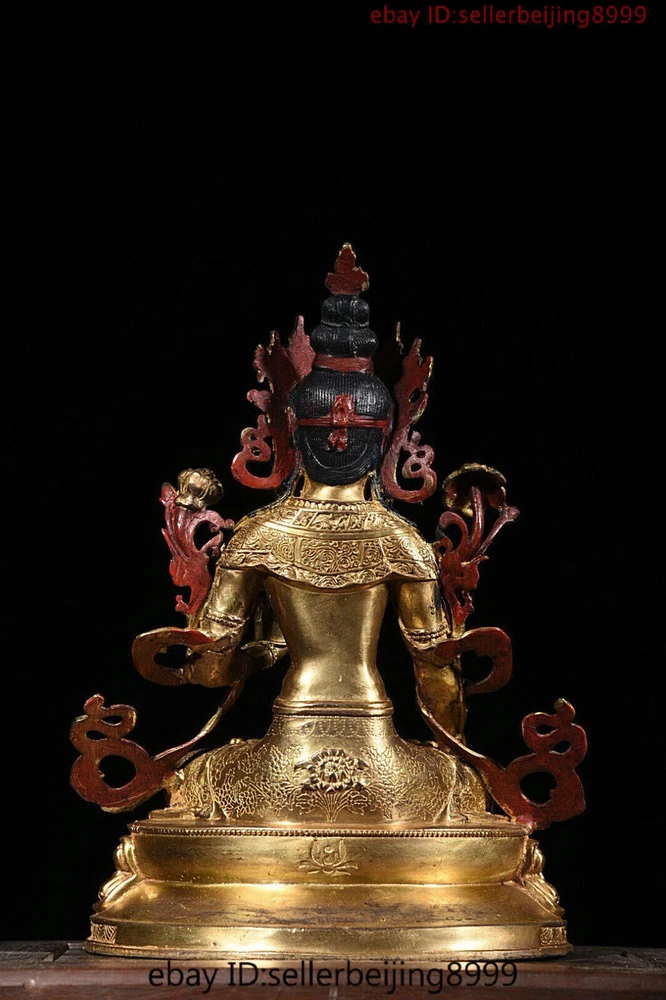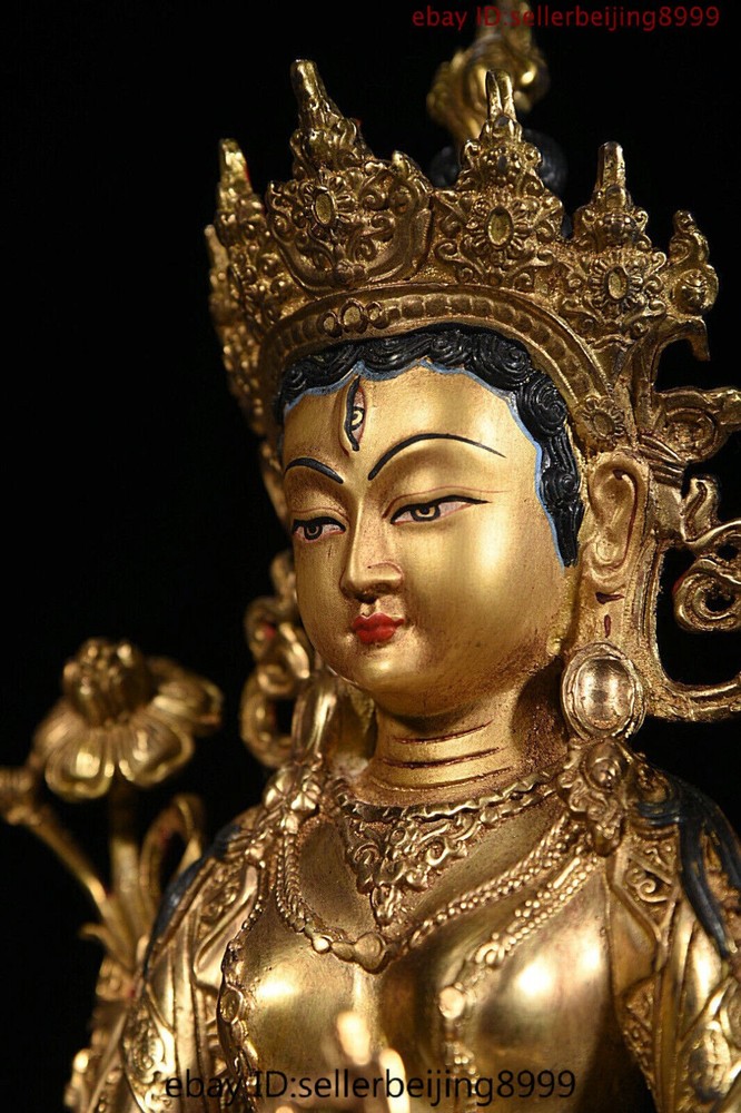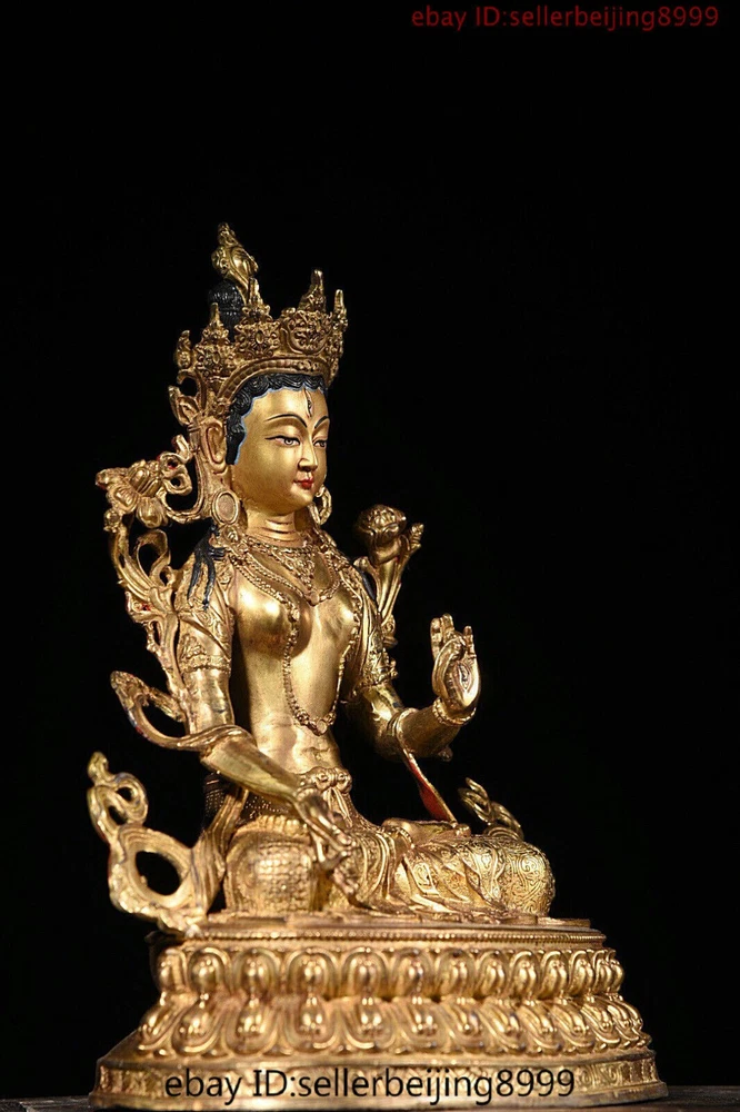 China Buddhism Temple Bronze Gilt Drawing Color White Tara Buddha Statue Origin : China Material :Bronze Confition : Perfect Confition. Perfect, with no scratches,flaws or repairs. Size : High 29.5 (cm), Long 21 (cm), Breadth 15 (cm). Size : High 11.8 (inch), Long 8.4 (inch), Bread 6 (inch).