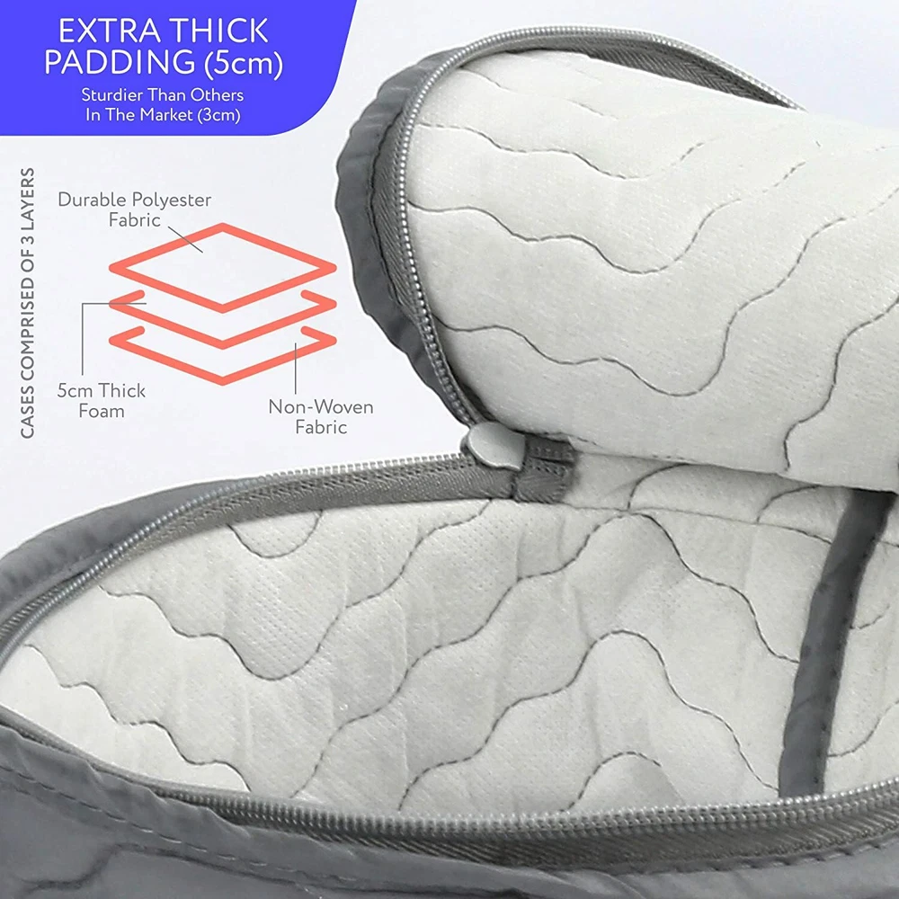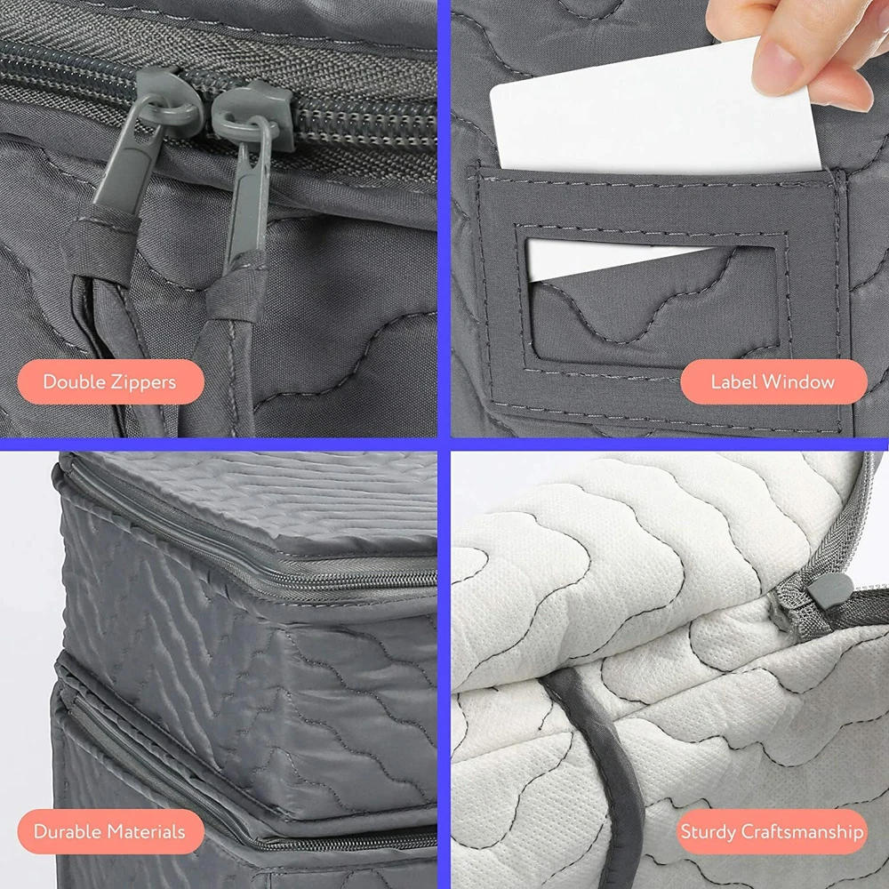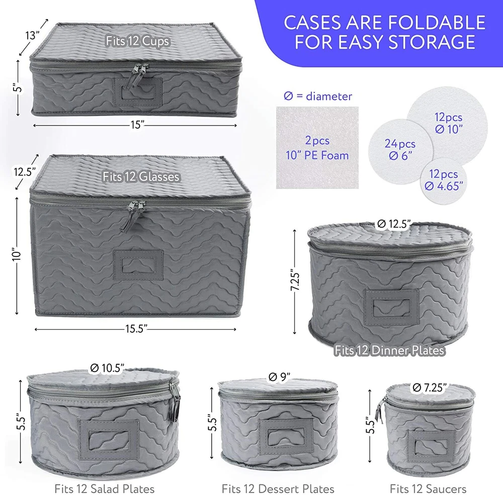 PREMIUM QUALITY FOR SOLID PROTECTION 5cm thick foam insert in the quilted case - Thicker than the standard 3cm foam on the market. Inside case - 48 felt dividers, 2 extra PE foam cushion sheets to separate each plate or dish for extra protection. Cardboard separators in cup case and glassware case protect them from colliding with each other. High-end stitching - beautiful stitching for sturdiness and & style. Quality zipper - Double zipper with tied-on pull. Label window - Insert a label so you can quickly identify items inside. CONVENIENT 6-PIECE STORAGE SET, SERVICING FOR 12 Dinner Plate Case (for up to 12 dinner plates) 12.5” D x7.25” H Salad Plate Case (for up to 12 salad plates) 10.5” D x5.5” H Dessert Plate Case (for up to 12 dessert plates) 9” D x 5.5” H Saucer Plate Case (for up to 12 saucers) 7.25” D x 5.5” H Cups Storage Case (for up to 12 cups) 15” L x 13” W x 5” H Wine Glasses Storage Case (for up to 12 glasses) 15.5L x 12.5” W x 10” H 10” Dia Felt Protectors x12 6” Dia Felt Protectors x 24 4.65” Dia Felt Protectors x 12 10” PE Foam Protectors x2 HOUSEHOLD ESSENTIAL FOR AN ORGANIZED HOME Protect and store your cherished dinnerware. Great gift for housewarming parties, newlyweds, or new neighbors.