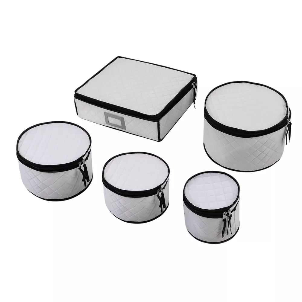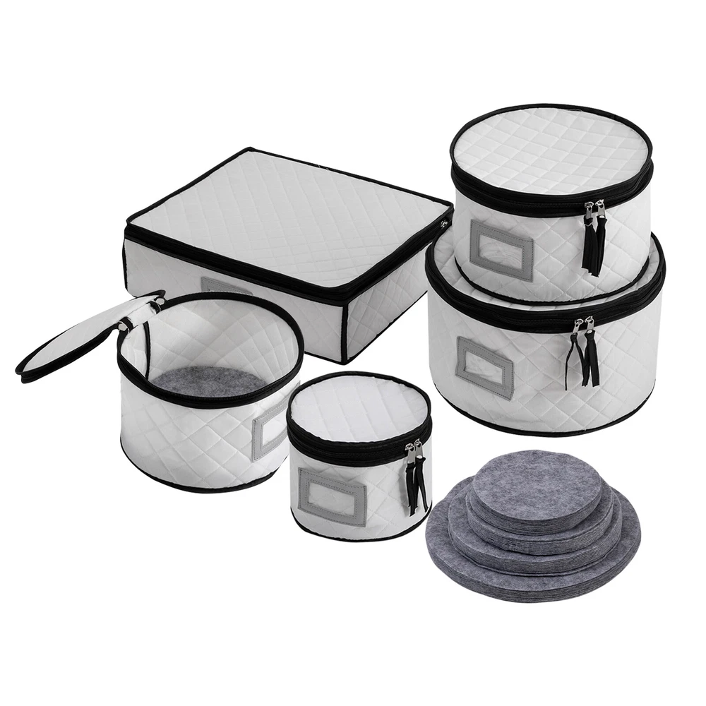 Specifications Color: Creamy White Style: Modern Shape: Round, Rectangular Material: Polyester, Sponge, Felt Fabric, Paperboard Assembly Required: No Closure Type: Zipper Number of Items: 5 Number of Compartments of the Large Organizer: 5 Four Round Organizer Size(D*H): 30*18cm/11.81*7.08inch, 25*15cm/9.84*5.9inch, 20*15cm/7.87*5.9inch, 17*15cm/6.69*5.9inch Large Rectangular Organizer(L*H): 39*11cm/15.35*4.33inch Packaging Size: 33.5*13*38cm/13.19*5.12*14.96inch Gross Weight: 2kg/4.41lbs Package Included 5* Dinnerware Storage Organizers 4Set* Plate Mats China Storage Containers with Lid , Dinnerware Storage Box for Dishes & Plates Description Are your dishes, cups, and saucers always misplaced, taking up space, or breaking by accident? You need to get yourself this dinnerware storage organizer set. It includes five organizers made of soft and elastic material and boasts a large capacity for storing and protecting your plates and cups from scratch and cracking, helping you manage your dishes effectively, and making your table and kitchen more tidy. Whether you are a housewife or a professional cooker, it is a good and indispensable helper for you. Key Features π₯ High-quality Material: It is mainly made of high-quality polyester, sponge, and paperboard with excellent wear resistance and durability, making our products the ideal protector and organizer for your plates. π₯ Kitchen Organizer: This set includes five different sizes of organizers for storing and organizing plates, cups, saucers, and other kitchenware, saving you kitchen space and meeting your daily categorized storage needs. π₯ Tableware Protector: With a soft sponge inside and polyester outside, it can protect your fragile plates, dishes, and cutlery from scratches or cracks, ensuring they remain clean, dust-free , and intact to a certain extent. π₯ Large Capacity: The four round organizers with different sizes can accommodate saucer plates, dessert plates, salad plates, dinner plates, etc., while the large rectangular one with 12 compartments can store your cups safely and orderly. Additionally, the removable partitions bring you more convenience for storing the large size of mugs. β¨ Easy to Store & Carry: They are stackable and lightweight, so you can easily move them or store them in your cabinets and pantry closet. β¨ Double-zipper Design: It not only makes it easier to open and close but also provides a good seal to keep out dust, moisture, and dirt. β¨ Ideal Gift: The convenient and practical design makes it a great housewarming, bridal, holiday, Christmas, Halloween, and New Year gift. β Customer Service: We aim to provide quality products and services. If you have any problems, please feel free to contact us. We will reply and solve the problem for you as soon as possible. Details Label Holder: You can insert your own label into the label holder of each organizer to categorize your items, helping quickly identify contents inside and allowing for easier access. Plate Mats: Soft felt fabric plate mats can separate the plates when stored in the organizer, preventing them from bumping into each other and causing accidental breakage or loss. Application It can be used to organize different types and sizes of plates in the kitchen, and easily store dinner plates, salad plates, and bowls as well as crystal glasses, goblets, champagne, wine glasses, mugs, tumblers, and coffee cups. Notes Please check the size carefully before ordering. Product capacity is for reference only and will also depend on the height of the plate. Please allow the slight color difference caused by the shooting light and 1-3cm error due to manual measurement, and make sure you do not mind before you order. Specifications Color: Creamy White Style: Modern Shape: Round, Rectangular Material: Polyester, Sponge, Felt Fabric, Paperboard Assembly Required: No Closure Type: Zipper Number of Items: 5 Number of Compartments of the Large Organizer: 5 Four Round Organizer Size(D*H): 30*18cm/11.81*7.08inch,25*15cm/9.84*5.9inch, 20*15cm/7.87*5.9inch,, 17*15cm/6.69*5.9inch Large Rectangular Organizer(L*H): 39*11cm/15.35*4.33inch Packaging Size: 33.5*13*38cm/13.19*5.12*14.96inch Gross Weight: 2kg/4.41lbs Package Included 5* Dinnerware Storage Organizers 4Set* Plate Mats Payment Delivery details Terms of sales About us Contact us Payment We accept ebay payment γ Fees such as import duties, taxes are not included in the item price or shipping costs. These charges are the buyer's responsibility. Delivery details Shipping: 2-9 working days to: USA Terms of sales We maintain high standards of excellence and strive for hundred percent customer satisfaction. Feedback is very important to us. We hope that you contact us immediately before you give neutral or negative feedback, so that we can address your concerns. It is impossible to address issues if we do not know about them! About us Your satis faction is our ultimate goal. We work hard to earn your trust and future business. Our certified technicians have tested each item before shipping. The unit comes with 1 year limited warranty on all manufacturing defects. a) If you receive a defective item, you may return it or ask for a discount. Please contact us within 14 days after you receive the package. b) What you returned must be intact and in its original packaging as re? u. Customer is responsible for shipping costs of the returned item. c) We will cover the cost of shipping back t with the shipping rate indicated in the registration page. We will send you a new unit or refund the full payment you paid. Thank you. Contact us Business Hour Business Hour: Monday To Friday: 8:30 AM to 5:00 PM (Beijing China time) Due to time zones, our reply to your questions may not be immediately. But within above working time, we will reply your email within 24 hours. If it's non-workdays, please kindly be patient and wait till Monday. Please contact us with ebay message. Please feel free to contact us if you have an