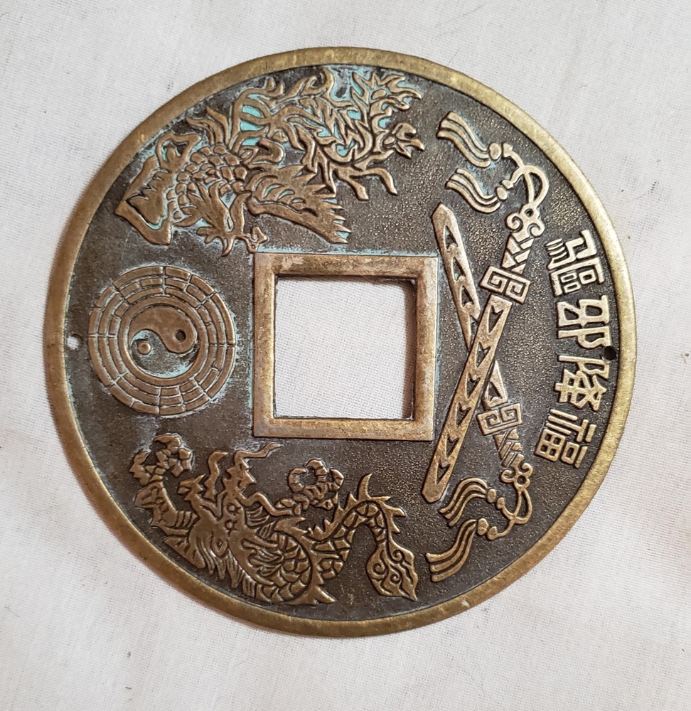 This Chinese Feng Shui Charm Coin is a 5" diameter brass/bronze talisman featuring a dragon, phoenix and yin-yang symbols, representing good fortune in Chinese culture. The charm is believed to bring positive energy and prosperity to its surroundings, making it a popular collectible item among those interested in Asian cultures and ethnicities. This talisman is a beautiful and meaningful piece that can be used for Feng Shui purposes or as a decorative item to add a touch of Chinese charm to any space.