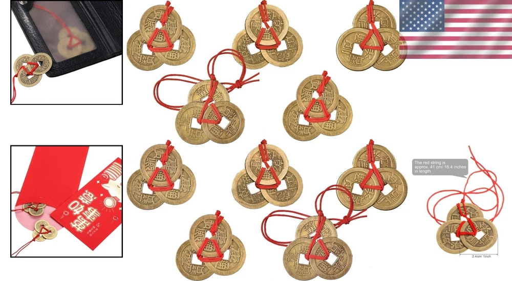 Chinese Feng Shui Coins Set - 10 Good Luck Coins with Red String for Wealth ‹ › ‹ › ‹ › ‹ › ‹ › ‹ › ‹ › ‹ › Chinese Feng Shui Coins Set - 10 Good Luck Coins with Red String for Wealth Embrace the ancient wisdom of Chinese culture with this exquisite collection of Feng Shui coins, designed not just for adornment but as a conduit for prosperity and good fortune. Each set encapsulates tradition, elegance, and a touch of mystique. Product Features: **Unique Designs:** 10 coins featuring 5 distinct styles, each representing revered Chinese emperors: Shunzhi, Kangxi, Qianlong, Yongzheng, and Jiaqing. Every emperor was a beacon of happiness and prosperity. **Symbol of Luck:** These coins are believed to attract good fortune and dispel negativity, making them a treasured talisman for personal or shared prosperity. **Versatile Wear:** Adorn yourself or your belongings; these coins can easily be tucked into your purse, wallet, or handbag, or transformed into elegant jewelry such as bracelets or necklaces. **Durable Craftsmanship:** Made from a robust metal alloy, these coins feature high-quality electroplating to resist rust and erosion, promising longevity and wearability. **Perfect Dimensions:** Each coin measures approximately 2.4 cm (1 inch) in diameter, paired with a red string that extends about 41 cm (16.4 inches), making them both functional and portable. **Generous Quantity:** The set includes 10 sets of coins, comprising 3 coins per design, providing ample tokens of good fortune for you and gifts for loved ones. Why This Set is Essential: Transform your living space and mindset with these enchanting Feng Shui coins. Infuse your life with positive energy and attract abundance, whether by placing them strategically in your home, using them as chic accessories, or gifting them to those dear to you. Perfect for any occasion, this set is not just a decorative item but a meaningful charm steeped in history and culture. Invest in your fortune today and carry the legacy of China’s great emperors wherever you go. Shipping Free & Fast Shipping - We offer free shipping to most of the USA with a normal delivery time of 3-7 days. However, due to the current situation, additional delivery time (up to 3 weeks) may be required for some items. Alternative Carriers - We may use alternative carriers (e.g. USPS, FedEx, UPS, etc.) to ensure your package arrives safely and on time. Due to the use of multiple carriers, we are unable to provide a tracking number automatically. Handling Time - Orders are processed and shipped within 1-2 business days of receiving cleared payment. Shipping Restrictions - Shipping to Alaska, Hawaii, Puerto Rico, Guam, and other US territories may incur shipping charges or delivery restrictions. Please contact us before ordering, or your order can be refunded/cancelled. State Restrictions - There may be restrictions based on your state of purchase. For example, certain items may not be shipped to California due to state regulations. Contact for Tracking Updates - If you require tracking updates or have any concerns about the delivery of your order, please feel free to contact us, and we will be happy to assist you. Return 30-Day Hassle-Free Returns - We want you to be completely satisfied with your purchase. If you are not, you can return the item within 30 days of receiving it for a full refund or exchange. Easy Return Process - To start a return, simply contact us and we will provide you with a prepaid return shipping label and detailed instructions. Restocking Fee - There are no restocking fees for returns. However, the buyer is responsible for return shipping costs if the return is not due to a seller's error. Refund Processing Time - Refunds will be processed within 5 business days of receiving the returned item in its original condition. Payment We accept all major credit cards, PayPal, and Apple Pay for your convenience. Your payment information is secure and encrypted to ensure a safe and seamless transaction. Please complete your payment within 3 days of purchase to avoid any delays in shipping. Feedback Your feedback is extremely important to us. We strive to provide the best products and customer service possible. If you are satisfied with your purchase, please take a moment to leave us a positive review. If you have any concerns or issues with your order, please contact us before leaving negative feedback. We are committed to resolving any problems and ensuring your satisfaction. Contact Us If you have any questions or concerns, please feel free to reach out to our customer support team. You can contact us through the eBay messaging system. We are available Monday to Friday, 9:00 am to 5:00 pm EST, and we will do our best to respond to your inquiry within 24 hours. Buy it now and enjoy a pleasant shopping experience! UPC: Not Set Unit Quantity: 10 Unit Type: Unit