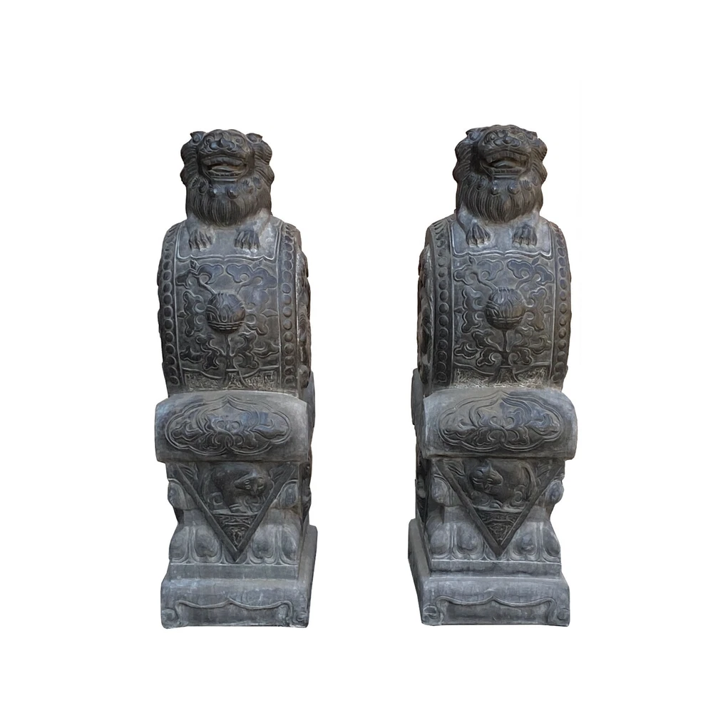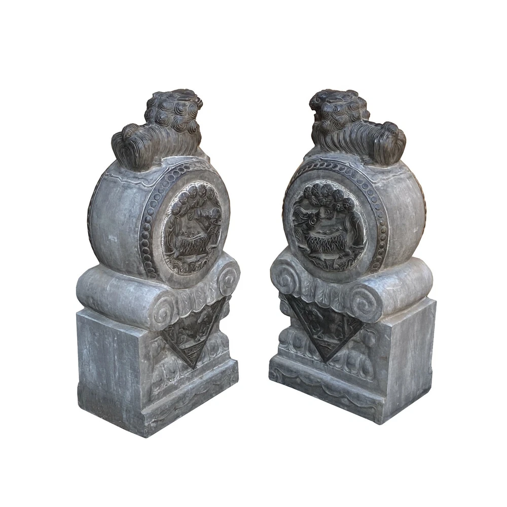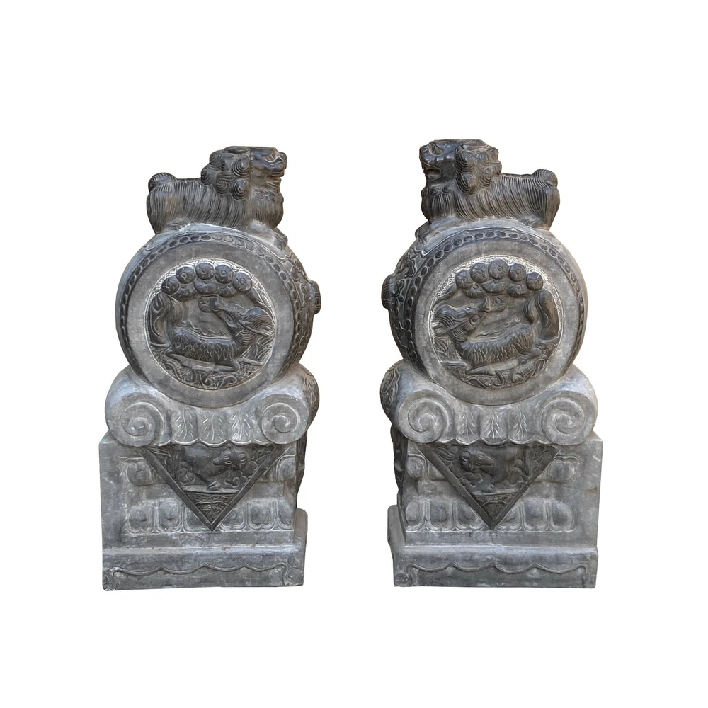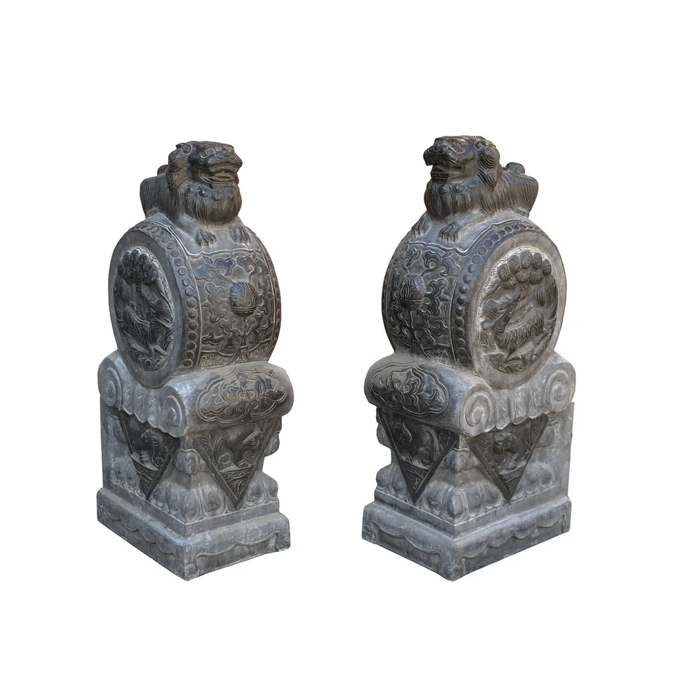 Chinese Pair Black Gray Stone Fengshui Foo Dogs Drum Statues cs7219