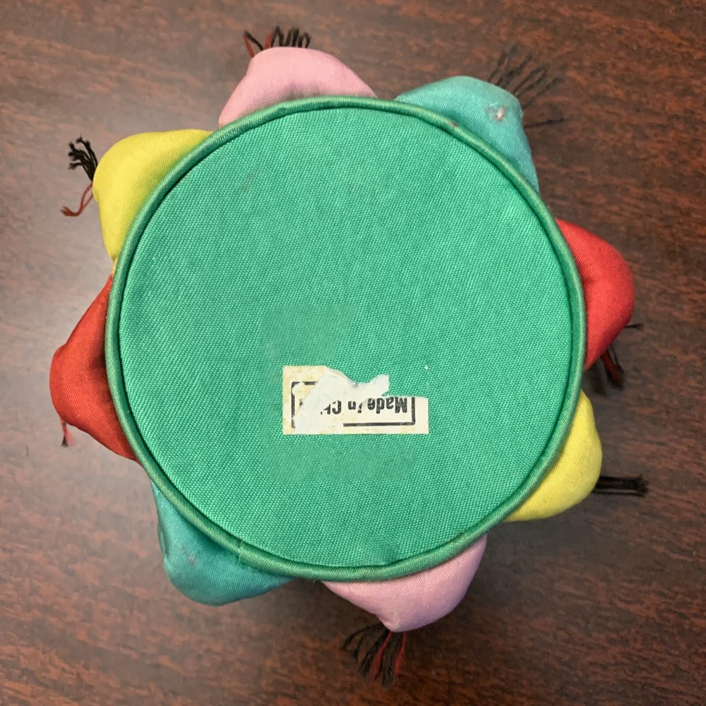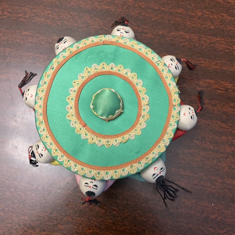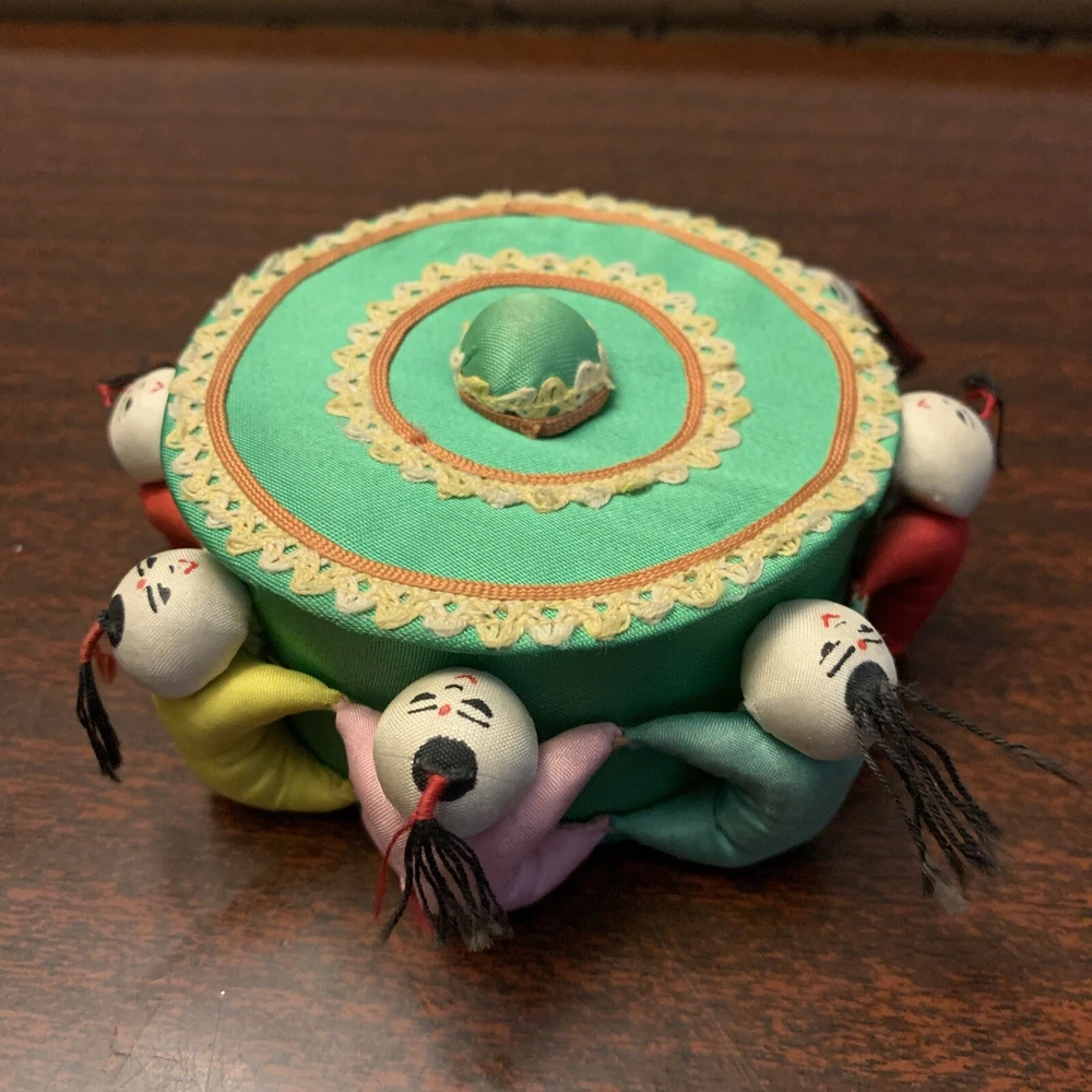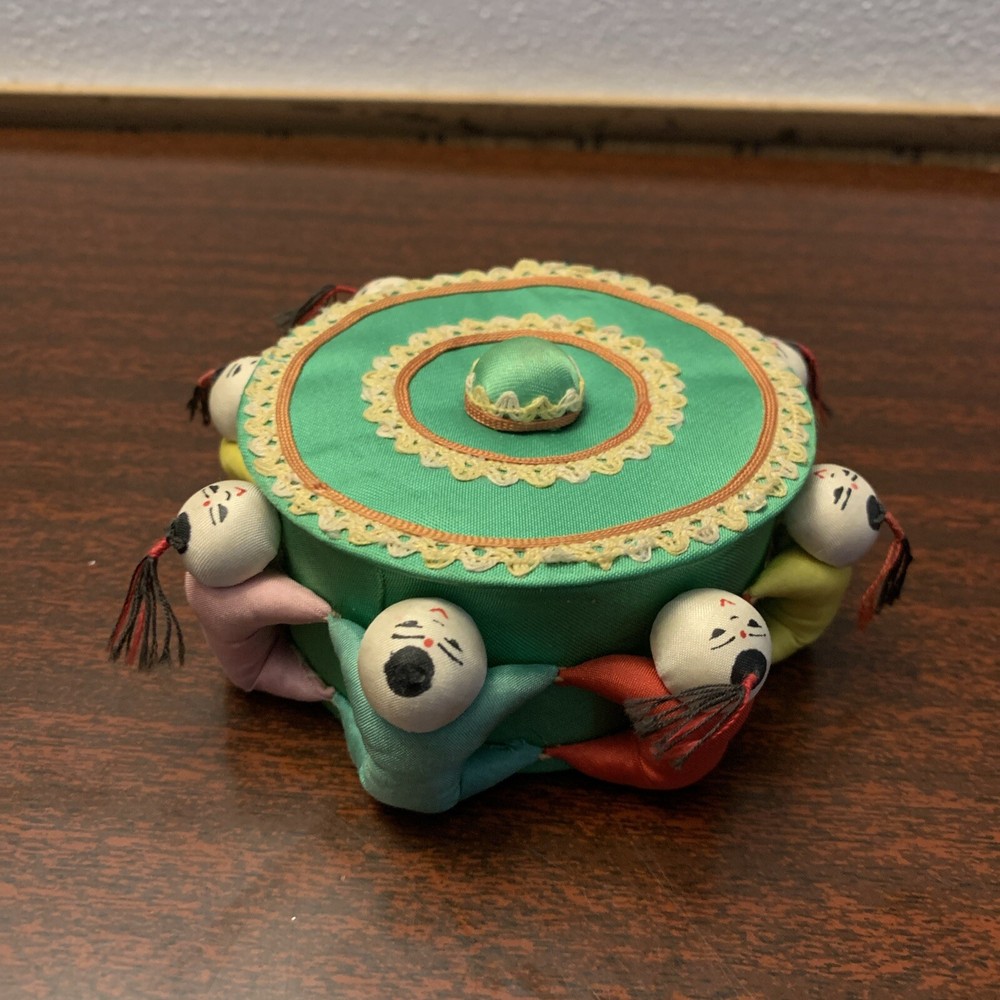 Decorative Round Chinese Trinket Box, 3.25" DIA x 1.5" H Probably vintage, possibly used to keep sewing supplies One of mini-persons surrounding the box is missing it's hair and a couple of slight tears on their bums