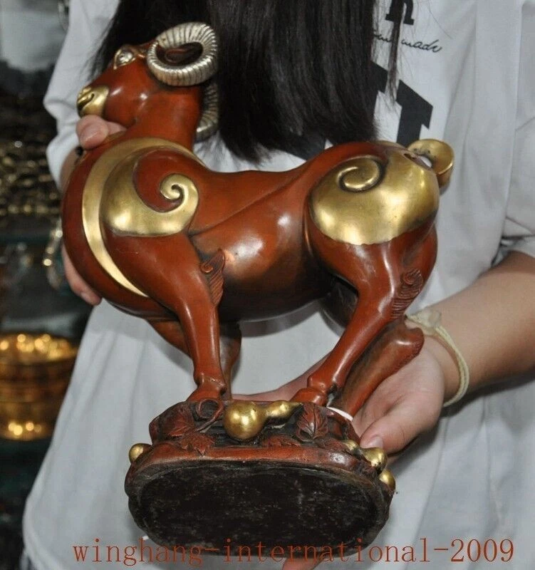 Chinese ancient bronze Gilt Fengshui wealth Zodiac Year animal sheep statue Size: Height : 13.2 inch .Long : 9.2 inch . breadth : 4.4 inch Size: Height:33 CM .Long:23 CM . breadth:11 CM Weight: 4.5 KG----included the weight of packing materials Materials : bronze Gilt Condition: Good condition Origin: China