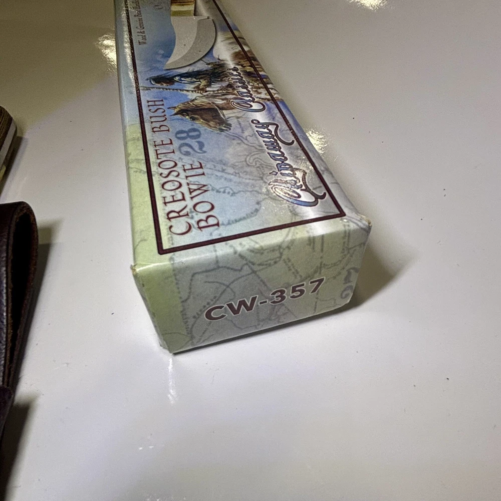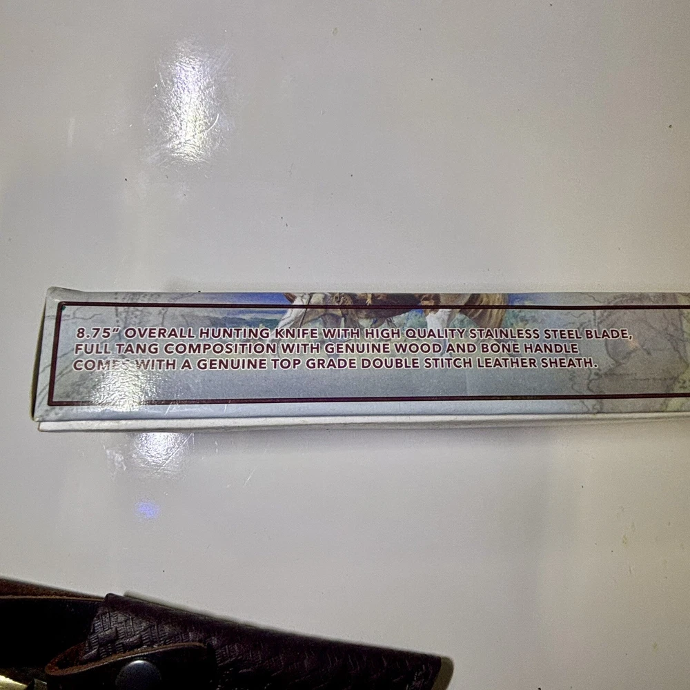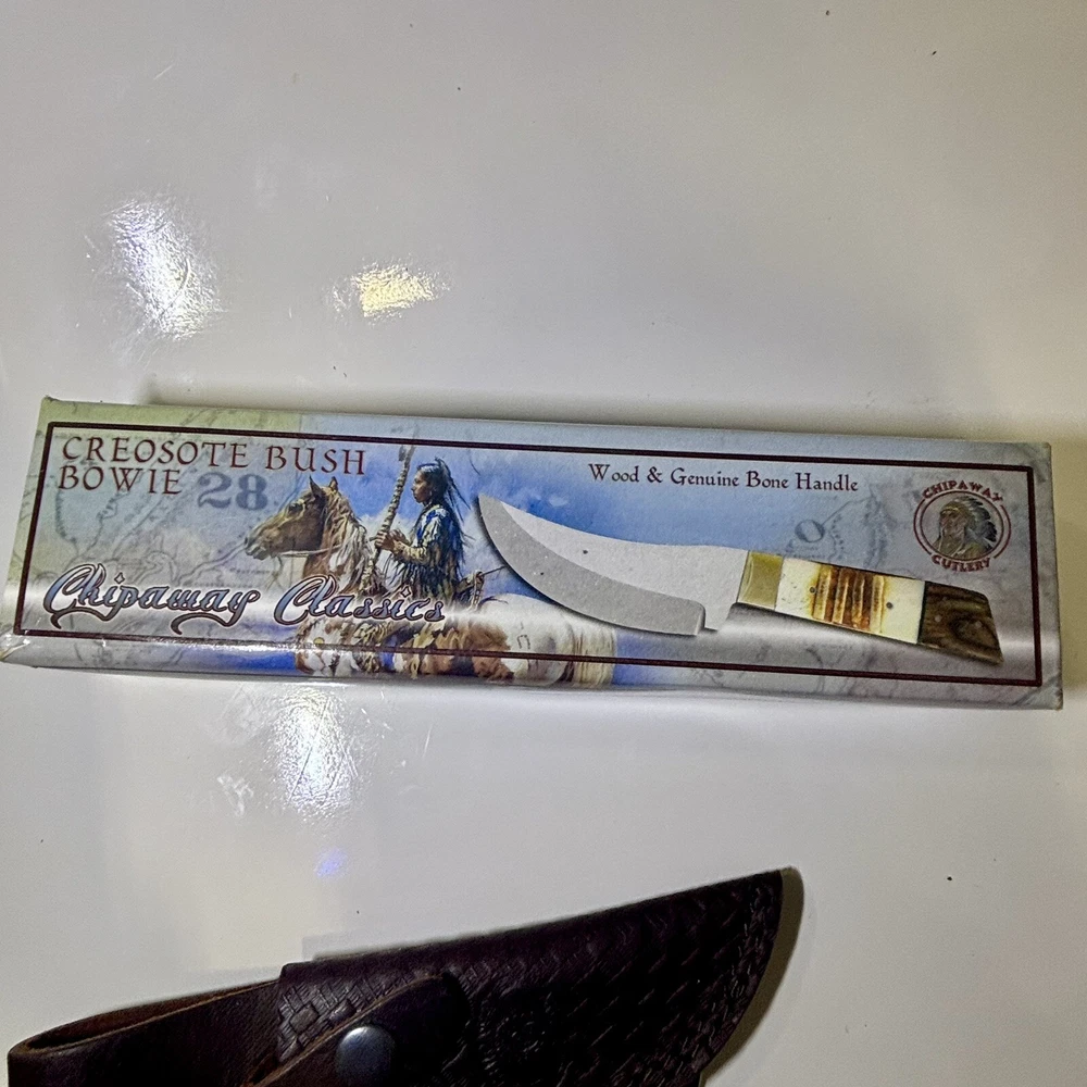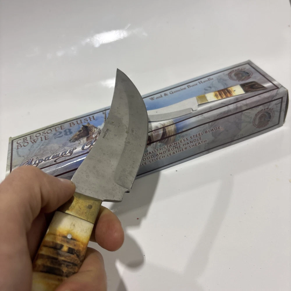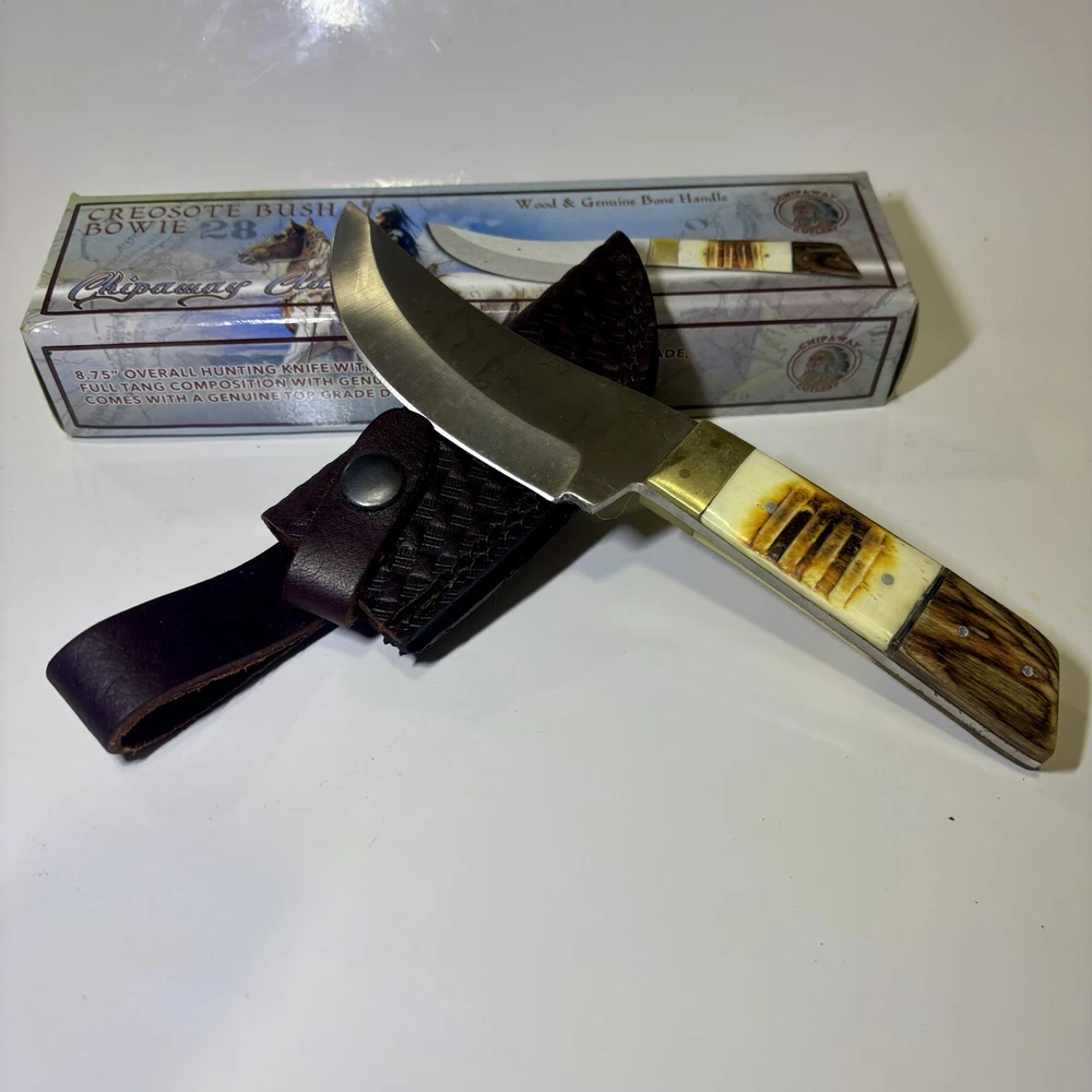 The Chipaway Cutlery Creosote Bush Bowie Knife features a stainless steel blade with a plain edge and a full tang for strength. The handle is made of bone and wood, providing a secure grip. This ambidextrous knife comes with a leather sheath for safe storage and transport. With a blade length between 4.1 to 5 inches, this collectible fixed blade knife is both functional and visually appealing.