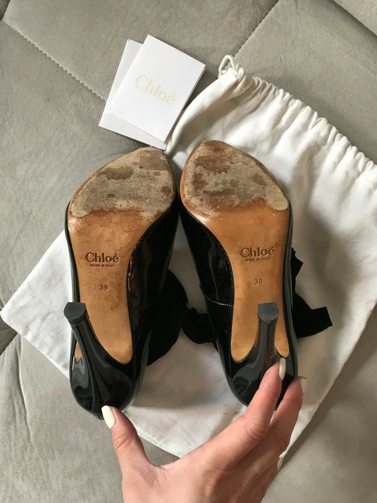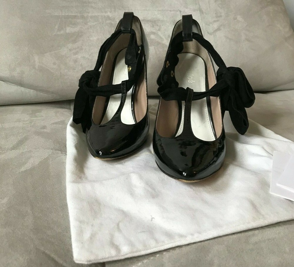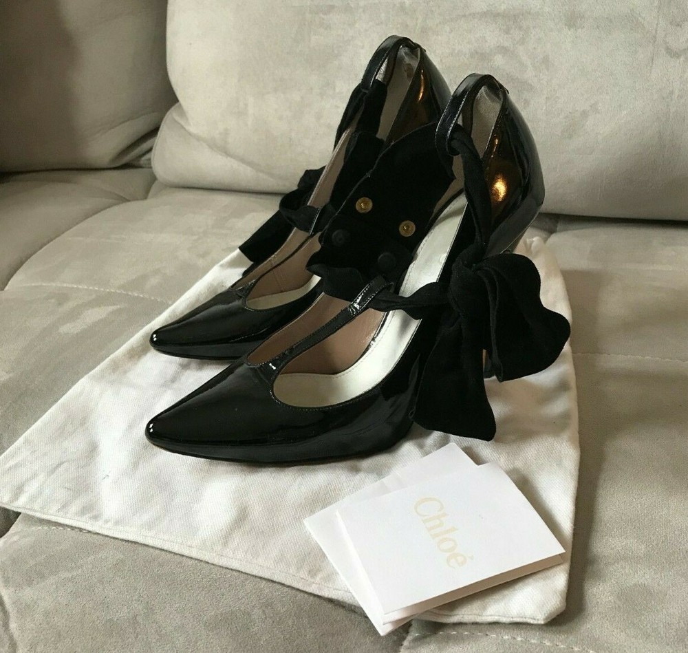 CHLOÉ PRE-OWNED | Fall 2011 Velvet Bow Patent Leather Heels | Size 39 Classic Black Edition **BEST FLASH SALE YET - 15% OFF EVERYTHING!!**Regular eBay pricing: CAD $249.99 DETAILS These black patent leather Chloé heels have a velvety suede bow on top, creating a classic and timeless look. Covered heel and leather sole. Leather: Patent leather. Made in Italy. MEASUREMENTS Heel: 4.5in / 115mm CONDITION Impeccable condition - barely been used, always stored in dust bag, what you see is what you get. Bought in the Big Apple, original retail value: $850 CAD Authenticity card and original dust bag included with this item. You are welcome to ask questions in regard to any listing or combination of items of interest.