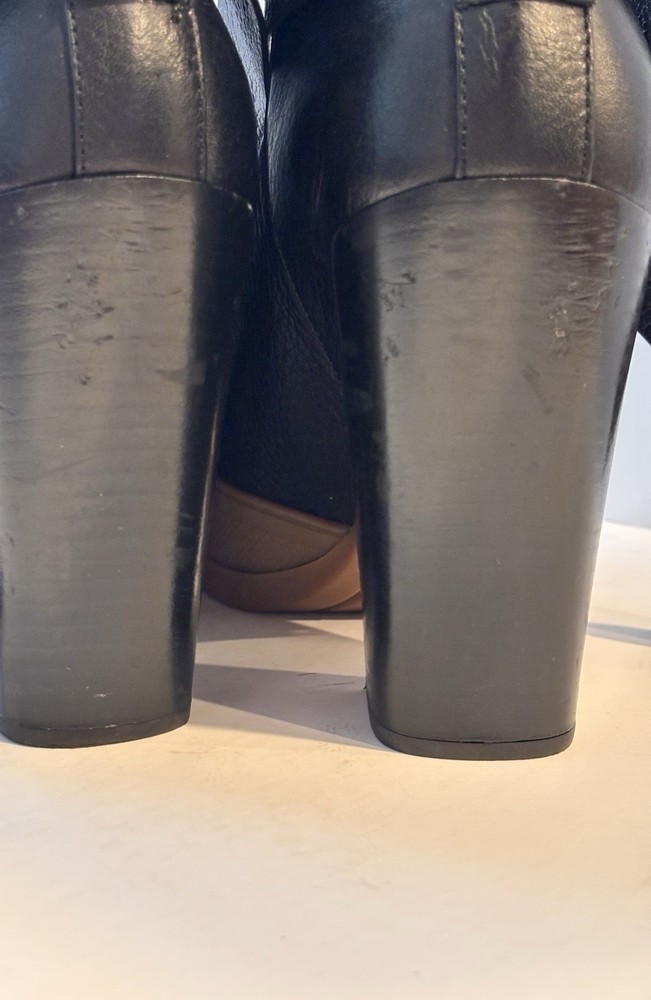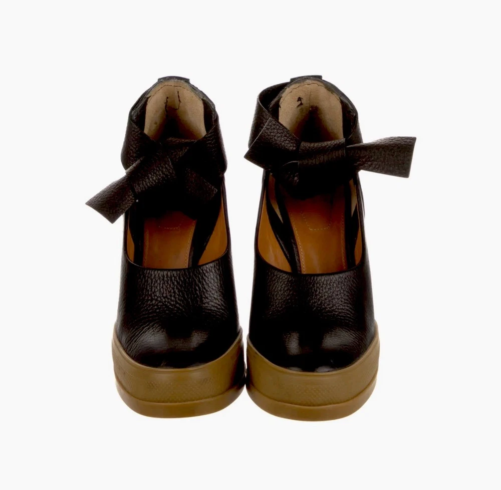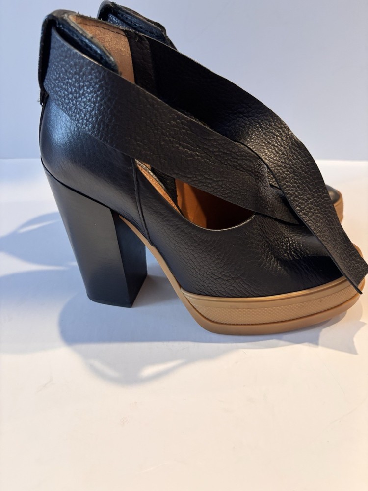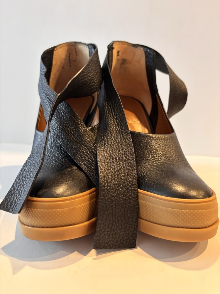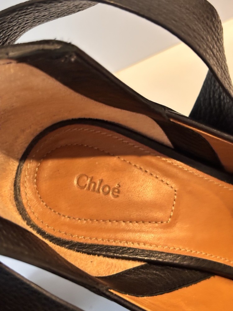 Description • Chloé Leather Slingback Pumps • Black • Rubber Trim • Round-Toes • Platform • Crossover Straps & Tie Closures • 4.5 inch heel Designer Fit: EU 8.5 Pumps by Chloé typically run a half size small. Both Vibes ‼️ Some dents in heel. Really good used condition