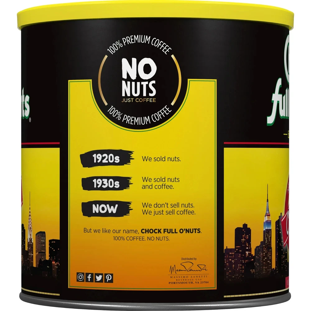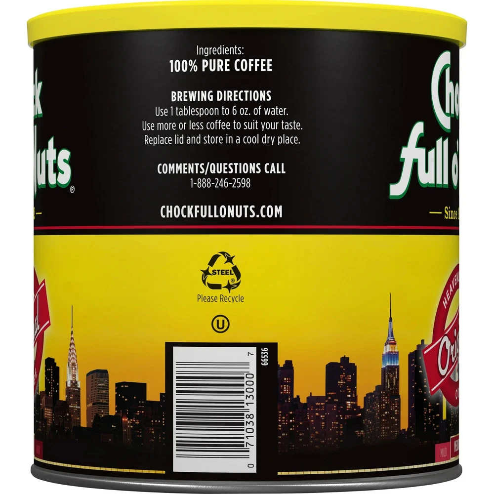 ABOUT THIS ITEM: PRODUCT DETAILS: Enjoy the rich and flavorful taste of Chock Full o'Nuts® Original Blend Ground Coffee. This medium-roasted coffee is perfect for any coffee lover who wants a satisfying and delicious cup of coffee. With a 30.5 oz. can, you can enjoy your favorite beverage for weeks to come. This ground coffee is perfect for any pantry and is a must-have for any coffee lover's collection. Whether you're making coffee at home or in the office, this Chock Full o'Nuts® coffee is sure to impress. So why wait? Get your hands on this delicious coffee today!