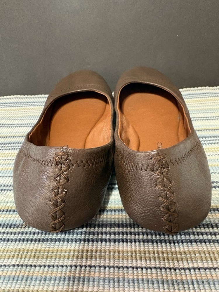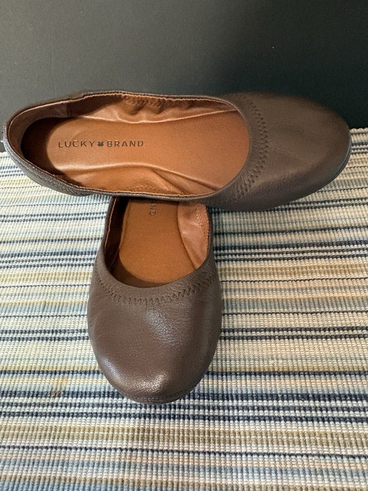 These Chocolate Brown Lucky Brand Ballet Flats in size 6 are a stylish and comfortable choice for casual occasions. With a solid brown color, round toe shape, slip-on closure, and leather upper material, these flats are a versatile addition to any woman's wardrobe. The ballet style and brand name add a touch of sophistication to these classic flats.