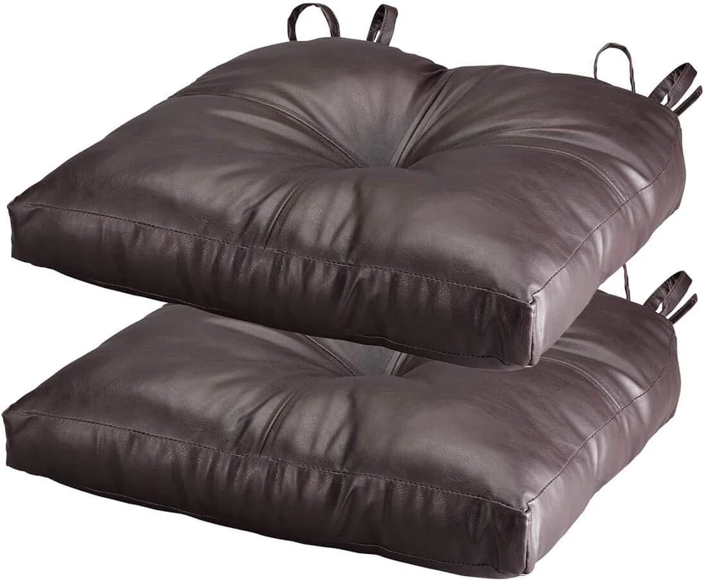 Set of 2 Made with easy-care polyester 15" long x 15 3/4" wide x 4" high Two ties secure easily to chair Spot clean Offering the rich look of leather without the expense, our cushioned pad turns any chair into a comfy one--giving you a little boost of height, as an added bonus! The 4" thick pad is tufted for added style; two ties secure it easily to chair. Polyester; spot clean. 15"Lx15 3/4"Wx4"H. Set of 2.