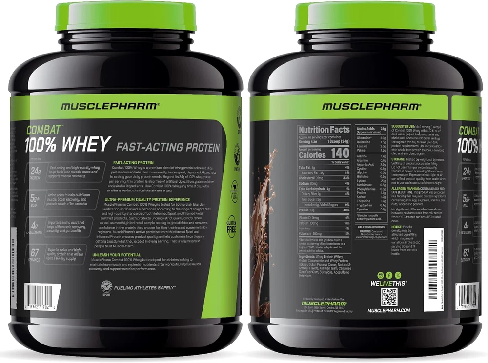 Peak Muscle Recovery & Gain: MusclePharm Combat 100% Whey is the go-to protein powder for those who demand excellence. Each serving offers 24g of protein from and premium whey protein isolate & and concentrate. Fast Digesting Protein Powder for Enhanced Athletic Performance: Engineered for maximum protein concentration and minimal carbs, whey protein isolate powder digests and absorbs rapidly. Whey protein concentrate contains real subtractions and is digested similar to the way whole food would be. Tastes Great & Mixes Easily: 70 servings of mouthwatering Chocolate Milk flavor, tastes great so you'll enjoy this protein boost. Shake & and take pre or post-workout to achieve your fitness goals faster and more efficiently. Crafted by Experts, Delivered with Excellence: MusclePharm Combat 100% Whey is dye-free, gluten-free, banned substance tested and certified by Informed-Choice and Informed-Protein, so athletes can take it with confidence. Unleash Your Potential: Our mission is to fuel the relentless pursuit of greatness among athletes. Our cutting-edge, science-backed formulas optimize physical performance, enhance recovery, and ensure you have the tools you need to conquer new heights and redefine your limits. Product Description Performance & Recovery Build, Boost & Recover Combat 100% Whey protein is optimized to benefit overall nutrition, muscle growth and recovery. Ultra-Premium 100% Whey 24g Protein Per Serving Includes high quality sourced pure whey protein isolate & concentrate. Banned substance tested. Optimized for Results Fast-Digesting Isolate Combat Whey powder delivers an immediate energy boost as well as sustained muscular support. Easy Delivery Scoop, Shake & Enjoy Day or Night Mix 1 scoop Combat Whey Protein Powder with 8-12 fl. oz. of cold water and shake. Consume any time. 1 PRODUCT BENEFITS 2 INGREDIENT HIGHLIGHTS 3 WHY COMBAT 100% WHEY 4 SUGGESTED USE What is whey protein and why do athletes and serious trainers ensure it is part of their routine? Whey protein is a high-quality protein rich in essential amino acids, easily digestible and absorbed quickly by the body. It offers a wealth of benefits, including supporting muscle growth and recovery, as well as overall nutrition and vitality. Why is it beneficial to include both Whey Isolate and Concentrate in a high protein powder? Whey isolate absorbs quickly, offering an energy spike and amino acid boost, while concentrate digests like whole food, supporting sustained growth and recovery. When and how should MusclePharm Combat 100% Whey Protein be consumed? Mix with water or milk and consume whey protein powder post-workout and any time of the day in shakes, smoothies, and other recipes to meet daily protein requirements. MusclePharm Combat 100% Whey can also be enjoyed pre workout for an energy boost. How much protein does each serving of MusclePharm Combat 100% Whey Protein Powder provide? Each serving of MusclePharm Combat 100% Whey Protein Powder delivers a robust 24 grams of high-quality protein with zero additives making it an excellent choice for athletes and individuals looking to fuel their muscles effectively. Is Combat 100% Whey Protein Powder suitable for individuals with dietary restrictions? Combat Protein Powder is gluten-free, making it suitable for those with gluten sensitivities or preferences. Additionally, it's banned-substance tested and certified, ensuring safety and quality for athletes and health-conscious individuals. The video showcases the product in use. The video guides you through product setup. The video compares multiple products. The video shows the product being unpacked. hero-video Merchant Video At MusclePharm we believe every athlete is a champion within. We are committed to delivering superior nutrition and support that amplifies your training and propels your athletic potential. More from MusclePharm Complete Your Routine Add to Cart Add to Cart Add to Cart Add to Cart Add to Cart Add to Cart Customer Reviews 4.6 out of 5 stars 5,777 4.6 out of 5 stars 16,969 3.8 out of 5 stars 81 4.5 out of 5 stars 3,300 4.5 out of 5 stars 642 4.5 out of 5 stars 7,052 Price $84.99 $ 84 . 99 $69.99 $ 69 . 99 $29.99 $ 29 . 99 $29.99 $ 29 . 99 $19.99 $ 19 . 99 $24.99 $ 24 . 99 Key Ingredients Whey Protein Isolate 5 Source Whey Protein Powder Essential Amino Acids + BCAAs Pure 100% Creatine Monohydrate Pure L-Glutamine Amino Acid Branched Chain Amino Acids Key Benefits Fast Recovery & Muscle Gain Muscular Strength & Endurance Muscle Recovery & Energy Muscle Growth & Strength Muscle Recovery & Gut Health Muscle Recovery & Energy Best Time to Take After workout, day or night After workout, day or night Pre, post, or during training Pre workout or just after After workout, day or night Pre, post, or during training Supplement Form Protein Powder Protein Powder Amino Acids Powder Creatine Powder Post Workout Powder Amino Acids Powder Stim/Stim Free Stim Free Stim Free Stim Free Stim Free Stim Free Stim Free Flavor Variety of flavors Variety of flavors Variety of flavors Unflavored Unflavored Variety of flavors Gluten Free ✔ ✔ ✔ ✘ ✘ ✘ Banned Substance Tested ✔ ✔ ✔ ✔ ✔ ✔ GMP Certified Facility ✔ ✔ ✔ ✔ ✔ ✔