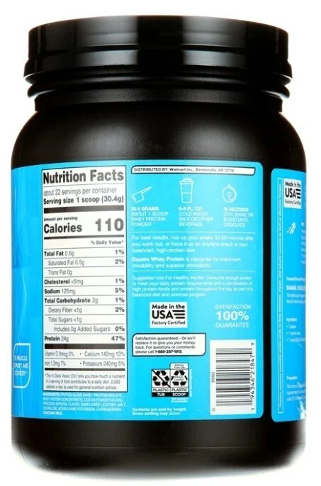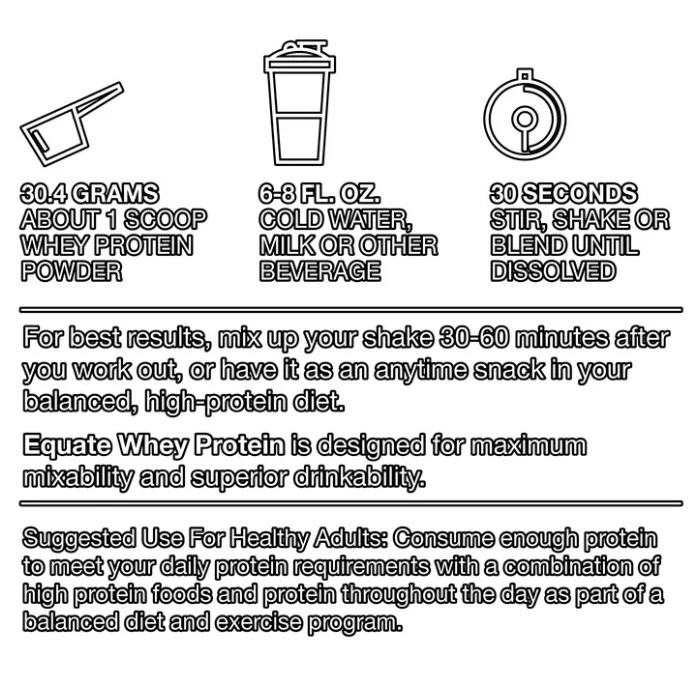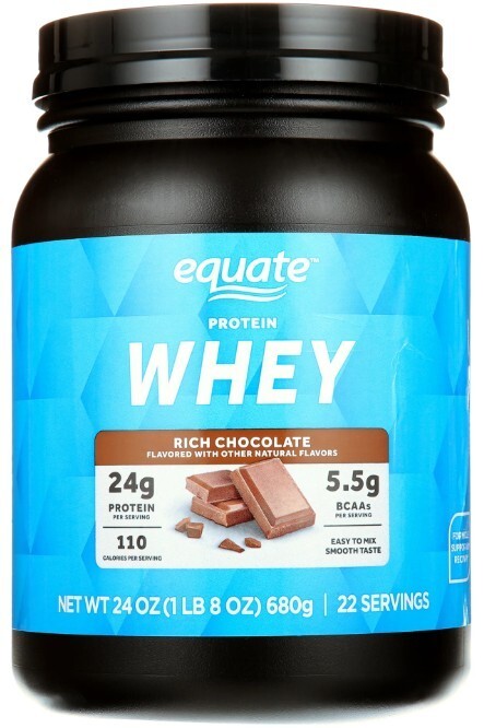 DO NOT SHIP TO NEW YORK Whey Protein Powder, Rich Chocolate, Mix With Cold Water, 22 Servings, 24 oz. Product details Equate Whey Protein Powder is a high-quality protein supplement designed to contribute to the growth and maintenance of muscle mass. Each serving delivers a whopping 24 grams of protein, making it an effective way to meet your daily protein needs. Along with this, it provides 5.5 grams of BCAAs per serving, which are crucial for muscle recovery and growth. The primary ingredient of this protein powder is Whey Protein Isolate, known for its high protein content, rapid digestion, and rich supply of amino acids. The chocolate flavor adds a smooth and delicious taste. This versatile protein powder can be conveniently consumed at any time - before or after workouts, in between meals, with meals, or whenever you need an extra protein boost. Equate Whey Protein Powder is an excellent choice for those looking to supplement their protein intake and support their fitness goals. Making the right health decisions can be challenging. With a complete range of products and simple solutions, Equate allows you to take care of your family with confidence. Equate Whey Protein Powder, Rich Chocolate, 24 oz With 24g of protein per serving, this product helps you meet your daily protein requirements for muscle growth and maintenance Each serving provides 5.5g of BCAAs, essential for muscle recovery and growth The #1 ingredient is Whey Protein Isolate Comes in a rich chocolate flavor, making it a tasty addition to your fitness regimen 22 servings Mix with cold water, milk, of other beverage