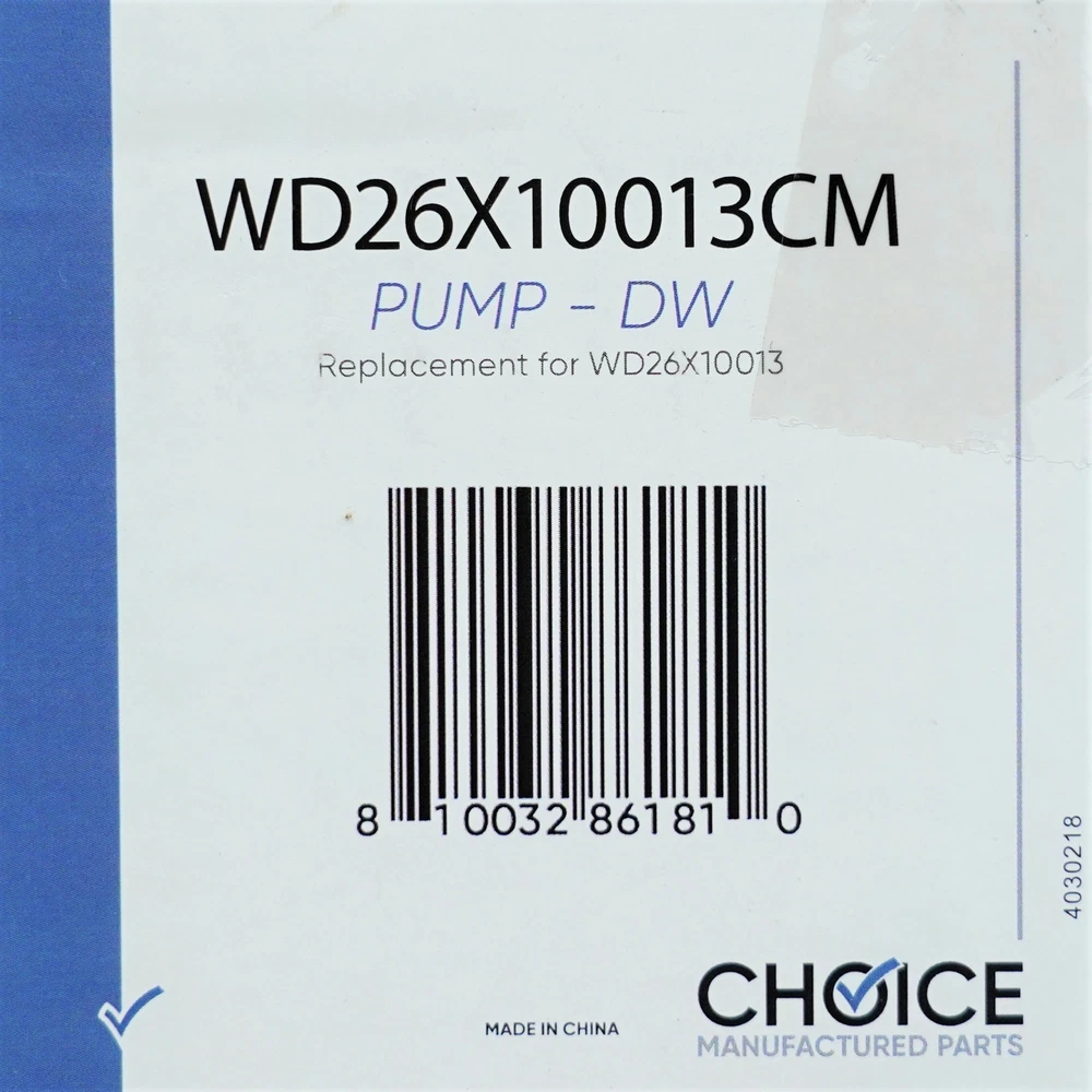 Compatible Brand: For GE Model Number: WD26X10013 gtin13: 810032861810 Model: Universal WD26X10013CM Type: Pump Suitable For: Dishwasher MPN: WD26X10013CM Brand: Universal UPC: 810032861810 Product Type: Water Pump Country/Region of Manufacture: China Manufacturer: Choice Manufactured Parts Power Source: Electric Installation: Freestanding