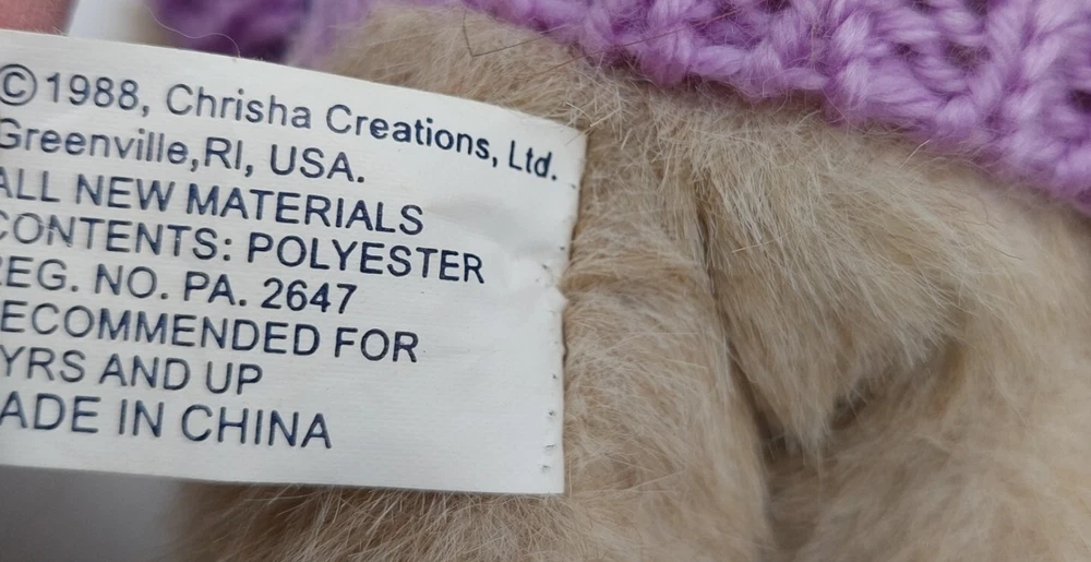 Type: plush Brand: CHRISHA CREATIONS LTD Color: Brown Animal: bunny Country/Region of Manufacture: China Character Family: Bunny( easter ) Occasion: Easter Size: 11" Recommended Age Range: 3 gtin13: Does not apply UPC: Does not apply Year: 1988