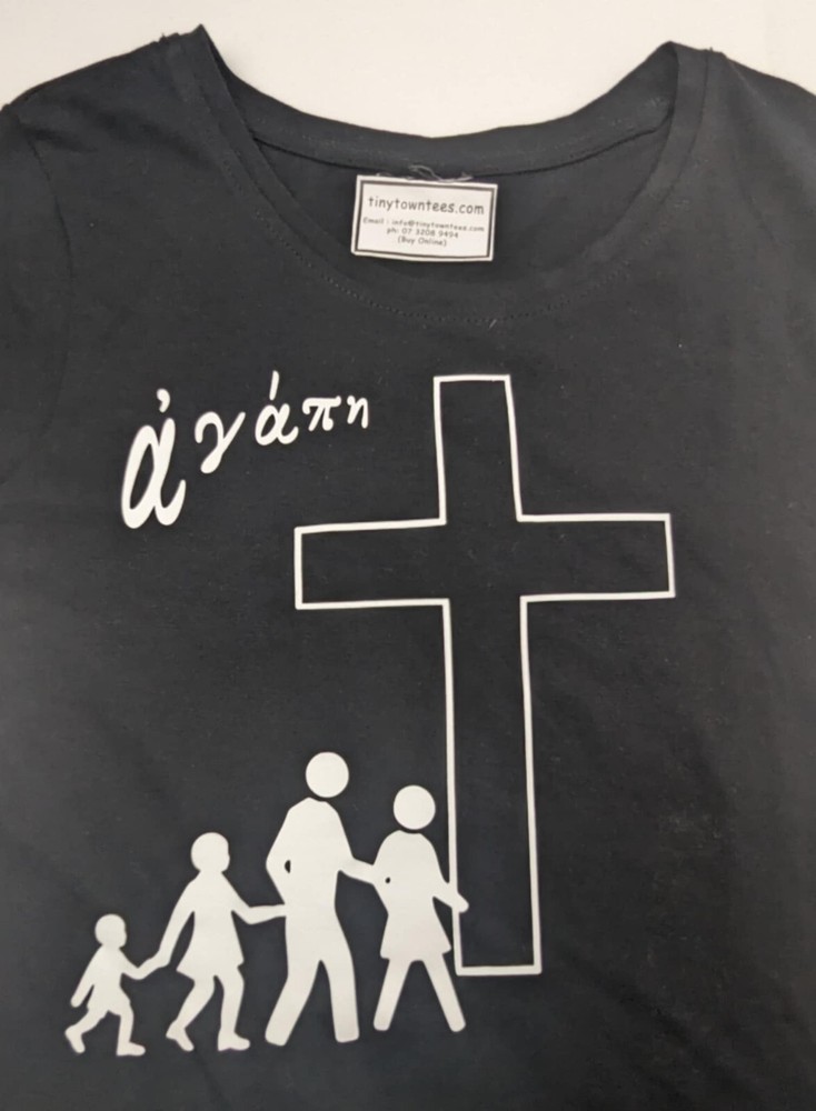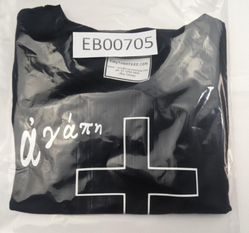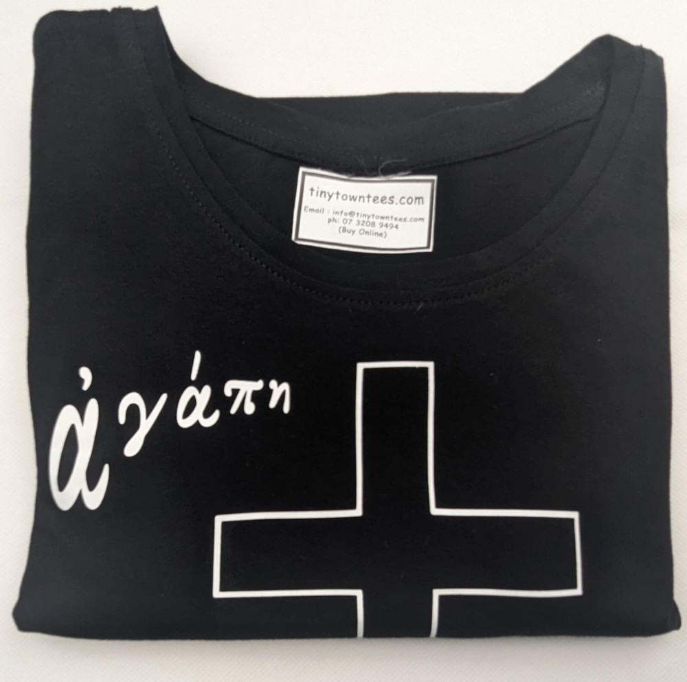 This Christian t-shirt from Tiny Town Tees features a black cotton fabric with a round neckline and short sleeves. The shirt is emblazoned with a white "CROSS" print and the iconic Agape cross accent. Perfect for kids size 8, this relaxed fit t-shirt is an ideal addition to any Christian wardrobe. Hand wash only, this shirt is part of the Tiny Town Christian Shirts product line. EB00705 BIN 012