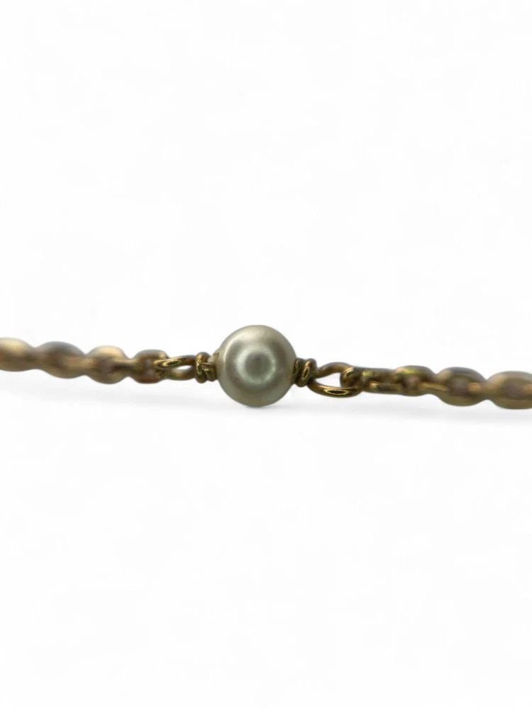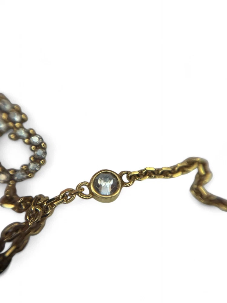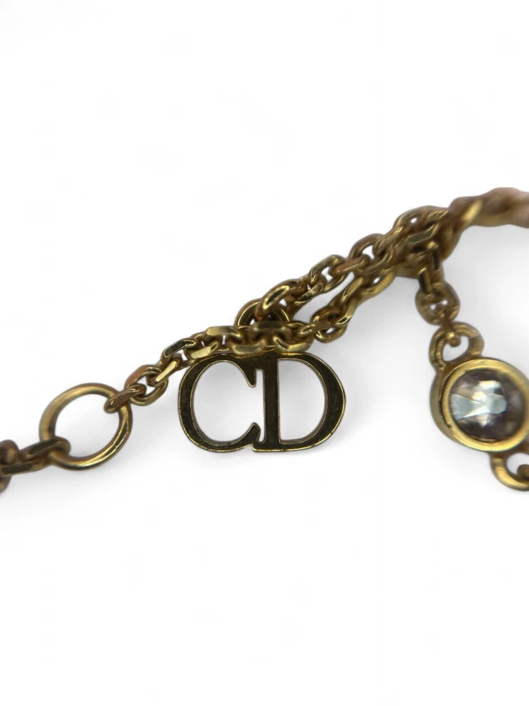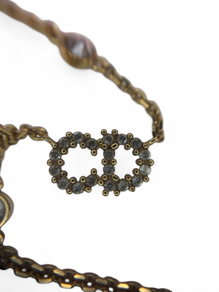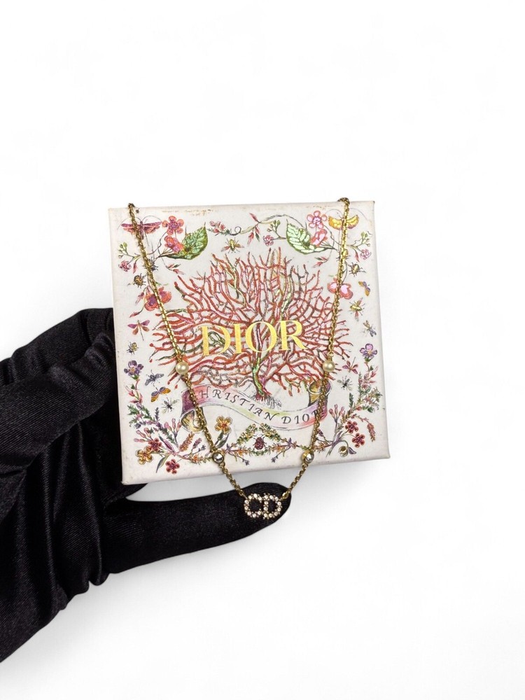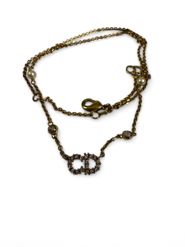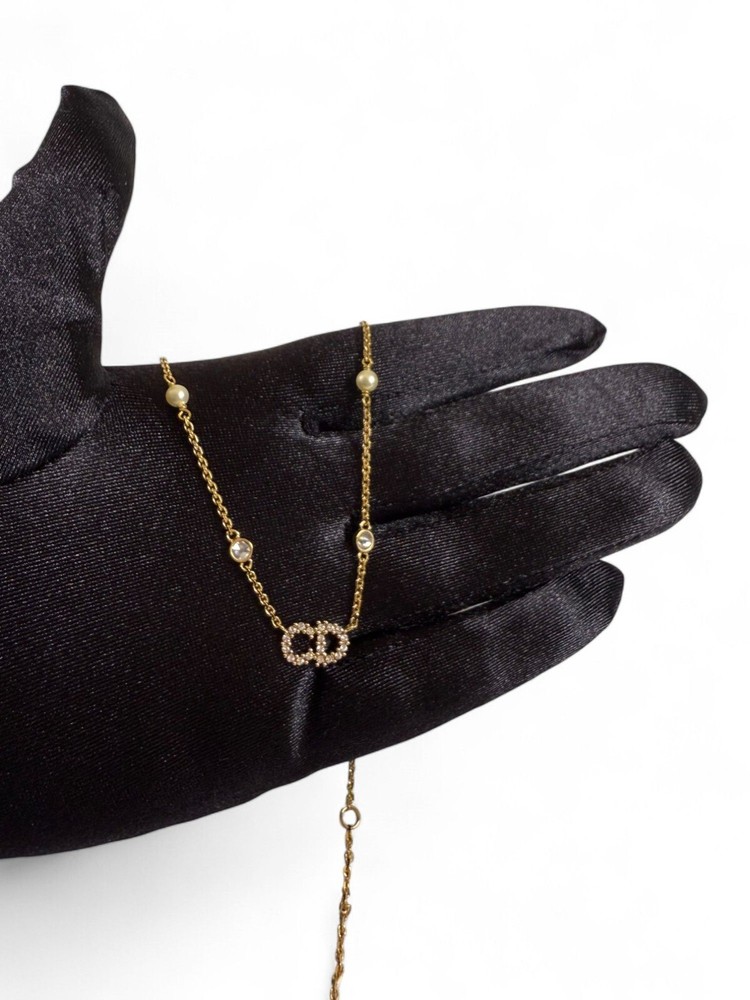 Modern and versatile, this Christian Dior CD logo necklace features a sparkling crystal-set double-D pendant accented with petite pearl beads along a gleaming gold-tone chain. The adjustable 15″–16.5″ chain allows you to wear it at collarbone length for a refined daytime look or slightly longer over a little black dress for evening cocktails—effortlessly elevating casual jeans and a tee or adding delicate luxury to formal attire. Includes original Dior box and pouch. Size: 15″–16.5″ adjustable chain, pendant 0.43″×0.28″|Excellent condition