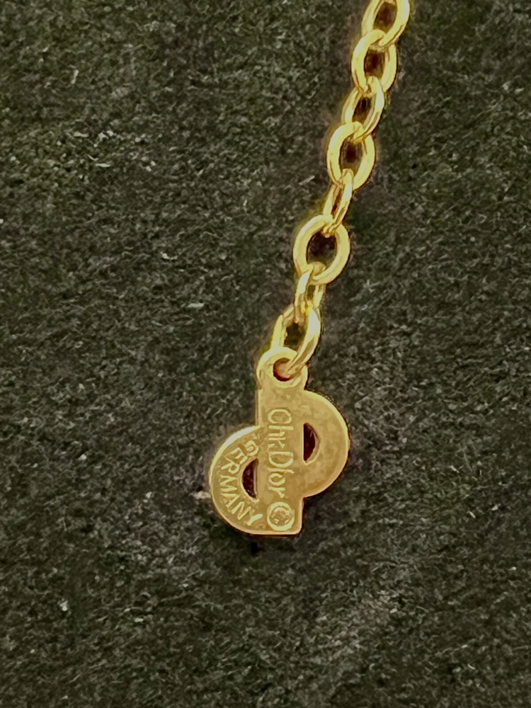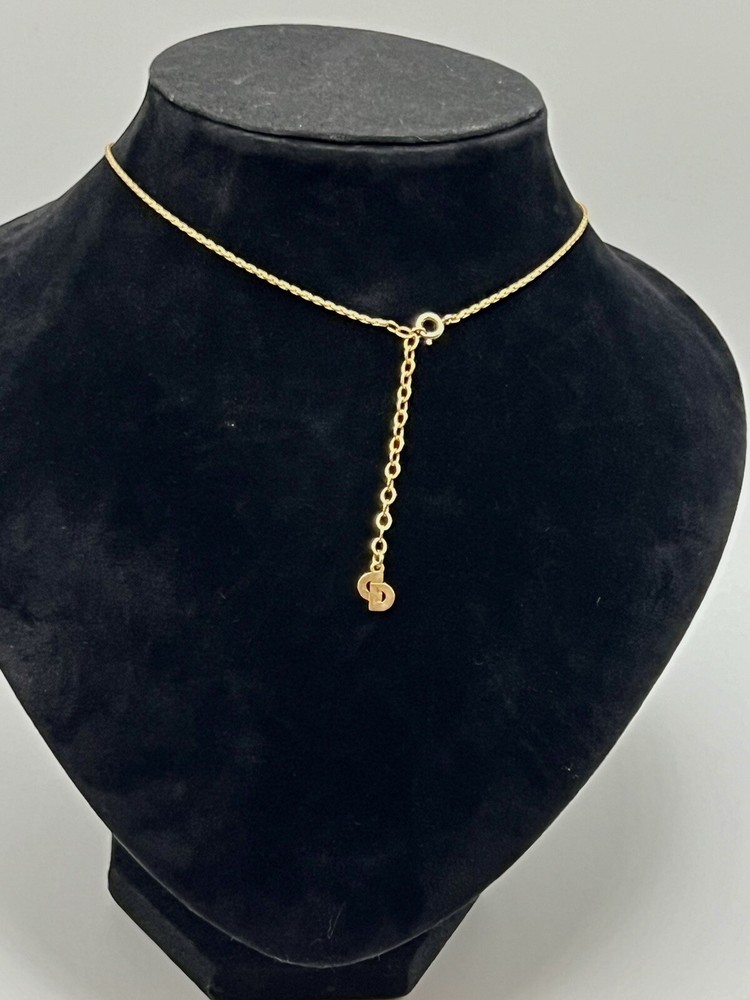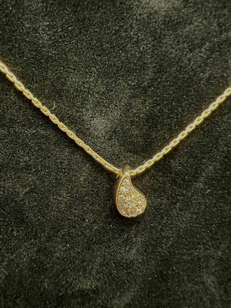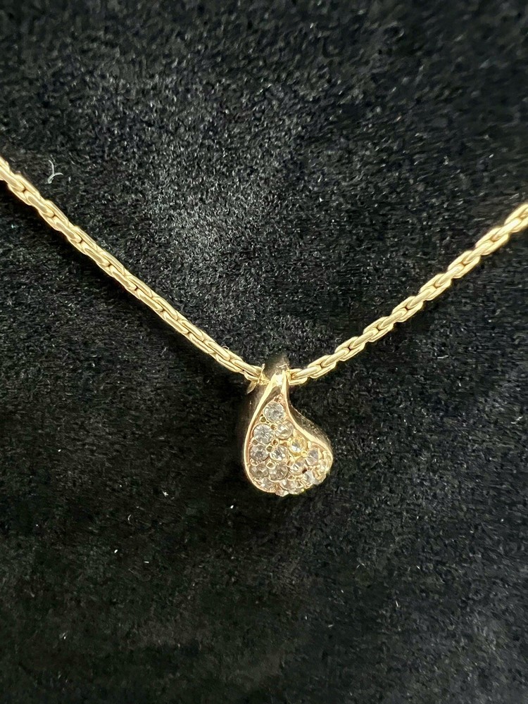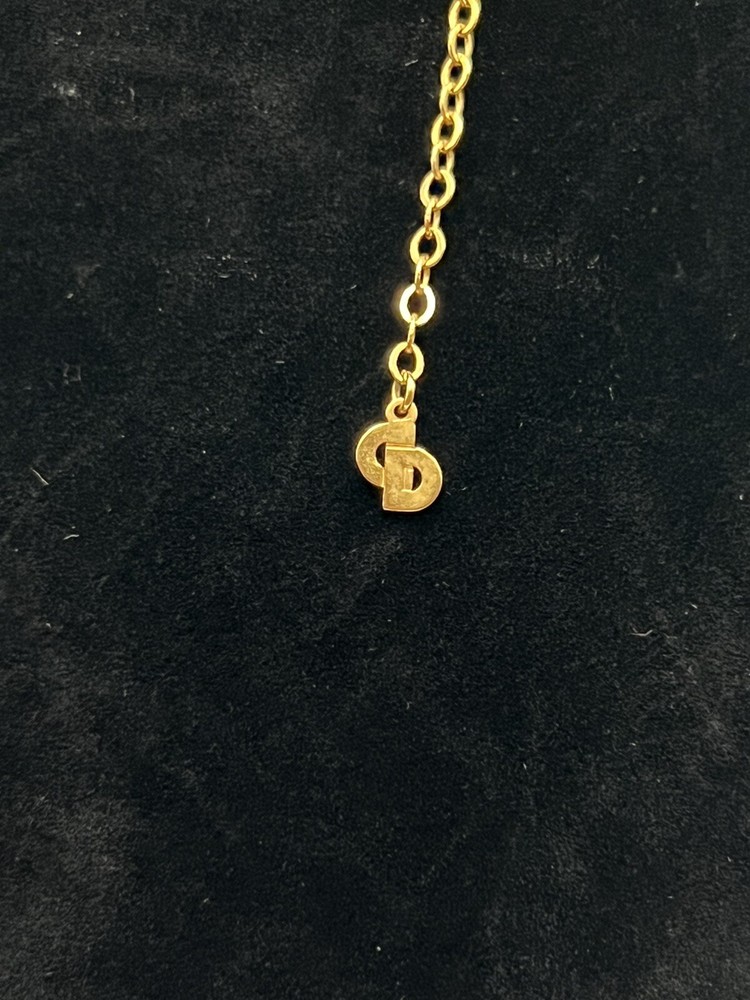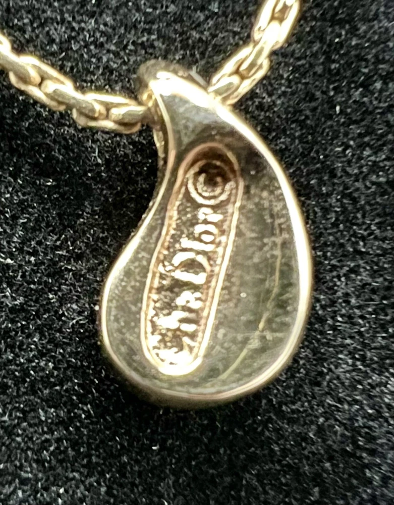 Please refer to photos for product condition and information. Add a touch of luxury to your outfit with this stunning Christian Dior necklace. The teardrop-shaped pendant features a dazzling diamond set in yellow gold, giving it an elegant and timeless look. The necklace is perfect for any occasion and is sure to make a statement. The brand is well-known for its high-quality fashion jewelry, and this necklace is no exception. It is crafted with attention to detail and features a chain style. The pendant is the perfect size and shape, making it a versatile addition to any collection.