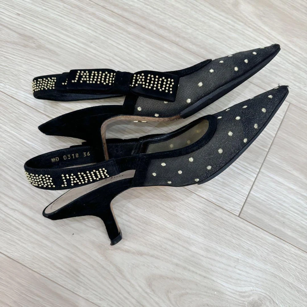 Christian Dior Shoes Pumps Heel J'ADIOR Dot Slingback EU 36 US 6 Black Used Ex+ Description Christian Dior J'ADIOR Slingback Pumps with Polka Dots Brand: Christian Dior Size: 36 (Approximately 23 cm or 9.1 inches) Color: Black Material: Tulle with Velvet Polka Dots Condition: - Fraying at the toe area - Sole branding faded - Sole has been resoled All of Items Will be Shipped From Japan. Please check with the image. About the condition Damages such as stains, scuffs, and scratches are listed only if they are noticeable. Please understand that this is a used item, so there may be some inconspicuous scuffs or signs of use even if they are not listed. Please note that there may be unnoticeable scuffs and scratches on the item even if they are not listed. Please check the images for details of the condition. Note: This is a used item. We have tried to describe the condition of the item with detailed pictures and text as much as possible, but please understand that there may be some things that we have overlooked because it is a used item. Please note that measurements are taken by our company, so please understand that there may be some errors. If there is no special description about the accessories, only this item will be included. Colors may look different from the actual item depending on your monitor and shooting environment. Payment Please pay within 7 days of first purchase. ebay payments We can not separate invoice. Please understand. Shipping&Handling ■Speedy Shipping Shipped by DHL, FedEx, or Japan Post with tracking number. *If your location is designated as remote, additional shipping charges may apply. (Some areas such as Australia, Canada, Chile, and remote areas of the U.S.) I will pack it carefully. ■Economy Shipping (Japan Post) Economy Airmail 15-40 days without tracking Additional shipping fees may apply for countries/areas where delivery by Japan Post is not available. Handling Time Please check the categories of Shipping and payments. International Buyers - Please Note: Import duties, taxes, and charges are not included in the item price or shipping cost. These charges are the buyer's responsibility. Please check with your country's customs office to determine what these additional costs will be prior to bidding or buying. If you have any questions about products, shipping, etc., please do not hesitate to contact us by message. Thank you for your understanding.