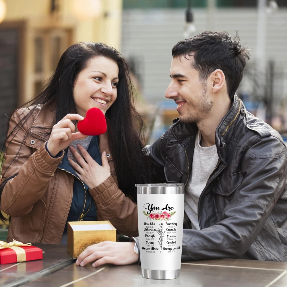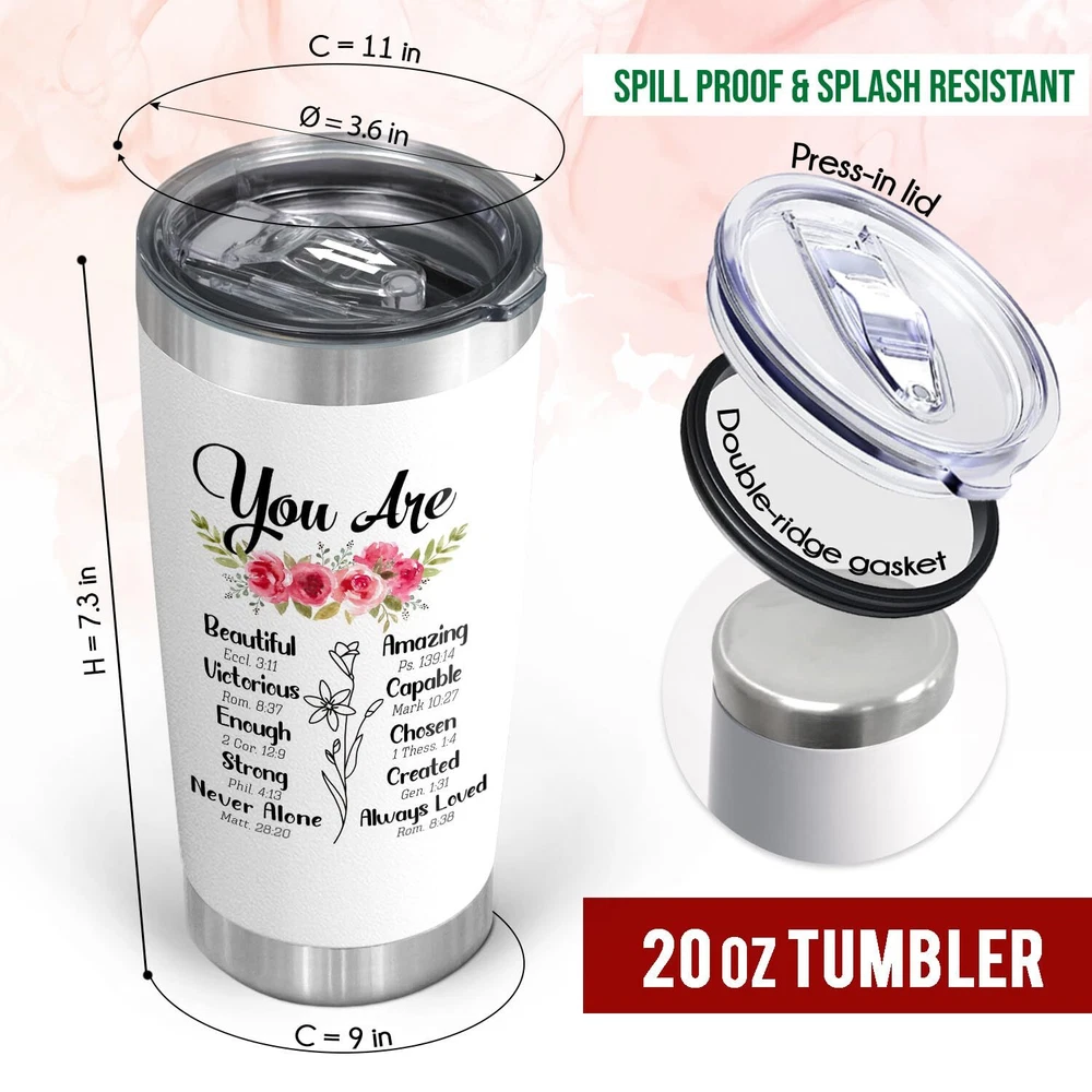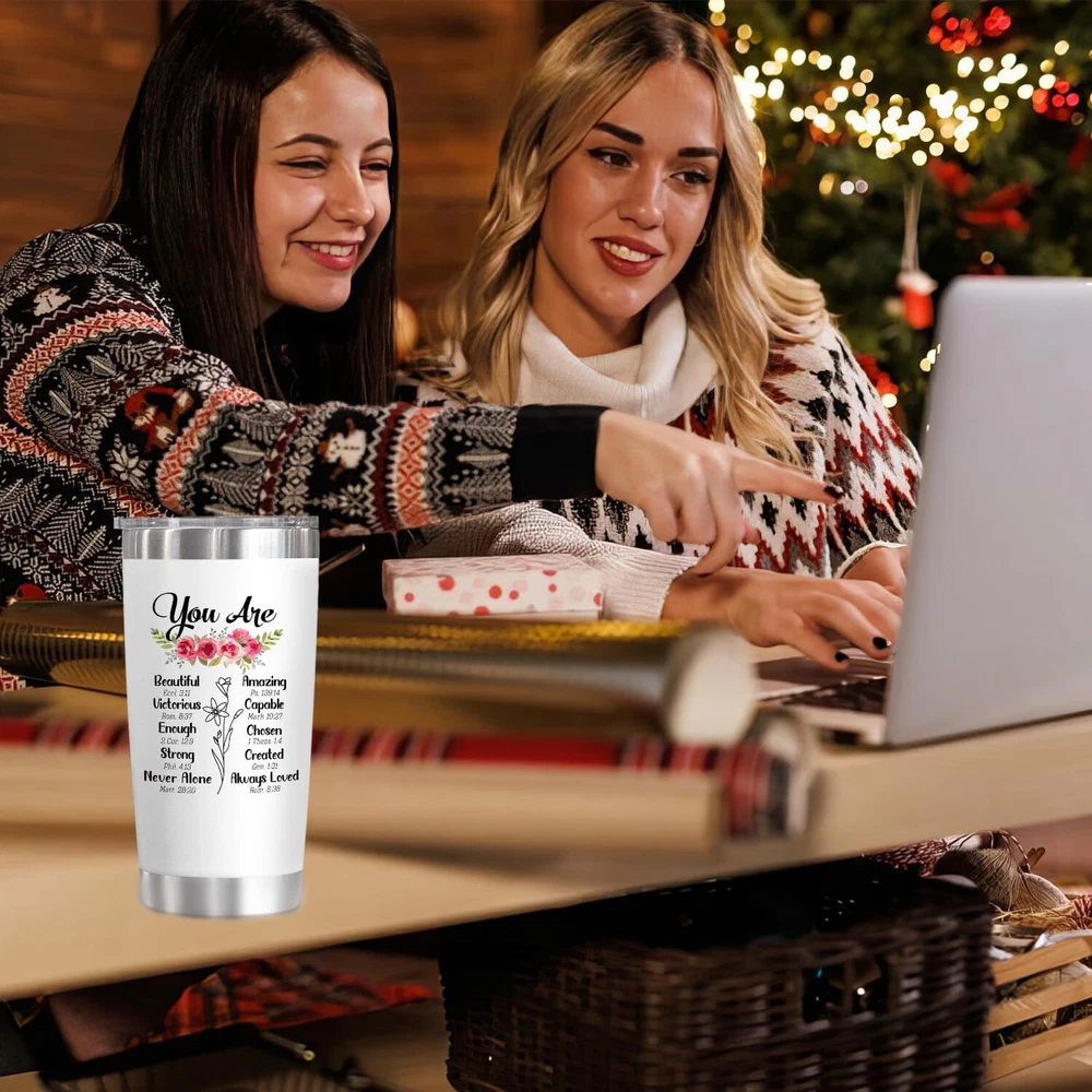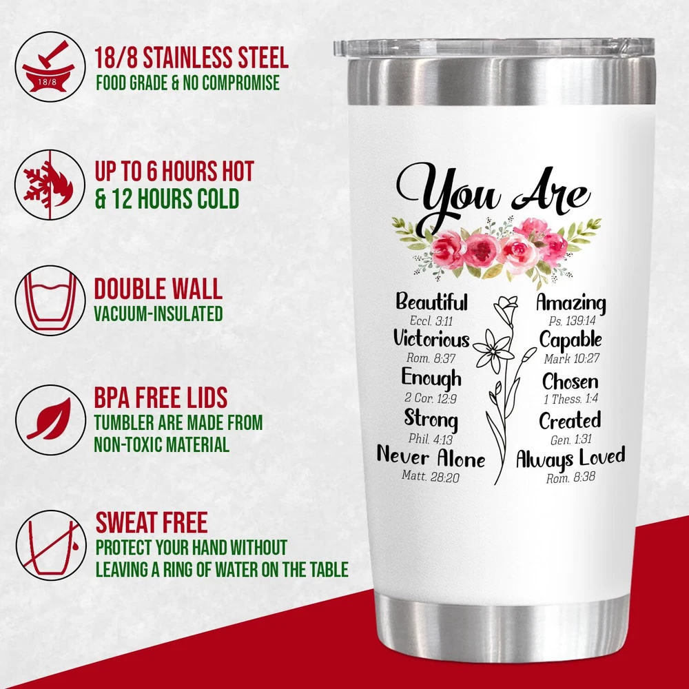 Amazing Gift For All Amazing Christian Women! All women deserve to discover their true identity, freedom, and beauty through the splendor of Christ. Sometimes, just a little gift can bless someone spiritually, physically, mentally, or emotionally. This meaningful Christian gift for women will help you encourage her soul and inspire her to go deeper in faith, and remind her of how much our Heavenly Father cares for us. The Tumbler will put a smile on their face while keeping them hydrated. Remind them to drink 8 glasses per day in a special way. The tumbler comes in a big 20oz size which makes it easy to be refilled and keep track of fluid intake. Whether it's a coffee, tea, or smoothie, this covered tumbler will keep hot beverages hot and cold drinks cool for longer. It's a simple yet thoughtful gift that shows how much you care. Our new scripture-inspired tumblers for women are the perfect accessory for any occasion. Send your love and wishes to your family and friends with this inspirational and healing tumbler. It's filled with your love and care, so it will be with them wherever they go. Each scripture acts as a reminder of God's presence. With its radiant shades and beautiful words, this tumbler is a simple yet meaningful gift for everyone you care about in your life. You can see the sparkle in their eyes, the smile on their faces even tears of joy when they open this elegant gift. More reasons to love this quirky travel tumbler: - Travel-friendly - Double Wall Vacuum Insulation, - BPA Free Help your loved stay hydrated and fabulous. CHRISTIAN GIFTS FOR WOMEN: Motivating her with these unique religious gifts for women. It quote makes itself encouragement gifts for women, Valentines Day gifts for her, girlfriend, wife gift ideas. These women gifts are great for motivating and ideal to be get well soon gifts for women, employee appreciation gifts, Christian gifts for women faith. LOVELY CHRISTIAN TUMBLERS: Motivate your loved ones with these unique religious gifts. It quote makes itself encouragement gifts for women. Also, makes great Valentines gifts for friends, employee appreciation gifts, and get-well-soon, Christian gifts for women's faith. A daily reminder of love and care. THOUGHTFUL GIFTS FOR ANY OCCASION: This tumbler gift will undoubtedly make your beloved lady smile and feel loved every day. It's a great Christmas, Mothers Day, Valentines Day, birthday gift for women, Christian gift, thank you gift for mums, and even a retirement gift. Additionally, this makes a great wife gift, sister gift. BPA-FREE, DURABLE AND TEMPERATURE RETENTION: Crafted with stainless steel, these tumblers are durable, unbreakable, sweatproof, and rust-resistant. Double-wall vacuum insulation can keep your favorite beverages hot for 6+ hours and cold for 12+ hours in a normal temperature environment, which makes our tumbler also great for all kind of drinks FITS IN MOST CUP HOLDERS AND EASY TO CLEAN: Toss your bottle in your bag without worrying about spills, drips, or condensation. Made with discerning tastes, this stainless steel tumbler does not transfer weird smells and tastes so beverages stay fresh and refreshing. This Christian coffee tumbler can be washed in seconds and does not absorb odors.