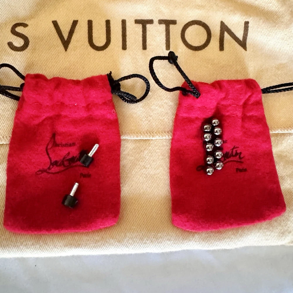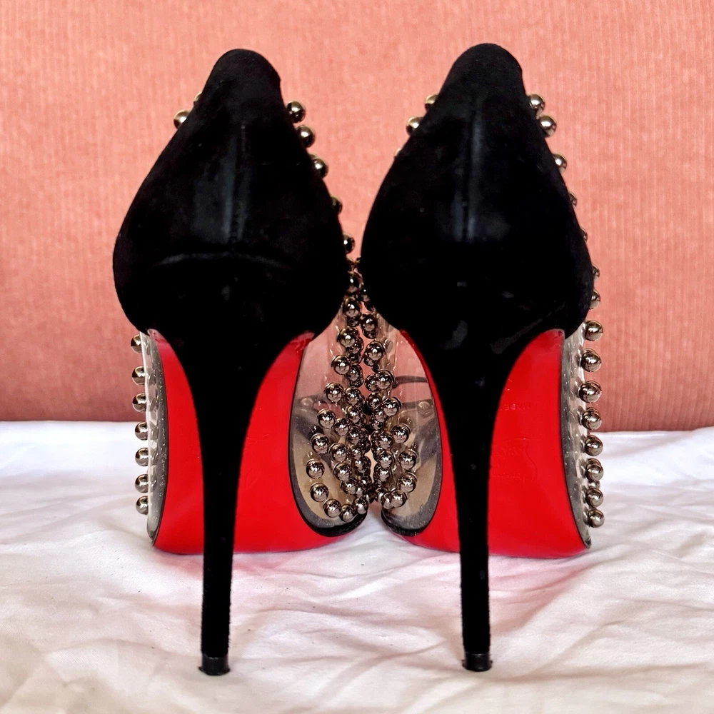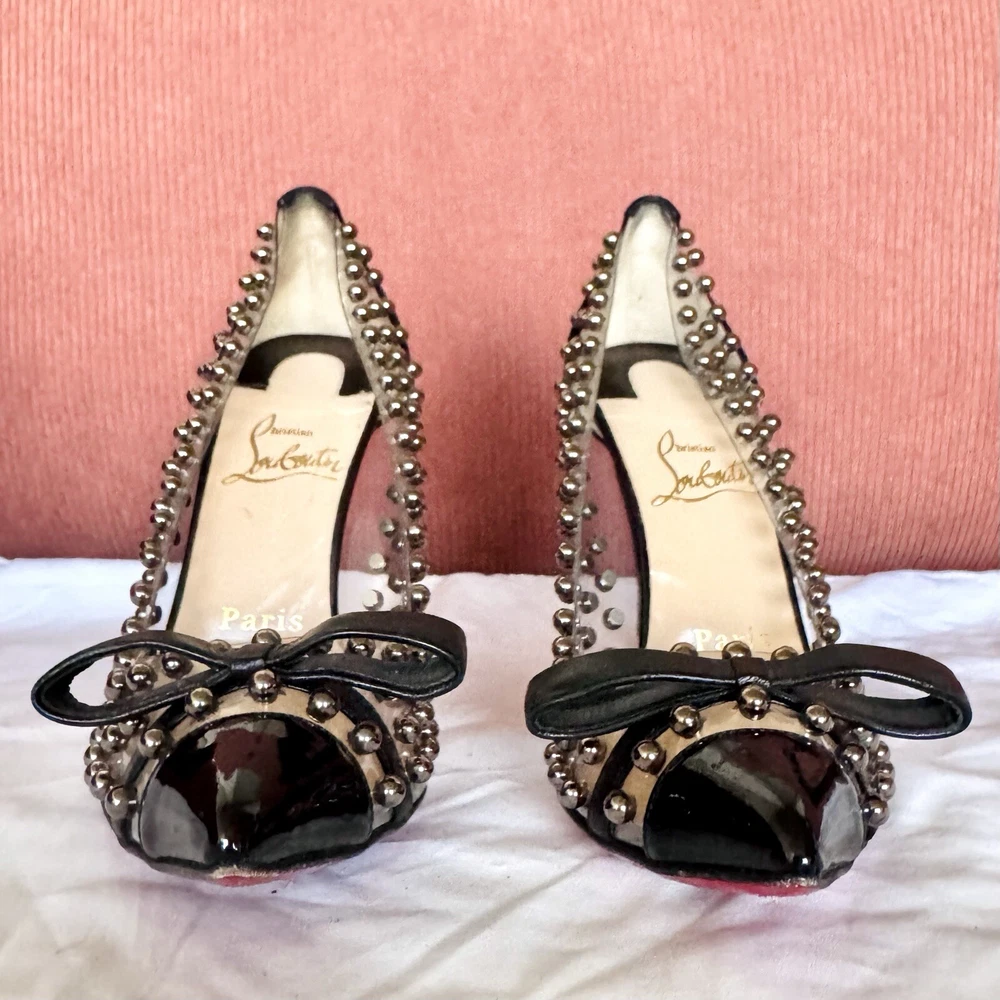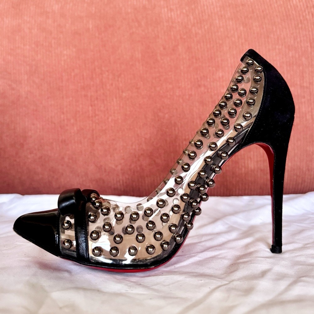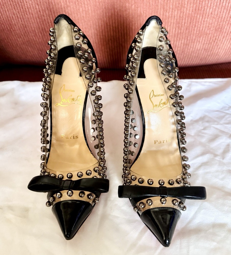 -slip-on point toe pumps with black patent leather cap toes tipped with black leather bows, black suede heels, clear PVC upper studded with polished gunmetal silver pearls, and iconic red bottoms -size EU 35.5 // US 5.5 -great condition; worn 2-3 times- general wear on the bottoms -~4.5” stiletto heel -upper material: PVC, suede, leather, & patent leather -lining material: PVC -insole & sole material: leather -hardware: gunmetal silver -origin: Italy -comes with extra heel tips and pearl studs in cute little red baggies :)
