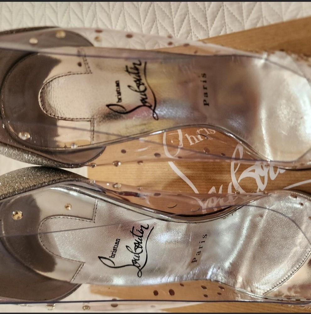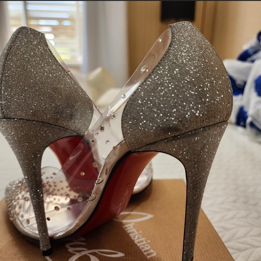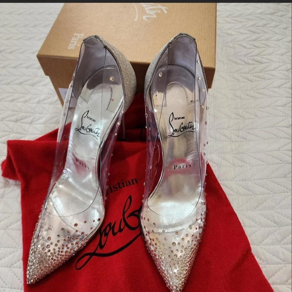 Luxury Alert: Christian Louboutin Degrastrass! Hey, shoe lovers! Get ready to elevate your shoe game with these STUNNING Christian Louboutin Degrastrass PVC high heels! Size 38, these 100mm stilettos feature a dazzling crystal gradient set in transparent PVC, finished with a silver glittery calf leather heel. Worn only once, these shoes have some light scuffing (as shown in photos), but that doesn't detract from their glamour and sophistication. Perfect for making a statement at a formal event or party, these shoes are sure to turn heads! Details: - Brand: Christian Louboutin - Style: Degrastrass - Size: 38 - Material: PVC, silver glittery calf leather - Heel height: 100mm - Condition: Pre-owned, light scuffing - RRP: $1865 AUD Price includes insured delivery and signature required upon collection. #ChristianLouboutin #Degrastrass #LuxuryShoes #PVCHeels #SilverGlitter