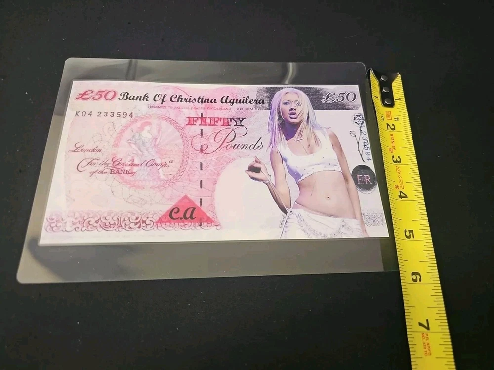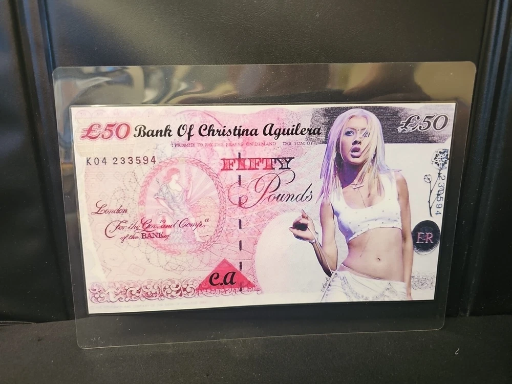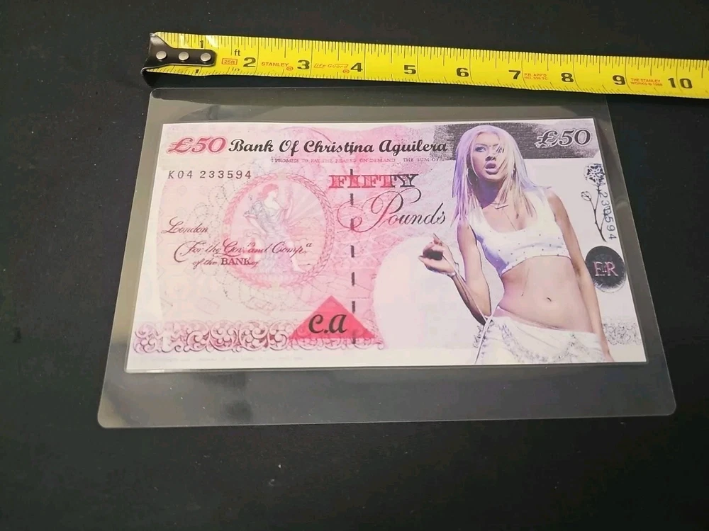 This is a unique and rare item featuring Christina Aguilera's card novelty bank note laminated for added durability. It is a perfect addition to any entertainment memorabilia collection, especially for fans of movies and pop culture. The item is a reproduction of the original and has been carefully crafted to ensure high-quality and authenticity. It is a great way to showcase your love for the artist and the movie industry.