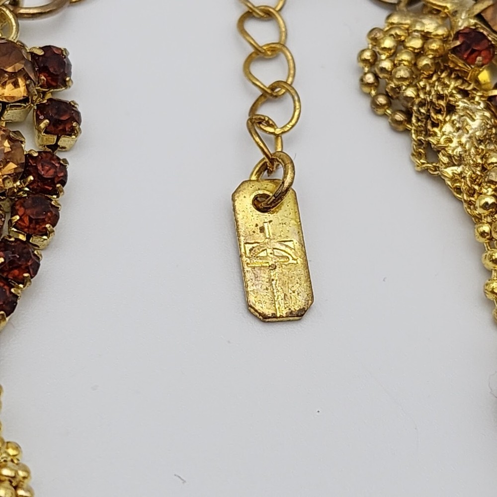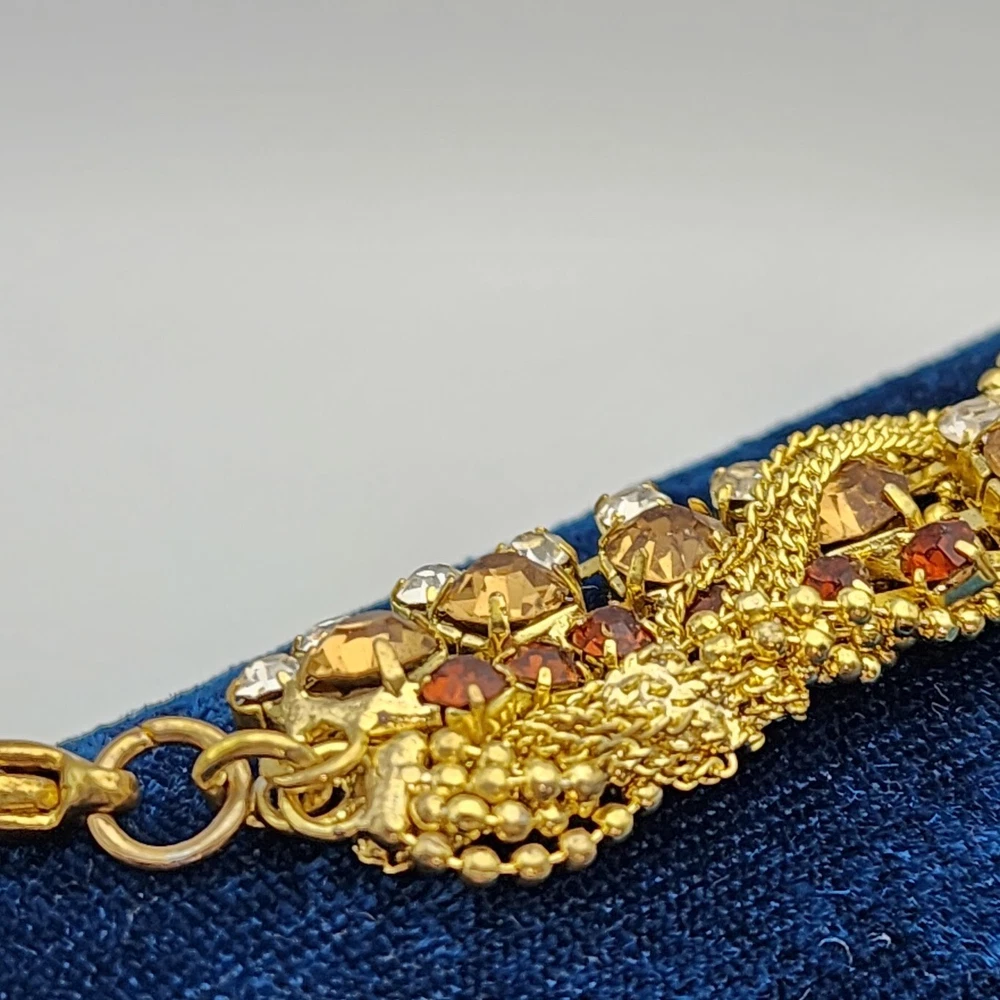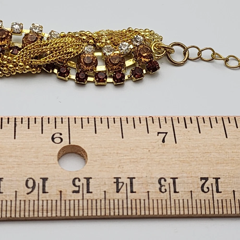 Amber & Clear Crystal Prong Set Rhinestones Gold Tone Twisted Chain by Christina Collection. Very Sparkly And Bright Colored Crystals. Strands On Bracelet Are Braided Together. 7" with 2" Extender.