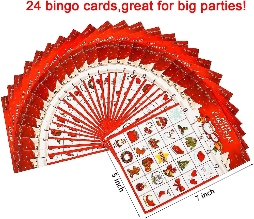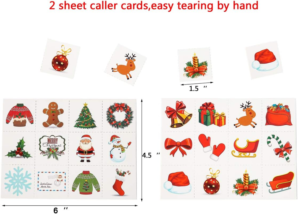 Christmas Games :Include 24 pcs kids bingo player bingo cards, 385 pcs player chips, and 24 pcs caller chips. (easy to tear only by hands or cut by scissors along the hand tearing lines.)Support members to playing ,great family and even mommy time game with your kids. Christmas bingo game is great for Xmas party,classroom party,school party and any events during holiday.Playing bingo game will be a good way for kids to make friends and get families closer. Christmas Crafts - Durable material: Won’t get winkled easily,could be used over and over again. Easy to cut along dotted lines of chip sheets and caller card sheet. Lovely visual and easy understanding rules. Absolutely an awesome gift for kids. The Christmas bingo cards featuring santa clause, deer, xmas tree,stars,candies,snowman and many cute patterns which bring festive atmosphere to your parties. Christmas Crafts for kids:100% free risk purchase:we offer a 90 days money back guarantee service. Product Description If you want to create a funny Christmas party, this Christmas bingo game must be a good choice. HOW TO PLAY? 1. Distribute each player a Christmas bingo card and several player chips. And Caller owns the caller chips. 2. Have each player put a player chip over the free space. 3. The caller would pick one and call out, like santa hat. Then players use the player chips to mark on the player cards. 4. Once a child make a line of 5 pcs ( horizontal, vertical or diagonal, the free space included ), he will yell out BINGO and win the game! Package included: 24 pack Christmas bingo player cards, 11 pack player chips , 2 SHEET Christmas caller chips 24 PACK BINGO CARDS Christmas Player cards measure 5" * 7" Vibrant red colored and unique designed, add festive and funny atmosphere ,bring your Christmas party comes as a hit. So much quantity can meet you needs for big party to great extend. 11 SHEET PLAYER CHIPS CARDS Each one has 35 pcs, totally 385 pcs Player chips measure 0.85" * 0.85" Player chips sheet measures 4.3" * 6.1" Sparkling stars patterns are so cute that favored by kids and adults. 2 SHEET CALLER CARDS Caller card chips measure 1.5"*1.5" Caller cards sheet measure 6" * 4.5" So many unique patterns feature on Christmas element and match patterns on bingo cards perfectly. Dotted line between each chips is so easy to tear without any damage. WIDE APPLICATION Christmas bingo game is available for both kids and adults, great for annual Christmas party ,family gathering and Classroom activities,a good way for kids to make friends and get family member closer.